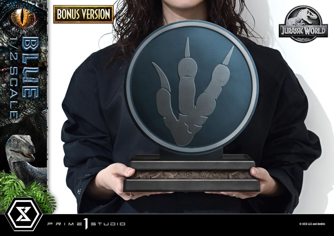 A gaze of intelligence. An iconic stripe along her back.The heroine bridging humans and dinosaurs, in a 1/2 scale monument.From the 2018 film Jurassic World: Fallen Kingdom, the Velociraptor Blue joins the Legacy Museum Collection in an impressive 1/2 scale.As the heroine of a grand story spanning three films, Blue left a lasting impression on audiences. This statue stands as a monument honoring her presence, bringing together the techniques and experience gained from creating her in various forms, all poured into a massive piece measuring nearly 120 cm in length.Her intelligent eyes pursue a sense of depth through a layered structure. From the elongated pupils to subtle light reflections, every detail is carefully rendered to convey her gaze. The scales and wrinkles across her body are sculpted with organic, irregular textures. Paintwork that skillfully balances matte and gloss finishes highlights the contrast between moist and dry skin, while the stripe along her back is crafted with careful attention to saturation and tonal variation to reflect the film’s coloration.The specially designed base, inspired by a forest setting, is rendered with a level of detail made possible by the large scale. Finely sculpted rock surfaces and vegetation evoke the stage of reunion and farewell.The Bonus Version includes a logo stand engraved with a three-toed footprint. Its iconic colors and three toes gripping the ground make it a collector’s item that calls to mind her journey.A symbol of the bond between humans and dinosaurs, rendered in high detail at 1/2 scale. Presented to fans around the world who cherish the Jurassic series.Specifications:Jurassic World: Fallen Kingdom-themed BaseFootprint Logo Stand [Bonus Part]Notice:Prototype samples shown.Product details could be subject to change without further notice.Please note the final product specifications may differ because each product is Handmade.Since the product is still in the development stage, the Size (up to 10%) & Weight (up to 10kg) may be changed during the production stage.© UCS LLC and AmblinDETAILSBrandsPRIME 1 STATUECollectionLegacy Museum CollectionSeriesJurassic SeriesScale1/2 ScaleProduct CodeLMCJWF-07SProduct Size Approx.H:88cm W:117cm D:104cmH:31cm W:25cm D:13cm(Footprint Logo Stand)Carton(Est):3 boxProduct Weight Approx.24.3 kgCarton Size Approx.Carton A [ H 75cm × W 72cm × D 32cm ]Carton B [ H 68cm × W 70cm × D 44cm ]Carton C [ H 103cm × W 34cm × D 30cm ]MaterialsPolystone and other materialsJAN4582647124012