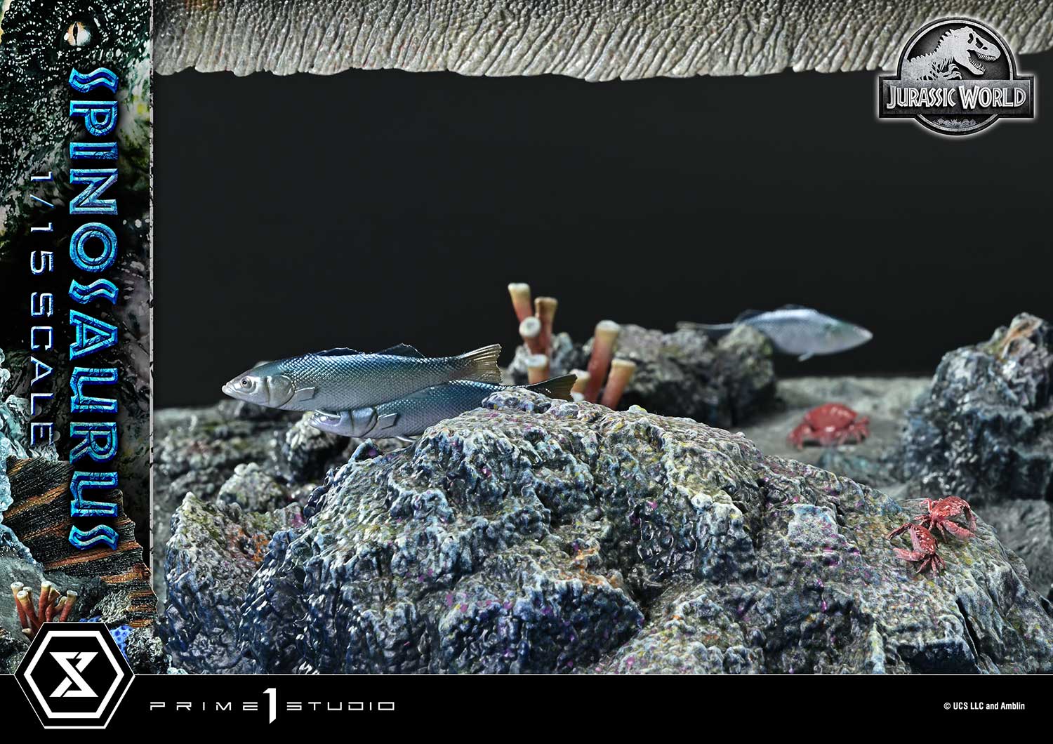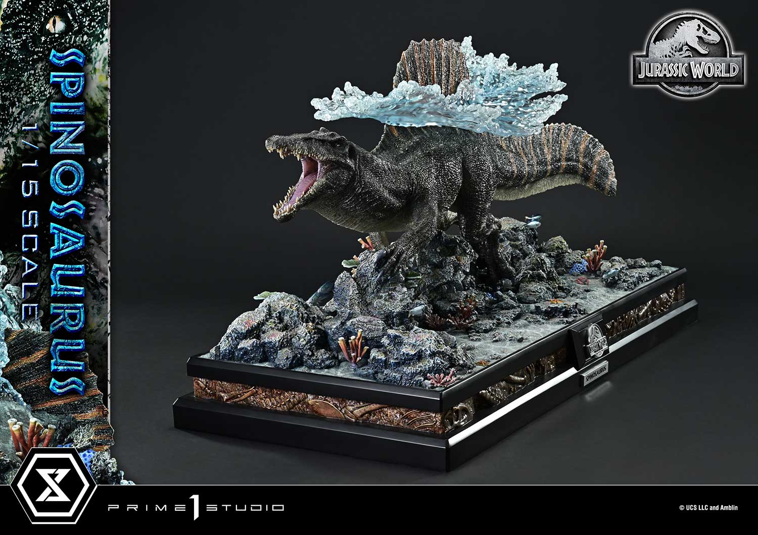 A striped sail at the surface, a massive tail below.The semi‑aquatic carnivorous dinosaur emerges in 1/15 scale.To collect DNA from the three most iconic dinosaurs, an expedition enters a forbidden island in Jurassic World: Rebirth of the Earth. From this blockbuster that ushers in a new chapter for the series, Spinosaurus joins the Legacy Museum Collection.Spinosaurus returns to the screen as a semi aquatic dinosaur. This statue presents its newly reinterpreted form alongside the seascape. Its oar-like tail and four water gripping legs were posed after a close analysis of its on screen appearances. Contact points with the water’s surface and rocky terrain also create a sense of buoyancy, capturing its powerful swim.A moist texture deep inside its wide open jaws. The iconic vertical stripes, tinted with a weathered orange. Webbing developed on the hind feet. Taking full advantage of the immense presence of 1/15 scale, every detail is finished to a high level of definition. Layered colors and textures across the skin create a rich, realistic surface, while scars carved throughout the body evoke a story beyond human understanding.The specially designed base, shimmering with sunlight, is inspired by an untouched sea. Mottled, weathered rocks, fish with a beautiful sheen, and vivid red crabs—each sculpt and color is carefully refined to create a wild scene worthy of a dinosaur’s habitat.The Bonus Version also includes a vignette that captures a chilling ocean moment. A striped sail rises with a burst of spray as it closes in around a boat—experience the fear that Zora and her team felt.Delivered in a commanding size with meticulous three dimensional craftsmanship, this Spinosaurus brings the thrill of the sea to your collection.Specifications:Jurassic World Rebirth-themed BaseOne (1) Vignette Spinosaurus Sail [BONUS PART]Region ExclusiveNotice:Prototype samples shown.Product details could be subject to change without further notice.Please note the final product specifications may differ because each product is Handmade.Since the product is still in the development stage, the Size (up to 10%) & Weight (up to 10kg) may be changed during the production stage.© UCS LLC and AmblinDETAILSBrandsPRIME 1 STATUECollectionLegacy Museum CollectionSeriesJurassic SeriesScale1/15 ScaleProduct CodeLMCJWF-06SProduct Size Approx.H:39cm W:74cm D:34cmH:20cm W:34cm D:16cm(Vignette Spinosaurus Sail)Carton(Est):1 boxProduct Weight Approx.13.18 kgCarton Size Approx.Carton A [ H 98cm × W 46cm × D 45.5cm ]MaterialsPolystone and other materialsJAN4582647124258