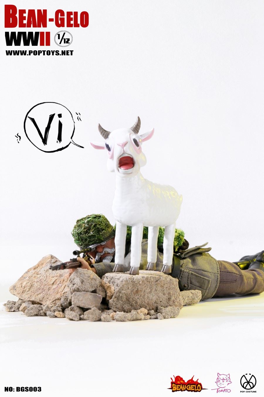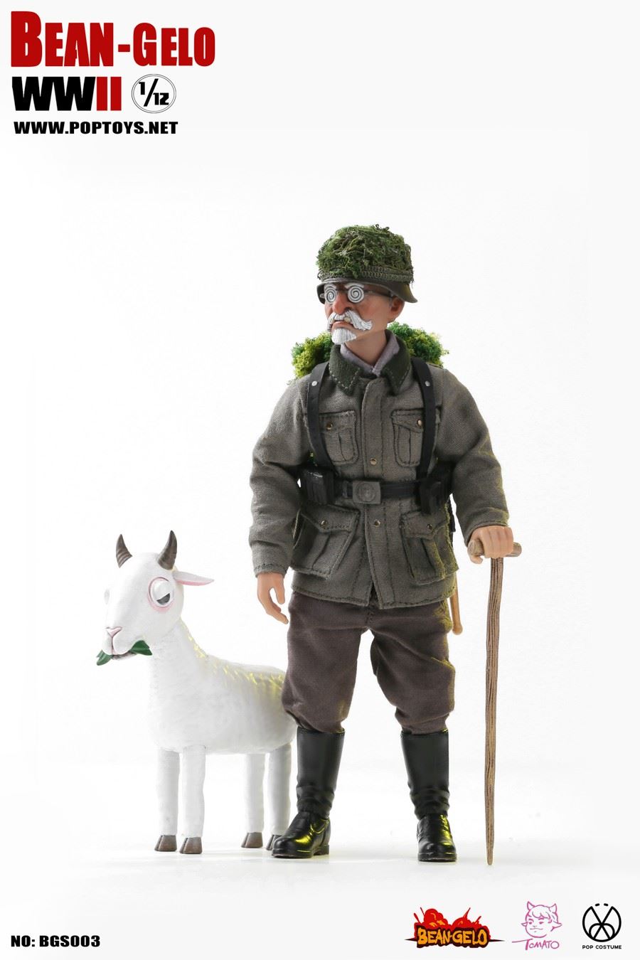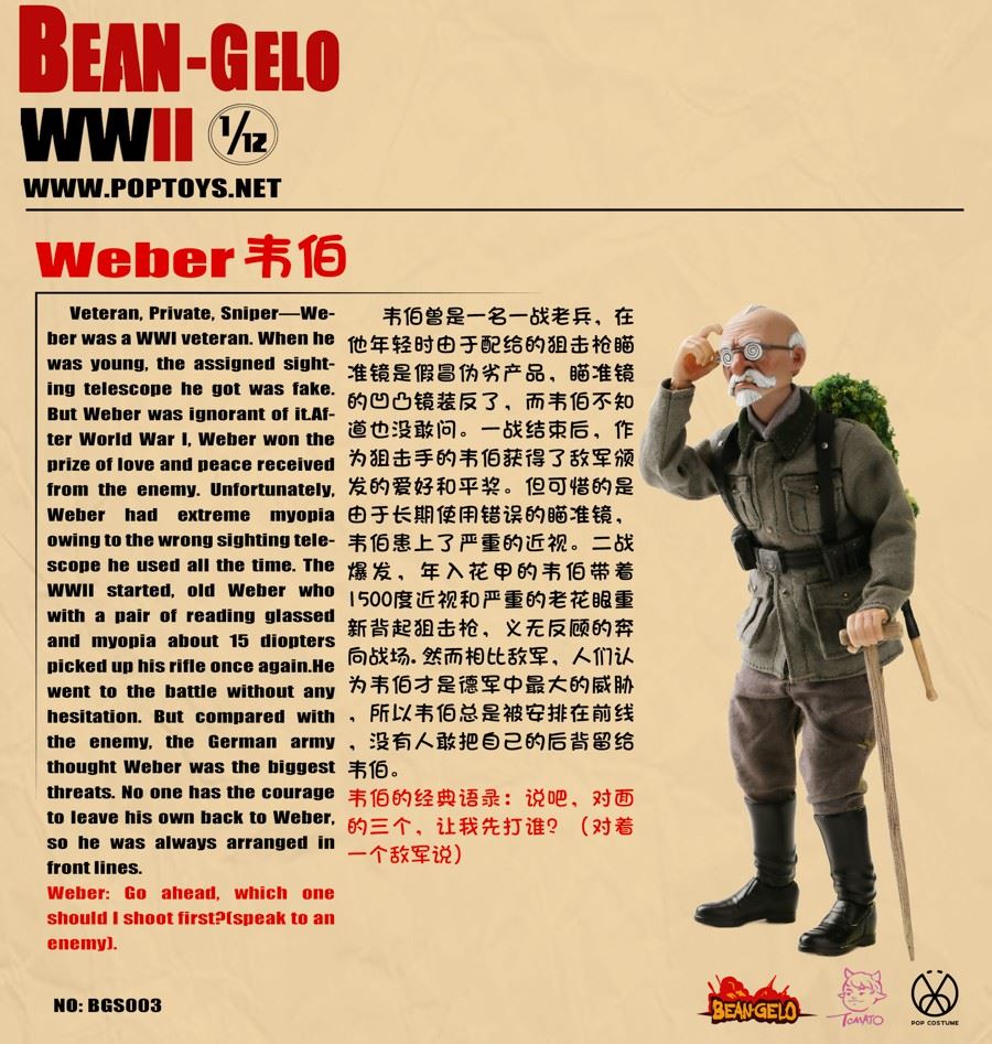 POPTOYS 1/12 Bean Gelo Series BGS003 Sniper Geezer--WeberBAR CODE: 06971281620284List:Head*11/12th body*1Hands*6Shirt*1Combat uniform*1Pants*1 pairBoots*1 pairLeather belt*1Ammunition pouch*2Y-belt*1Food bag*1Lunch box*1Water bag*1Blanket*1Shovel*1Helmet*198K rifle*1Marching package*1Walking Stick*1Sheep*1Figure Stand*1