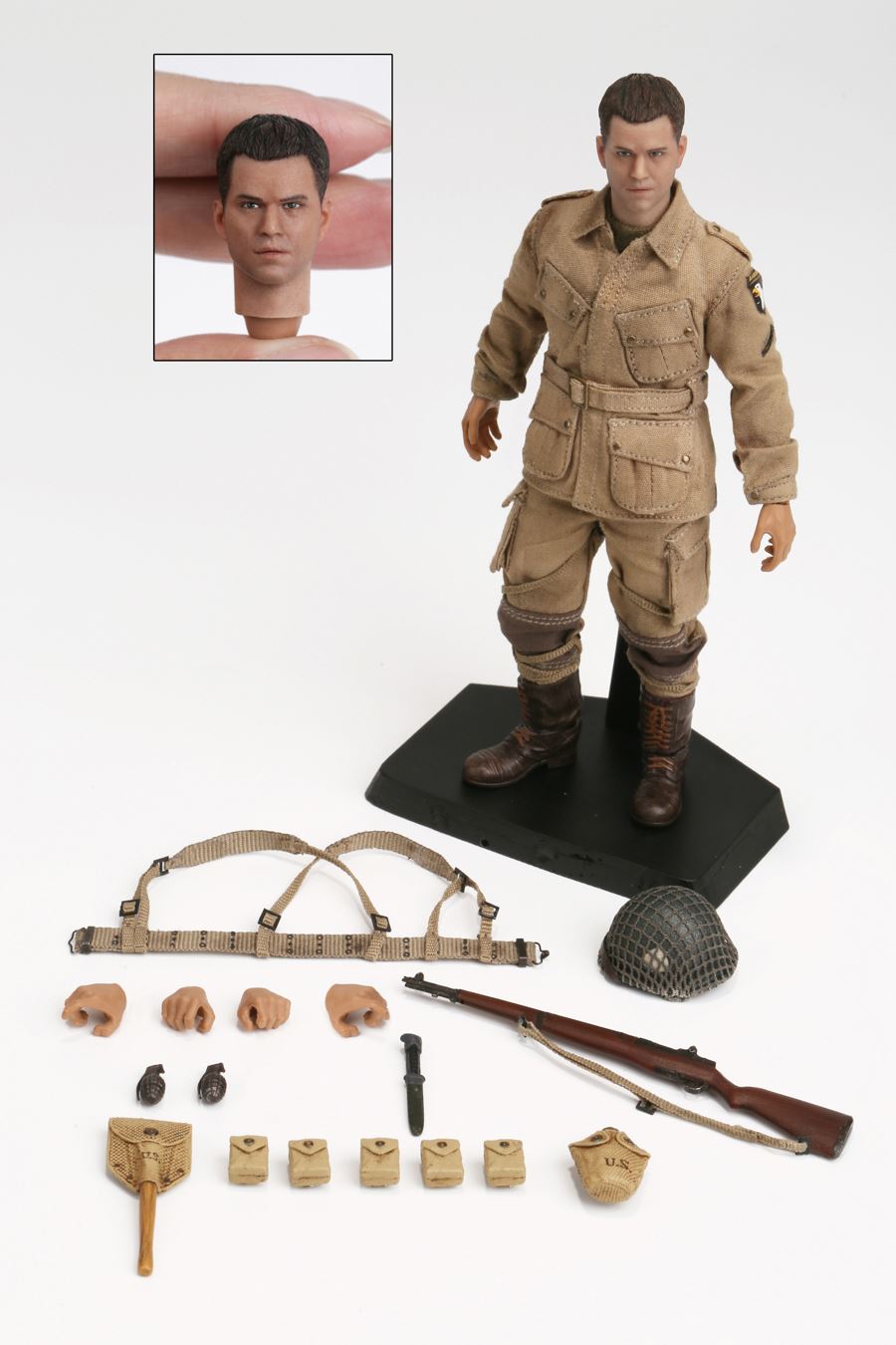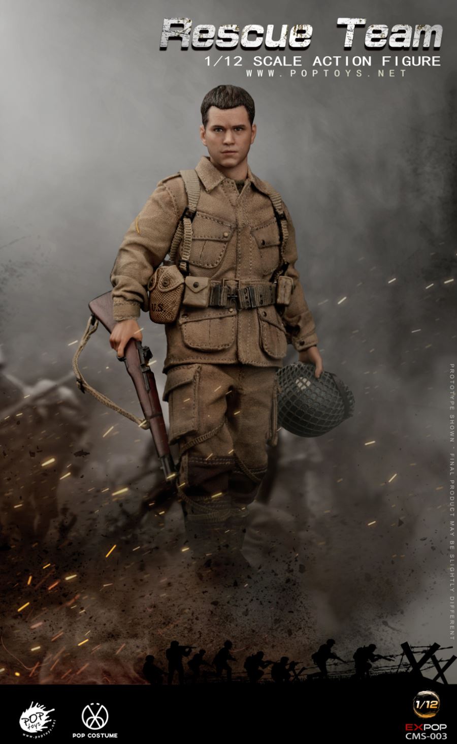 POPTOYS 1/12 CMS003 WWII US Rescue Squad ParatrooperBAR CODE: 6971281620086List:Head*11/12th body*1Hands*3 pairsShort-sleeved shirt*1Paratroop jacket*1Paratroop pants*1 pairParatroop boots*1 pairM1C Paratroop helmet*1M1 Garand*1Grenades*2Water jug*1Belt*1X—type straps for equipments*1Small cartridge bag*5Tri-fold shovel*1Figure stand*1
