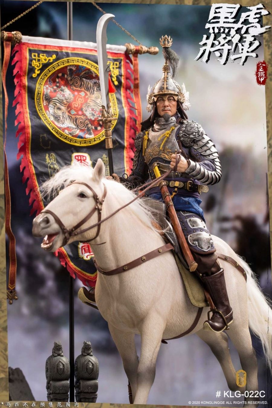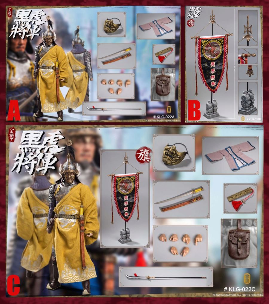 KLG : 1/6 Black Tiger General Liu Ting(#KLG-R022A/B/C)A:1. Head Sculpt *12. Ferrite *13. Hand Shape *34. Underwear Shirt *15. Coat + Pants *16. Boot(leather)*17. Cotton armor + iron armor suit (divided into upper armor and side cuish of which the iron armor is at the thickness of 0.5mm) *18. A set of arm-armor (made of 25 pieces of four kinds of arm-armor with different sizes and Swallow shoulder beast metal for disassembly pattern) *19. Face mask (thickness of about 0.5mm) *110. Helmet (the body is made of s oft glue in hard texture and the tip of helmet is the metal) *111. One set of neck protection (plus three stamped pieces of neck protection) *112. Minghekou Dragon Sword (metal body as well as additional abs plastic) *113. Ridge-raising Dragon Swallow Sword + caudal vertebra of sword *114. Loincloth*115. Leather Belt *116. Frock*117. Priest Frock *118. Waist Tag Joker *119. Waist Pack (leather)*1---------------------------------------------------------------------------------------------------------------------------B:Flag + Base (superior environmental protection resin) *1-------------------------------------------------------------------------------------------------C:1. Head Sculpt *12. Ferrite *13. Hand Shape *34. Underwear Shirt *15. Coat + Pants *16. Boot(leather)*17. Cotton armor + iron armor suit (divided into upper armor and side cuish of which the iron armor is at the thickness of 0.5mm) *18. A set of arm-armor (made of 25 pieces of four kinds of arm-armor with different sizes and Swallow shoulder beast metal for disassembly pattern) *19. Face mask (thickness of about 0.5mm) *110. Helmet (the body is made of s oft glue in hard texture and the tip of helmet is the metal) *111. One set of neck protection (plus three stamped pieces of neck protection) *112. Minghekou Dragon Sword (metal body as well as additional abs plastic) *113. Ridge-raising Dragon Swallow Sword + caudal vertebra of sword *114. Loincloth*115. Leather Belt *116. Frock*117. Priest Frock *118. Waist Tag Joker *119. Waist Pack (leather)*120. Flag + Base (superior environmental protection resin) *1