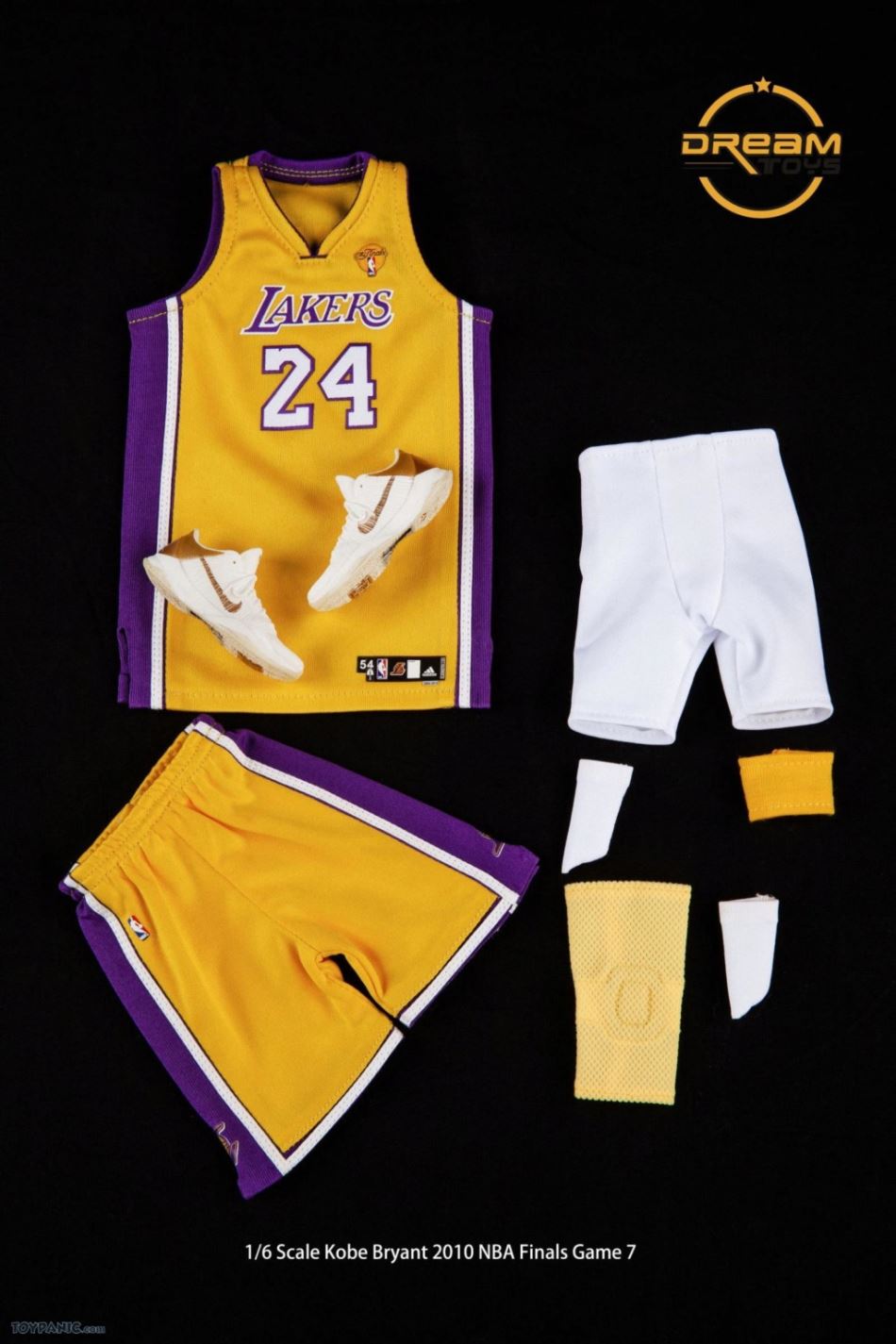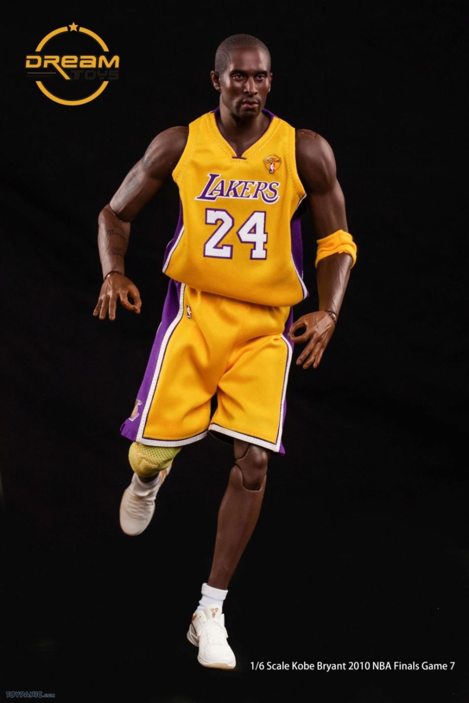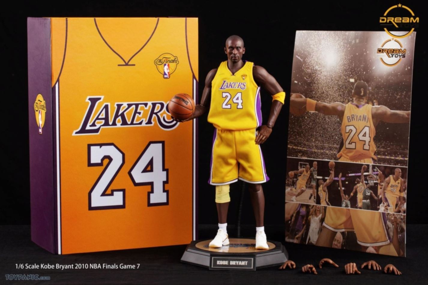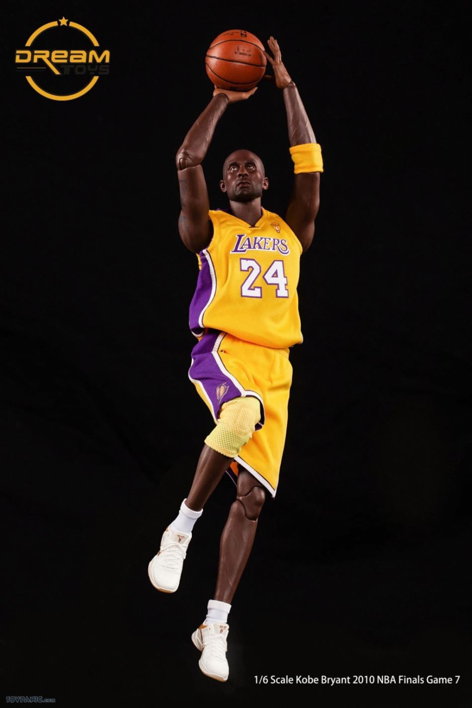 1/6 Kobe Bryant 2010 NBA Finals Game 7 From DREAMTOYS Code: KB2010Accessories include:1) Kobe Bryant 1/6 high-reduction headsculpt2) Exclusive 1/6 element body3) 8 Kobe Bryant special hand types (including 2 magnet hand types)4) 1 set of Yellow Lakers jerseys in the 2010 Final(Accessories include a pair of yellow elbow pads / yellow knee pads / white shorts / white socks)5) 1/6 Kobe ZOOM KOBE 5 platinum stage shoes 1 pair6) 1/6 scale 1 Spalding basketball7 1/6 Super Mobile 2010 Finals Kobe exclusive light stand platform.