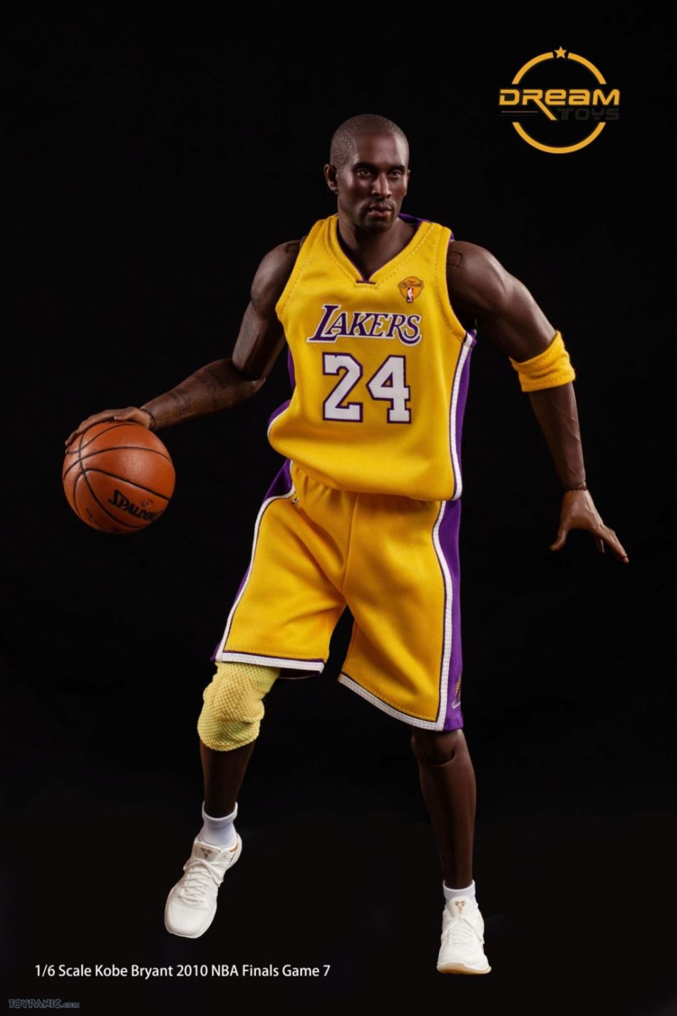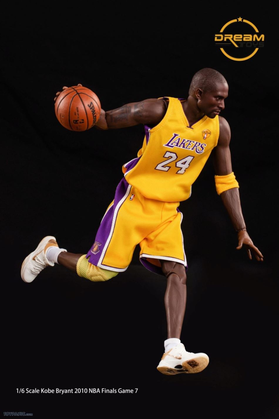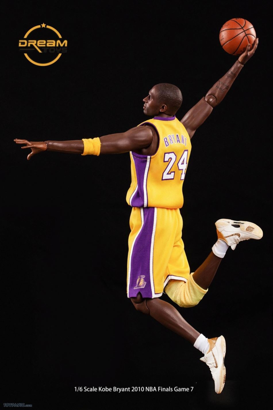1/6 Kobe Bryant 2010 NBA Finals Game 7 From DREAMTOYS Code: KB2010Accessories include:1) Kobe Bryant 1/6 high-reduction headsculpt2) Exclusive 1/6 element body3) 8 Kobe Bryant special hand types (including 2 magnet hand types)4) 1 set of Yellow Lakers jerseys in the 2010 Final(Accessories include a pair of yellow elbow pads / yellow knee pads / white shorts / white socks)5) 1/6 Kobe ZOOM KOBE 5 platinum stage shoes 1 pair6) 1/6 scale 1 Spalding basketball7 1/6 Super Mobile 2010 Finals Kobe exclusive light stand platform.