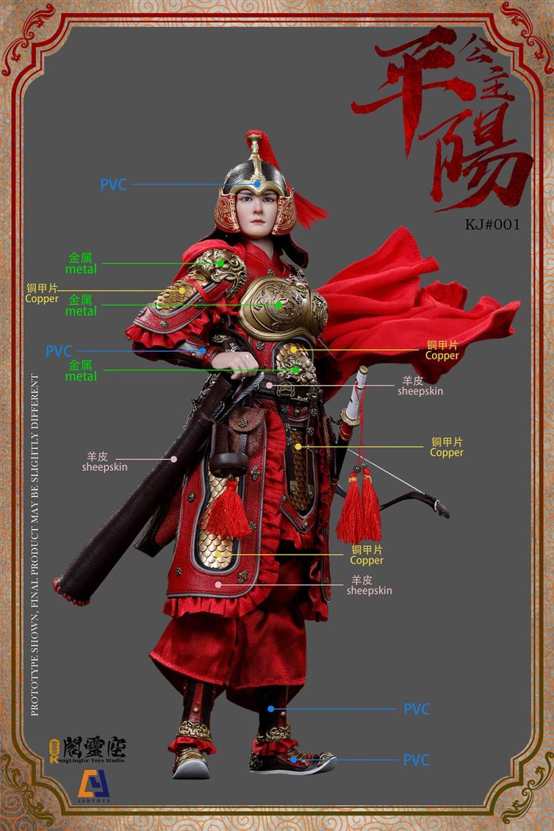 Kong Libg Ge X JSD toys New Product: 1/6 Princess Pingyang-Li Xiuning (KJ #001A/B)B:1. Head carving x12. voxel x13. Hand Type (Right) x34. Underwear+Pants x15. Civilian suit (coat/silver coat/brown pants) x16. bun x17. Crown x18. Metal Armor Lamb Bag Side x19. Helmet x110. Wrist protector (right) x111. Leg protection (right) x112. Tundish x113. Shoulder Swallower x214. Waist protection x115. Belt Sheepskin x116. Handmade leather boots lambskin (double) x117. Long weapon x118. Waist knife x119. Shoe x120. Bow x121. Arrow x522. Bow bag lambskin x123. Bucket Sheepskin x124. Protective knife x1Closing time: July 18, 2020Estimated Delivery Time: Fourth Quarter 2020