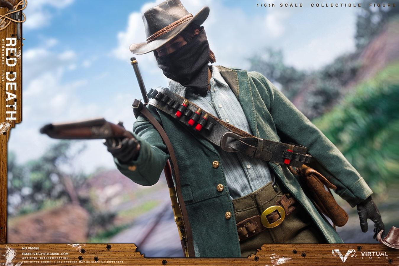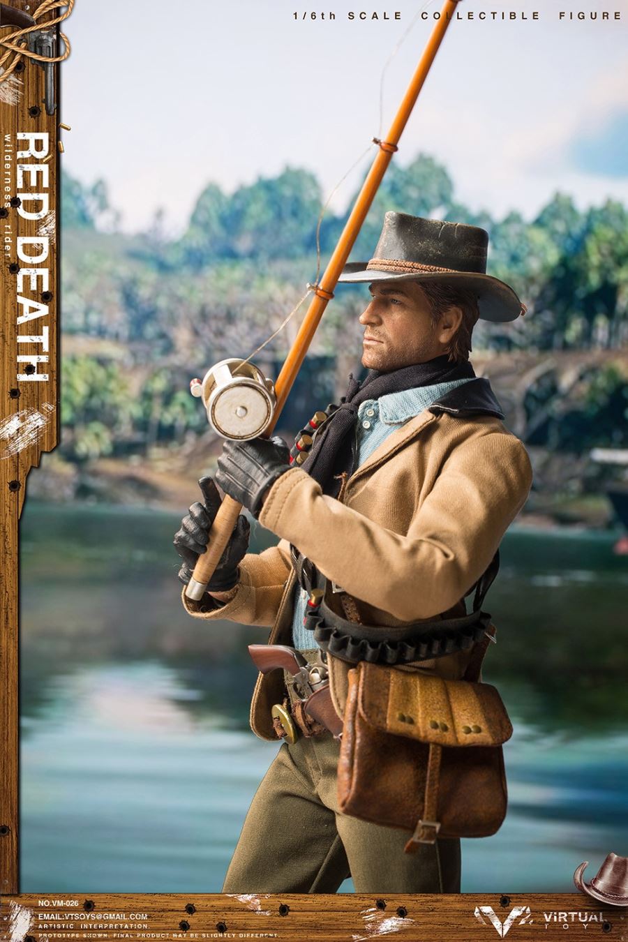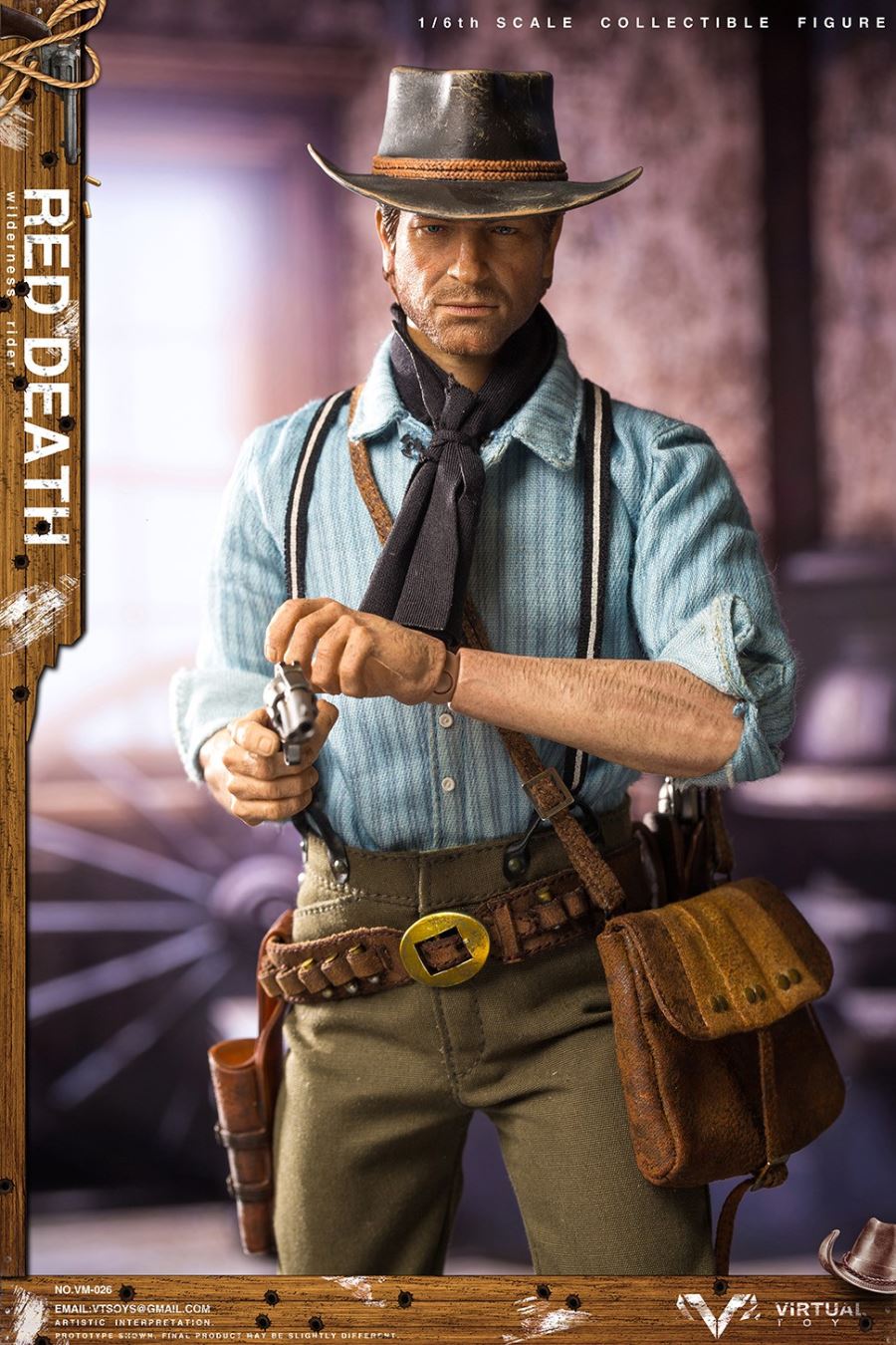 RED DEATH – Wilderness RiderVTS TOYS : 1/6 Posable Collectible Figure series – Wilderness Rider (VM-026)Wild West, Unruly Cowboys: Wilderness Rider, the latest masterpiece of VTSTOYS.Consistent & quality production, pioneering era costumes & props,carefully crafted details: Wilderness Cowboy takes you back, to rediscover the tragic epic Western.Main figure:Super realistic head sculpt x2Posable body (realistic forearm)Gun-holding hand (glove)Fist (glove)Relax hand (glove)Bare handsCostume accessories:Cowboy hatCoonskin capScarfBandanaWinter coatYellow jacketFormal outfitBlue shirtPantsSuspenderCrossbody bagGun beltBandolierCowboy boots Weapon accessories:Revolver x2Revolver Holster x2Revolver bullet x5Winchester rifleSpencer repeating rifleSawn-off shotgunShotgun bullet x5ExplosivesHunting knifeKnife sheathHunting bowArrowOther accessories:Fishing rodFishDetonatorJournalWine bottleCigaretteTobacco PackBanBag1:6 stand