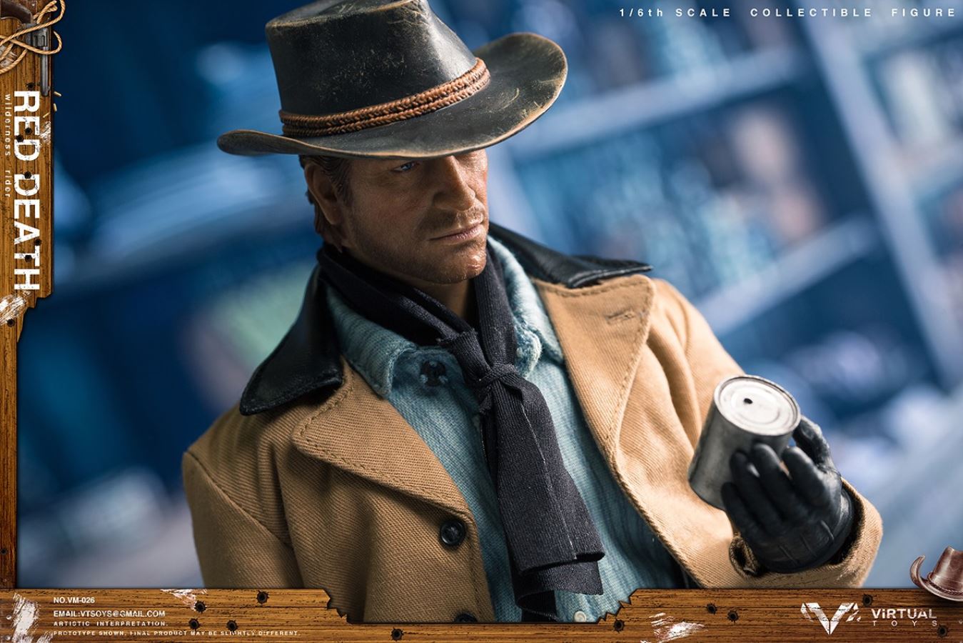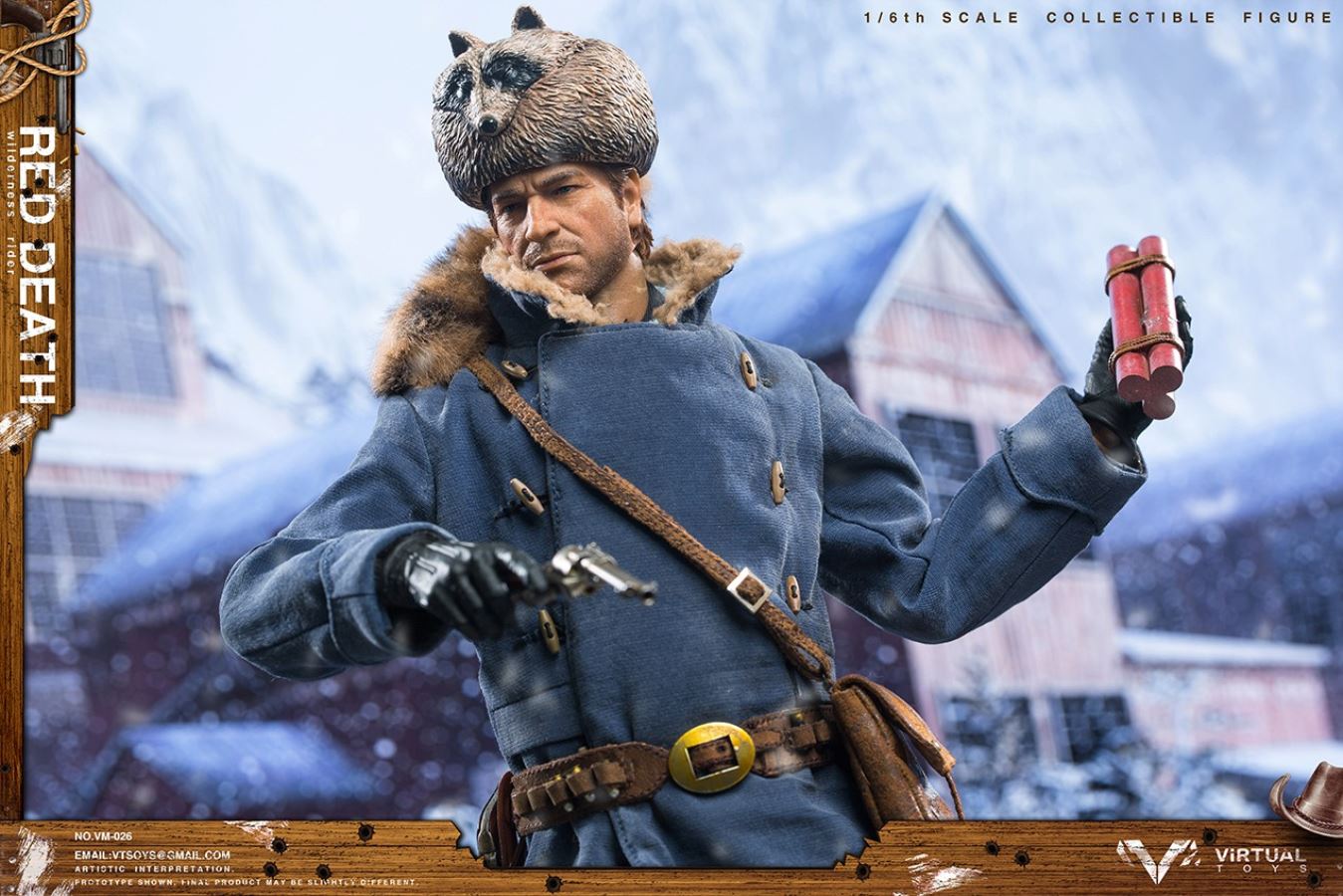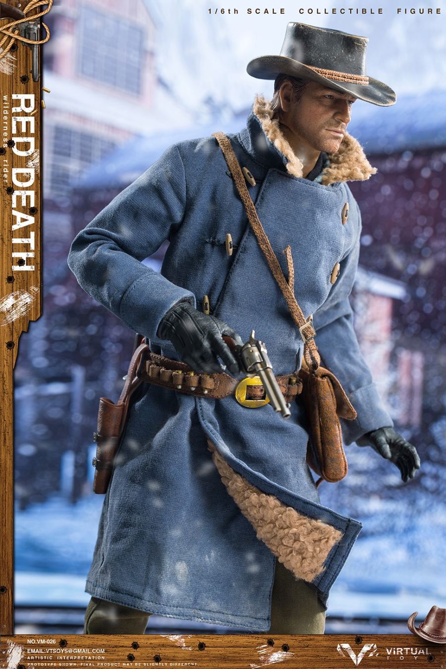 RED DEATH – Wilderness RiderVTS TOYS : 1/6 Posable Collectible Figure series – Wilderness Rider (VM-026)Wild West, Unruly Cowboys: Wilderness Rider, the latest masterpiece of VTSTOYS.Consistent & quality production, pioneering era costumes & props,carefully crafted details: Wilderness Cowboy takes you back, to rediscover the tragic epic Western.Main figure:Super realistic head sculpt x2Posable body (realistic forearm)Gun-holding hand (glove)Fist (glove)Relax hand (glove)Bare handsCostume accessories:Cowboy hatCoonskin capScarfBandanaWinter coatYellow jacketFormal outfitBlue shirtPantsSuspenderCrossbody bagGun beltBandolierCowboy boots Weapon accessories:Revolver x2Revolver Holster x2Revolver bullet x5Winchester rifleSpencer repeating rifleSawn-off shotgunShotgun bullet x5ExplosivesHunting knifeKnife sheathHunting bowArrowOther accessories:Fishing rodFishDetonatorJournalWine bottleCigaretteTobacco PackBanBag1:6 stand