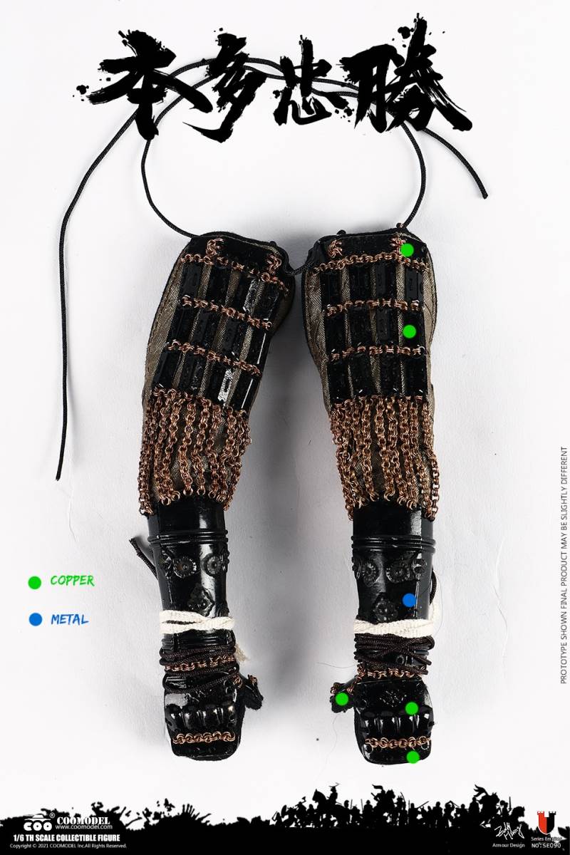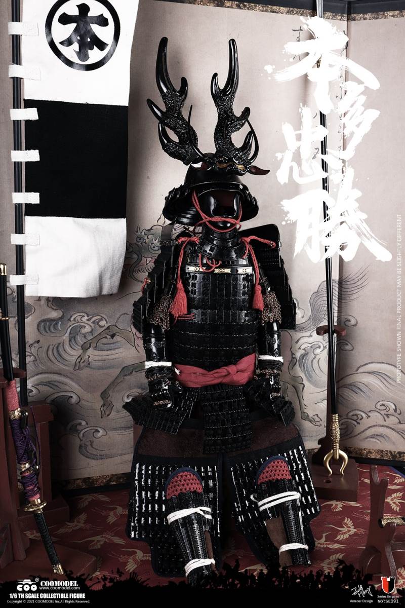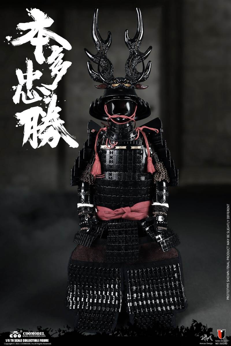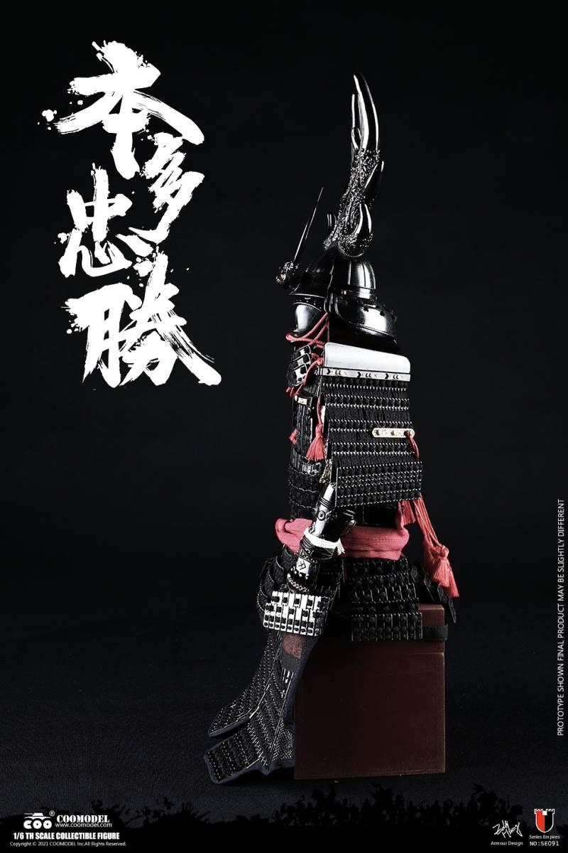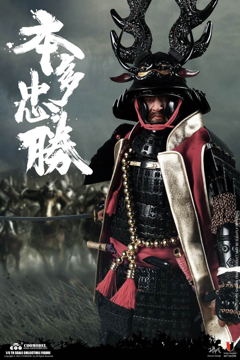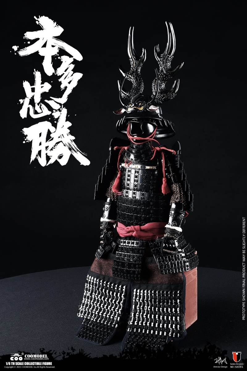 COOMODEL NO.SE090 1/6 SERIES OF EMPIRES - HONDA TADAKATSU, THE STRONGEST WARRIOR (STANDARD VER)BARCODE: 971242121409* The suit of armor is built of manually-attched sheets, 100% metal-made, incuding copper parts* The edges of swords are made by stainless steel* Pictures shown are of protoypes, from which adjustments may be taken in final productsThe 1/6th scale Honda Tadakatsu Collectible Figure specially features:- One (1) realistic head sculpture of Honda Tadakatsu- One (1) super action body- Six (6) Pieces of Interchangeable PalmsCostumes:- One (1) white shirt- One (1) red coat- One (1) white band- One (1) pair of black trousers with white pattern- One (1) pair of black leg bindingsArmors:- One (1) black helmet with antler heraldry - One (1) black neck armor- One (1) pair of black shoulder armors- One (1) pair of black vambraces- One (1) suit of black upper-body armor- One (1) pair of black cuishes- One (1) pair of black jambeaus- One (1) pair of black sandals- One (1) red armor tie- One (1) red war vestWeapons:- One (1) katana (long sword)- One (1) black katana scabbard- One (1) wakizashi (short sword)- One (1) black wakizashi scabbard- One (1) spearAccessories:- One (1) string of gold beads- One (1) black figure stand======================COOMODEL NO.SE091 1/6 SERIES OF EMPIRES - HONDA TADAKATSU, THE STRONGEST WARRIOR (EXCLUSIVE VER)BARCODE: 6971242121416* The suit of armor is built of manually-attched sheets, 100% metal-made, incuding copper parts* The edges of swords are made by stainless steel* Pictures shown are of protoypes, from which adjustments may be taken in final productsThe 1/6th scale Honda Tadakatsu Collectible Figure specially features:- Two (2) realistic head sculpture of Honda Tadakatsu- One (1) super action body- Six (6) Pieces of Interchangeable PalmsCostumes:- One (1) white shirt- One (1) red coat- One (1) white band- One (1) pair of black trousers with white pattern- One (1) pair of black leg bindingsArmors:- One (1) black helmet with antler heraldry - One (1) black neck armor- One (1) pair of black shoulder armors- One (1) pair of black vambraces- One (1) suit of black upper-body armor- One (1) pair of black cuishes- One (1) pair of black jambeaus- One (1) pair of black sandals- One (1) red armor tie- One (1) red war vestWeapons:- One (1) katana (long sword)- One (1) black katana scabbard- One (1) wakizashi (short sword)- One (1) black wakizashi scabbard- One (1) spearAccessories:- One (1) string of gold beads- One (1) black figure standDisplay Parts:- One (1) red tatami display base- One (1) kirin painting screen- One (1) armor box- One (1) armor stand- One (1) horizonal weapon stand- Two (2) vertical weapon stands- One (1) black and white flag- One (1) flag stand