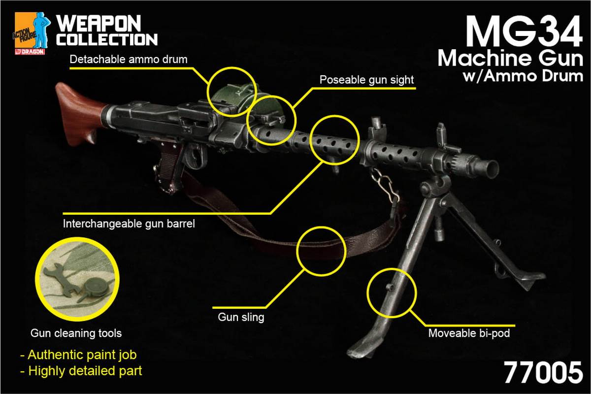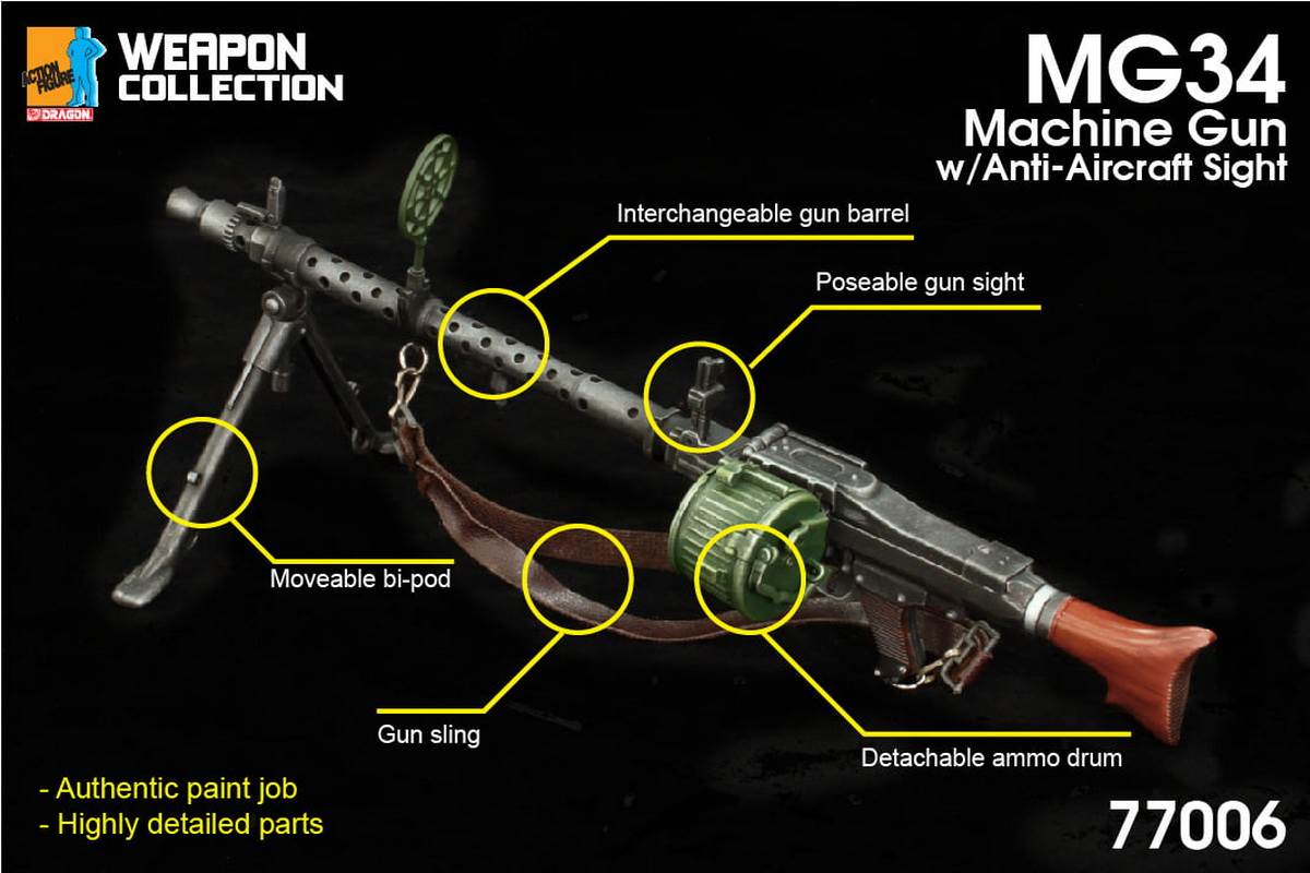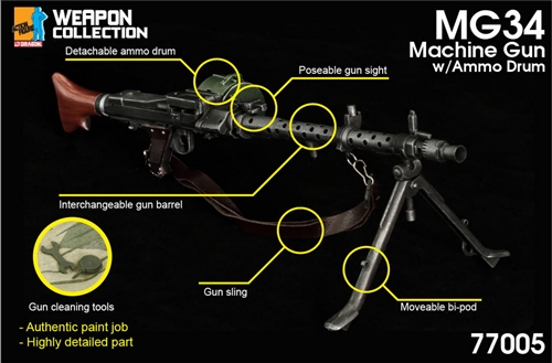New Announcement: 1/6 Weapon Collection new products!1. #77005-MG34 Machine Gun with Ammo Drum2. #77006-MG34 Machine Gun with Anti-Aircraft Sight
