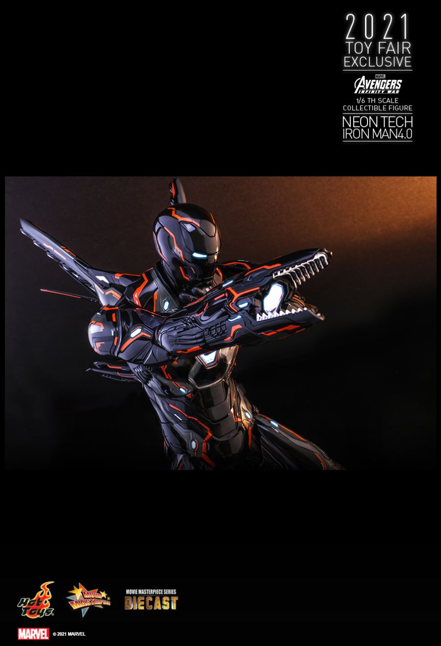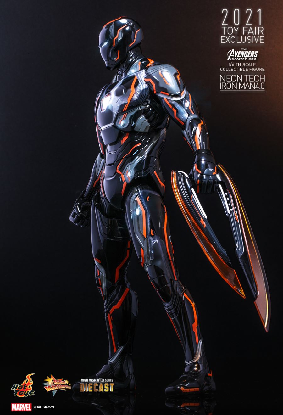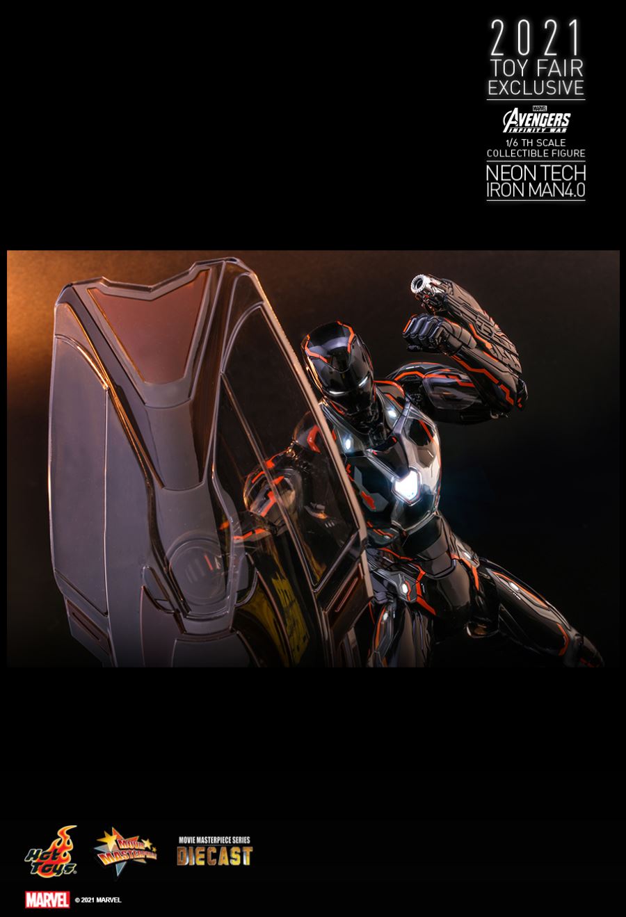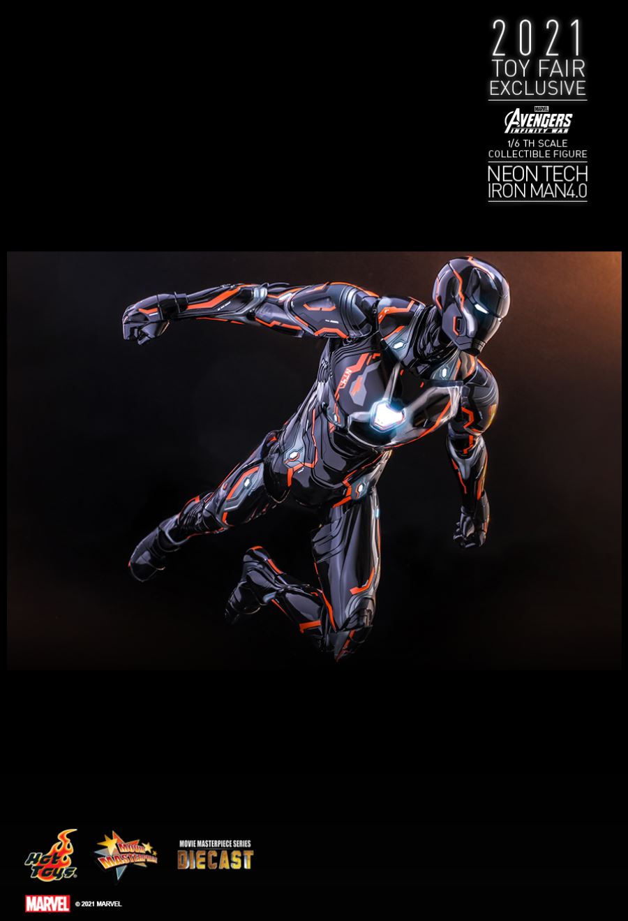 AVENGERS: INFINITY WARNEON TECH IRON MAN 4.01/6TH SCALE COLLECTIBLE FIGURETaking design inspiration toward the futuristic and aerodynamic aesthetic, Hot Toys’ Neon Tech series has skillfully recreated the signature and breathtaking armors appeared in MCU as stunning collectibles, and merged them with glowing neon works. Today, Hot Toys is excited to present the exciting 1/6th scale Neon Tech Iron Man 4.0 collectible figure as Hot Toys 2021 Toy Fair Exclusive item!Stands approximately 32cm tall, the brand-new diecast figure inspired by the appearance of Iron Man Mark L in Avengers: Infinity War features a streamlined suit of armors with asymmetrical patterns; beautifully polished in shiny black, grey and bright neon orange color with luminous reflective patterns appearing under specialized LED light, also a selection of fine armor parts composed in translucent matte material enhancing the overall appearance; LED light-up functions scattered throughout the armor; Iron Man’s signature weapons including interchangeable LED light-up Nano Repulsor Cannon, Hand Cannon, Nano Boosters, Energy Blade, Holo Shield, and specially designed figure stand.Prepare space for this truly stunning figure among your special Marvel collection!SPECIFICATIONSPRODUCT CODEMMS597D39PRODUCT NAMENEON TECH IRON MAN 4.0HEIGHTAPPROXIMATELY 32 CM TALLPOINTS OF ARTICULATIONS30SPECIAL FEATURESSHINY BLACK, GREY AND ORANGE COLORED PAINTING ON THE SLEEK AND STREAMLINE IRON MAN ARMOR DESIGNARTISTSHEAD SCULPTED BY N/AHEAD PAINTED BY N/AHEAD ART DIRECTED BY N/AThe 1/6th scale Neon Tech Iron Man 4.0 Collectible Figure specially features:- Authentic and detailed likeness of Iron Man Mark L armor in Avengers: Infinity War- A helmeted head with LED light-up function (white light, battery operated)- Approximately 32 cm tall- Over 30 points of articulations- Contains diecast material- Special features on armor:- Shiny black, grey and orange colored painting on the sleek and streamline Iron Man armor design- Translucent grey armor parts for mask, arms, and legs- 21 LED light-up points throughout parts of the armor (white light, battery operated)- One (1) pair of articulated air flaps at back of the armor- One (1) detachable chest armor to reveal interior mechanical design- Four (4) pairs of interchangeable hands including:• One (1) pair of fists• One (1) pair of hands with articulated fingers and light-up repulsors (white light, battery operated)• One (1) pair of battle hands with light-up repulsor (white light, battery operated)• One (1) pair of hands for holding weapons- Articulations on waist armor which allow flexible movementWeapons:- One (1) LED light-up Nano Repulsor Cannon (white light, battery operated) (interchangeable with right arm)- One (1) Hand Cannon (interchangeable with left arm)- One (1) pair of Nano Boosters (attachable onto figure’s back)- One (1) Energy Blade- One (1) Holo ShieldAccessory:- A figure stand with a specially designed graphic cardRelease date: Approximately Q3 – Q4, 2021*Prototype shown, final product may be slightly different**Battery included for collectible figure, button cells are required.***Luminous reflective effect can be activated by UV black light torch (not included).****Product details could be subjected to change without further notice.© 2021 Marvel.© 2021 Hot Toys Limited. All Rights Reserved.