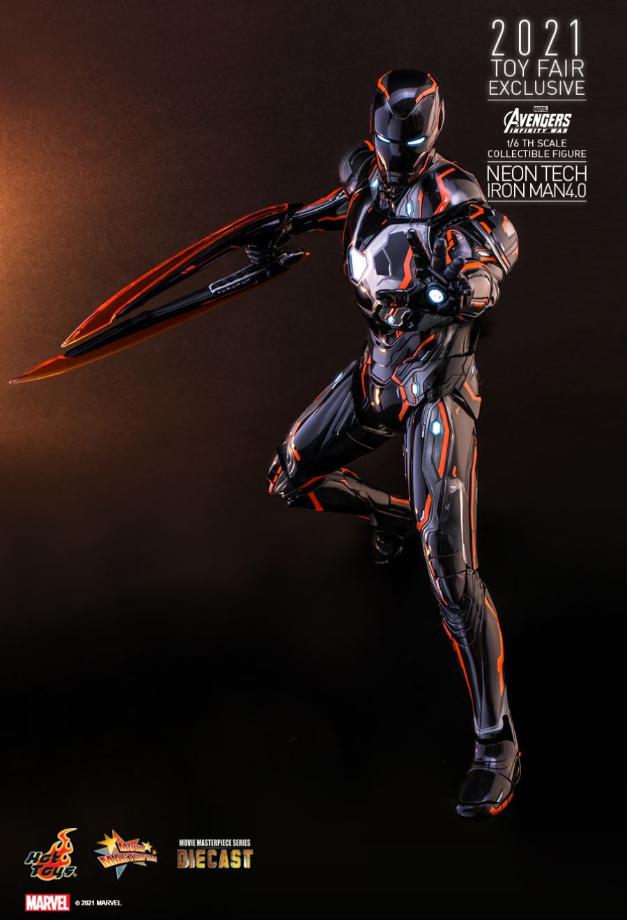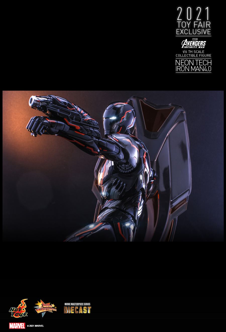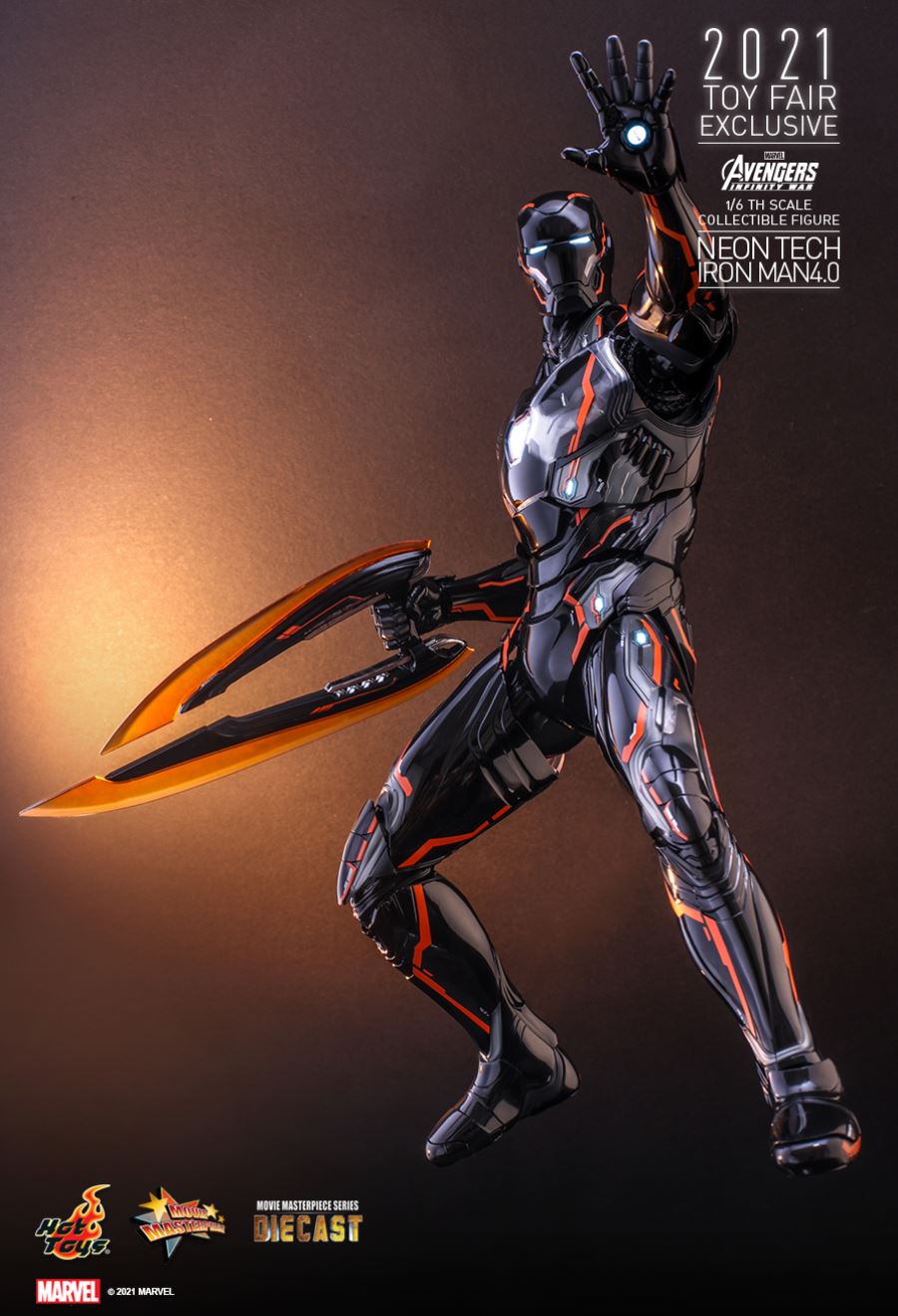 AVENGERS: INFINITY WARNEON TECH IRON MAN 4.01/6TH SCALE COLLECTIBLE FIGURETaking design inspiration toward the futuristic and aerodynamic aesthetic, Hot Toys’ Neon Tech series has skillfully recreated the signature and breathtaking armors appeared in MCU as stunning collectibles, and merged them with glowing neon works. Today, Hot Toys is excited to present the exciting 1/6th scale Neon Tech Iron Man 4.0 collectible figure as Hot Toys 2021 Toy Fair Exclusive item!Stands approximately 32cm tall, the brand-new diecast figure inspired by the appearance of Iron Man Mark L in Avengers: Infinity War features a streamlined suit of armors with asymmetrical patterns; beautifully polished in shiny black, grey and bright neon orange color with luminous reflective patterns appearing under specialized LED light, also a selection of fine armor parts composed in translucent matte material enhancing the overall appearance; LED light-up functions scattered throughout the armor; Iron Man’s signature weapons including interchangeable LED light-up Nano Repulsor Cannon, Hand Cannon, Nano Boosters, Energy Blade, Holo Shield, and specially designed figure stand.Prepare space for this truly stunning figure among your special Marvel collection!SPECIFICATIONSPRODUCT CODEMMS597D39PRODUCT NAMENEON TECH IRON MAN 4.0HEIGHTAPPROXIMATELY 32 CM TALLPOINTS OF ARTICULATIONS30SPECIAL FEATURESSHINY BLACK, GREY AND ORANGE COLORED PAINTING ON THE SLEEK AND STREAMLINE IRON MAN ARMOR DESIGNARTISTSHEAD SCULPTED BY N/AHEAD PAINTED BY N/AHEAD ART DIRECTED BY N/AThe 1/6th scale Neon Tech Iron Man 4.0 Collectible Figure specially features:- Authentic and detailed likeness of Iron Man Mark L armor in Avengers: Infinity War- A helmeted head with LED light-up function (white light, battery operated)- Approximately 32 cm tall- Over 30 points of articulations- Contains diecast material- Special features on armor:- Shiny black, grey and orange colored painting on the sleek and streamline Iron Man armor design- Translucent grey armor parts for mask, arms, and legs- 21 LED light-up points throughout parts of the armor (white light, battery operated)- One (1) pair of articulated air flaps at back of the armor- One (1) detachable chest armor to reveal interior mechanical design- Four (4) pairs of interchangeable hands including:• One (1) pair of fists• One (1) pair of hands with articulated fingers and light-up repulsors (white light, battery operated)• One (1) pair of battle hands with light-up repulsor (white light, battery operated)• One (1) pair of hands for holding weapons- Articulations on waist armor which allow flexible movementWeapons:- One (1) LED light-up Nano Repulsor Cannon (white light, battery operated) (interchangeable with right arm)- One (1) Hand Cannon (interchangeable with left arm)- One (1) pair of Nano Boosters (attachable onto figure’s back)- One (1) Energy Blade- One (1) Holo ShieldAccessory:- A figure stand with a specially designed graphic cardRelease date: Approximately Q3 – Q4, 2021*Prototype shown, final product may be slightly different**Battery included for collectible figure, button cells are required.***Luminous reflective effect can be activated by UV black light torch (not included).****Product details could be subjected to change without further notice.© 2021 Marvel.© 2021 Hot Toys Limited. All Rights Reserved.