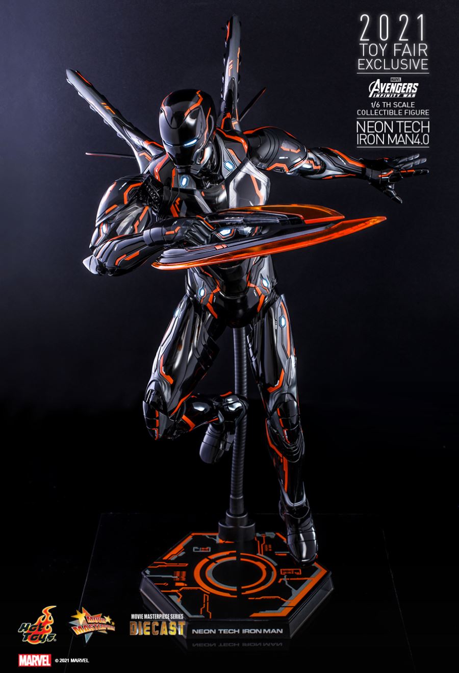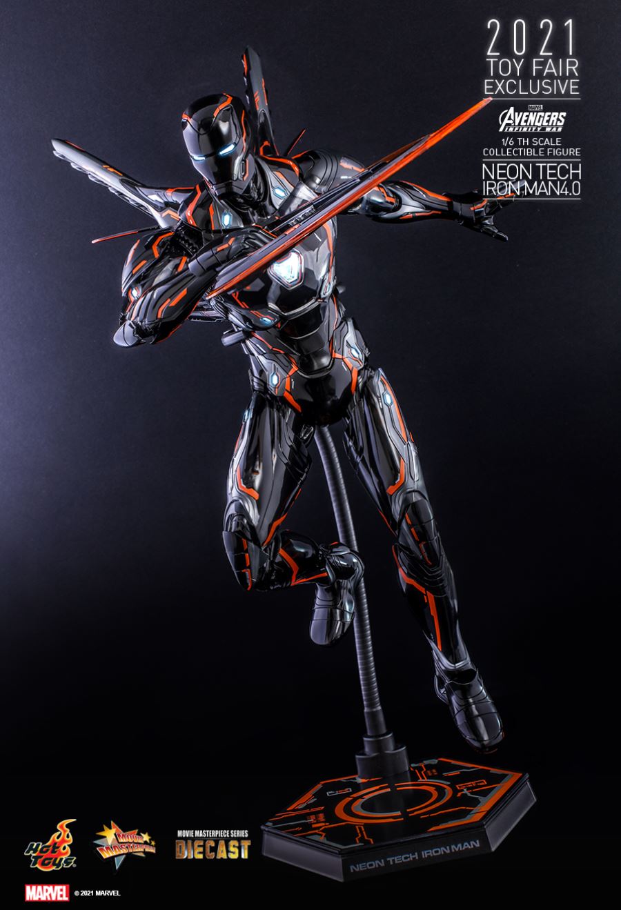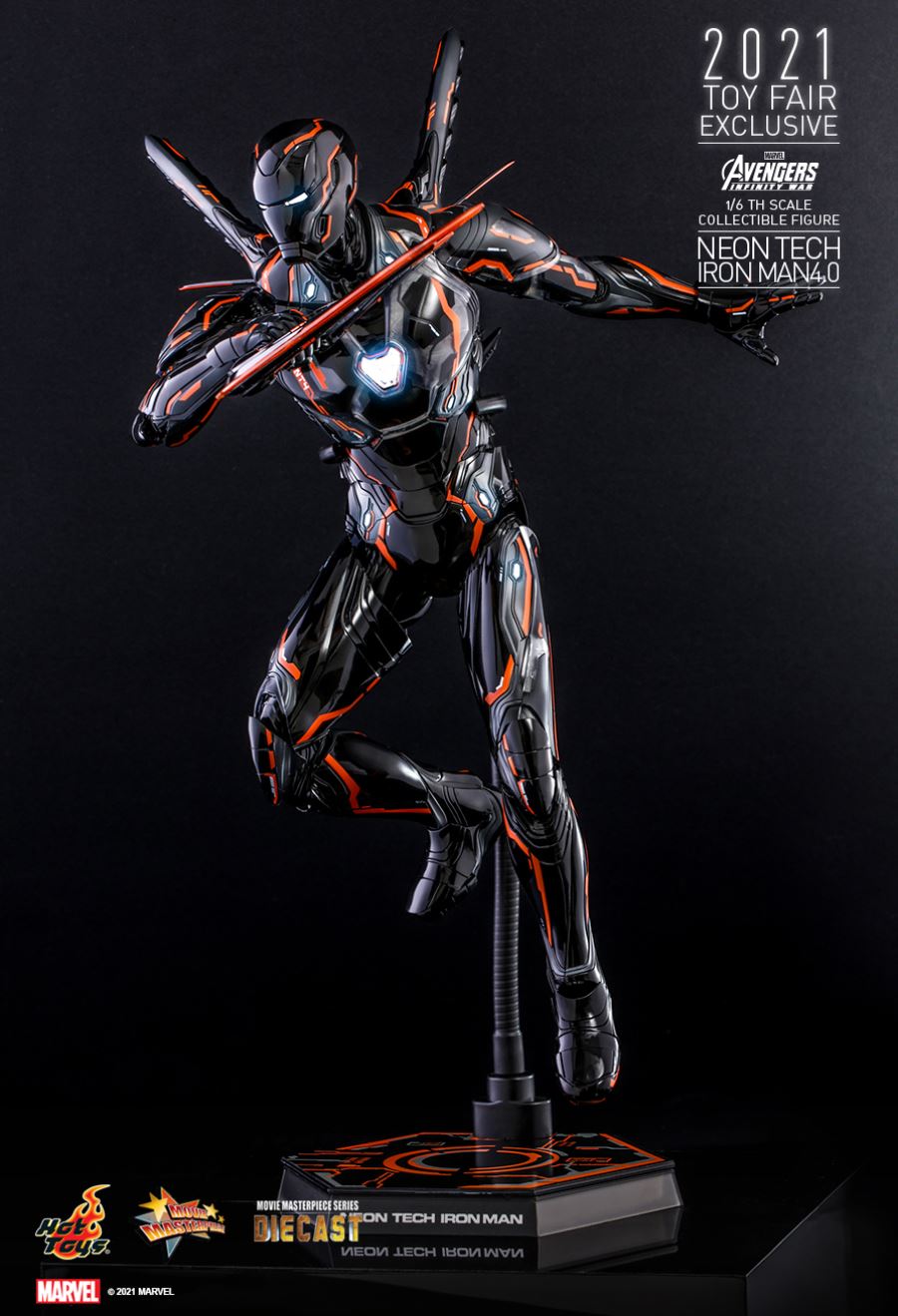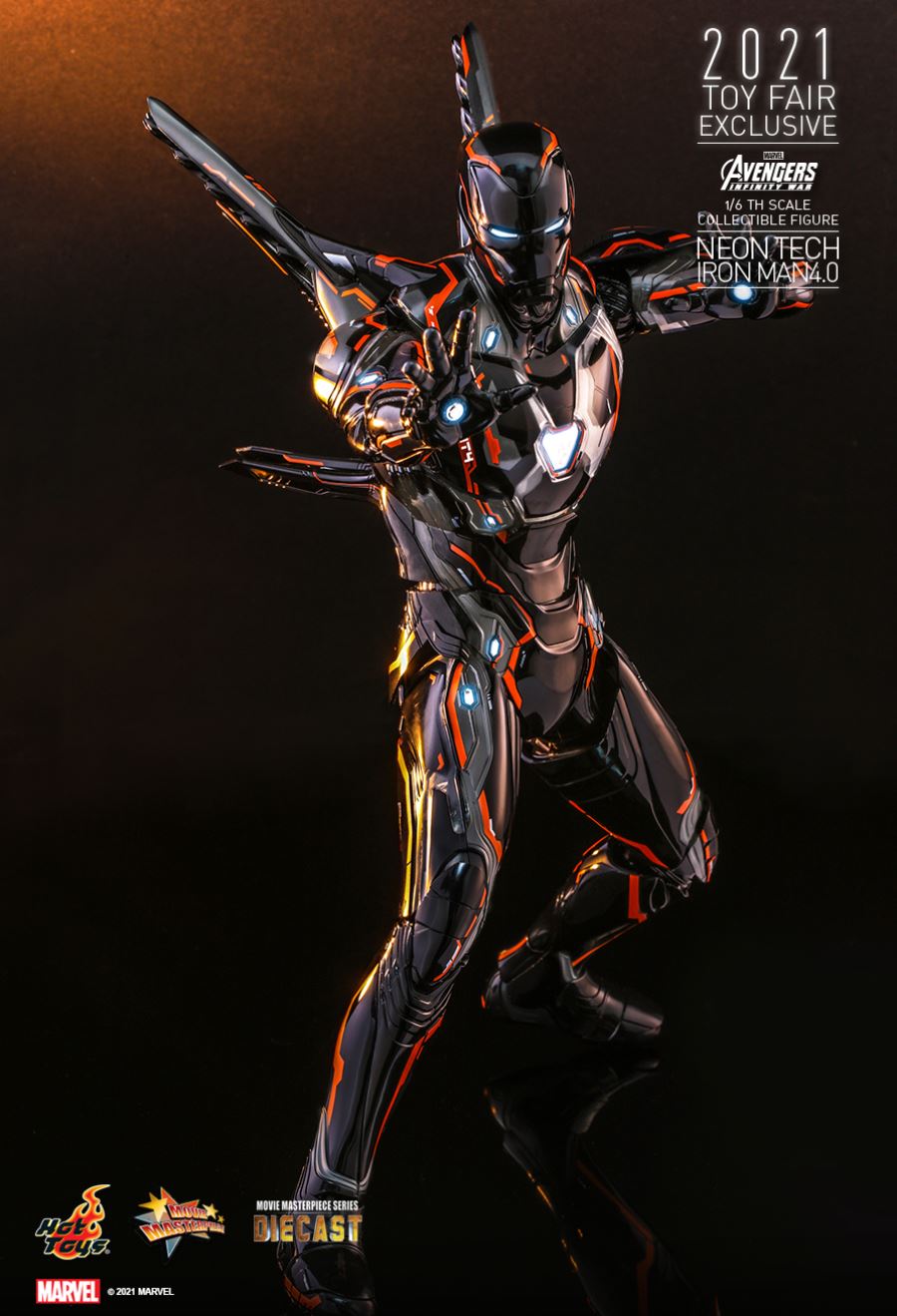 AVENGERS: INFINITY WARNEON TECH IRON MAN 4.01/6TH SCALE COLLECTIBLE FIGURETaking design inspiration toward the futuristic and aerodynamic aesthetic, Hot Toys’ Neon Tech series has skillfully recreated the signature and breathtaking armors appeared in MCU as stunning collectibles, and merged them with glowing neon works. Today, Hot Toys is excited to present the exciting 1/6th scale Neon Tech Iron Man 4.0 collectible figure as Hot Toys 2021 Toy Fair Exclusive item!Stands approximately 32cm tall, the brand-new diecast figure inspired by the appearance of Iron Man Mark L in Avengers: Infinity War features a streamlined suit of armors with asymmetrical patterns; beautifully polished in shiny black, grey and bright neon orange color with luminous reflective patterns appearing under specialized LED light, also a selection of fine armor parts composed in translucent matte material enhancing the overall appearance; LED light-up functions scattered throughout the armor; Iron Man’s signature weapons including interchangeable LED light-up Nano Repulsor Cannon, Hand Cannon, Nano Boosters, Energy Blade, Holo Shield, and specially designed figure stand.Prepare space for this truly stunning figure among your special Marvel collection!SPECIFICATIONSPRODUCT CODEMMS597D39PRODUCT NAMENEON TECH IRON MAN 4.0HEIGHTAPPROXIMATELY 32 CM TALLPOINTS OF ARTICULATIONS30SPECIAL FEATURESSHINY BLACK, GREY AND ORANGE COLORED PAINTING ON THE SLEEK AND STREAMLINE IRON MAN ARMOR DESIGNARTISTSHEAD SCULPTED BY N/AHEAD PAINTED BY N/AHEAD ART DIRECTED BY N/AThe 1/6th scale Neon Tech Iron Man 4.0 Collectible Figure specially features:- Authentic and detailed likeness of Iron Man Mark L armor in Avengers: Infinity War- A helmeted head with LED light-up function (white light, battery operated)- Approximately 32 cm tall- Over 30 points of articulations- Contains diecast material- Special features on armor:- Shiny black, grey and orange colored painting on the sleek and streamline Iron Man armor design- Translucent grey armor parts for mask, arms, and legs- 21 LED light-up points throughout parts of the armor (white light, battery operated)- One (1) pair of articulated air flaps at back of the armor- One (1) detachable chest armor to reveal interior mechanical design- Four (4) pairs of interchangeable hands including:• One (1) pair of fists• One (1) pair of hands with articulated fingers and light-up repulsors (white light, battery operated)• One (1) pair of battle hands with light-up repulsor (white light, battery operated)• One (1) pair of hands for holding weapons- Articulations on waist armor which allow flexible movementWeapons:- One (1) LED light-up Nano Repulsor Cannon (white light, battery operated) (interchangeable with right arm)- One (1) Hand Cannon (interchangeable with left arm)- One (1) pair of Nano Boosters (attachable onto figure’s back)- One (1) Energy Blade- One (1) Holo ShieldAccessory:- A figure stand with a specially designed graphic cardRelease date: Approximately Q3 – Q4, 2021*Prototype shown, final product may be slightly different**Battery included for collectible figure, button cells are required.***Luminous reflective effect can be activated by UV black light torch (not included).****Product details could be subjected to change without further notice.© 2021 Marvel.© 2021 Hot Toys Limited. All Rights Reserved.