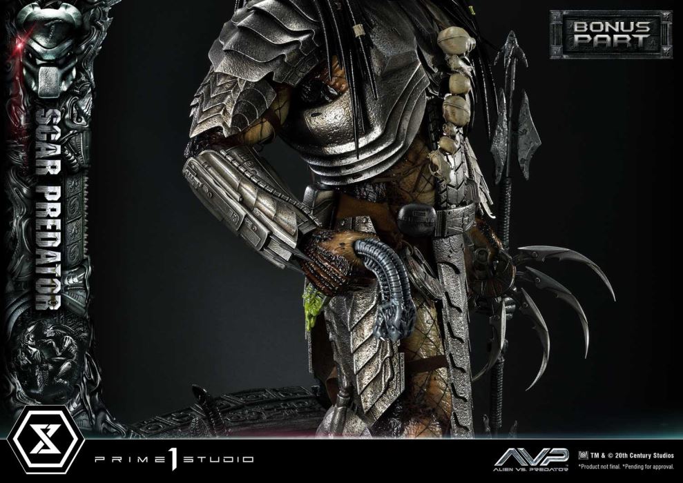 “The enemy of my enemy is my friend…” – Alexa Woods, to ScarIt has been almost twenty years since Alien vs. Predator, also known as AVP, was released and blessed both Aliens and Predators franchise fans, pitting the creatures against each other in an action-packed, sci-fi horror film. Prime 1 Studio is excited to present our next entry to the Predators grand family, joining the Museum Masterline Series, the 1/3 Scale MMPR-04DXS Scar Predator Deluxe Bonus Version from the 2004 film Alien vs. Predator!In this incredible crossover blockbuster, Scar and his brothers Celtic and Chopper were all sent to Earth to undertake an initiation Hunt in an ancient pyramid buried beneath Antarctica. The pyramid served as a hunting ground, where Predators used Aliens as prey in order to graduate from Young Blood Yautjas to Blooded Yautja, thus being considered an adult and a full member of its Clan. Let us look closer at Scar, the youngest of the three Predator brothers.Once again, the incredible artisans at Prime 1 Studio brought their A-game to bring this imposing and fearsome extraterrestrial hunter to life. At a whopping 36 inches tall, Scar is fully armored and equipped with an arsenal of advanced technology and brutal instruments of death. As usual, the immense dedication and attention to detail from our artisans and sculptors that went into crafting this remarkable Predator statue ensures the utmost level of accuracy. From each single strand of dreadlock to the tiny Xenomorph skulls and the shading of the skin and armor. You will definitely see and feel our commitment to perfection with this piece! The iconic Bio-Mask, features a distinctive mark on the forehead, referring to his name “Scar”. The Plasmacaster is ready to unleash its devastating energy blasts on any prey that’s unlucky enough to be targeted by the helmet’s targeting lasers, both of which are LED illuminated a bright blue and red, respectively. He holds in his right hand the Combistick, a spear-like weapon that serves to impale victims from a distance. In contrast, the gauntlet-integrated Wristblade, in its retracted state, is designed for close-quarters combat, allowing him to slice through flesh and bone with brutal efficiency. His left hand is equipped with a massive Shuriken, absolutely lethal when thrown. The Wrist Gauntlet is also equipped with LED illuminating functions. The base features ancient Yautja-constructed ruins and the corpse of a Facehugger that has been freshly slain. We have also included a second head, without the Bio-Mask to display Scar’s true face, and a head base for display. A silver “AVP” logo plate is also included for display at the statue's base.The Deluxe Version will allow you to mix and match a series of additional hand parts to find the perfect display to your liking. Two additional right-hand parts are included, one closed fist and one open palm. Two additional Wristblade lengths for the right gauntlet allow you to either fully or partially extend the deadly blades. The left hand comes with two additional open palm variations and an additional third head part featuring Scar’s visage as he roars. A second headstand and logo plates are included for you to display.And when you order the Deluxe Bonus version from our official store or any authorized distributor, you will receive additional parts to expand your storytelling: an additional Bio-Mask head part without the scar on the forehead, an additional right hand holding a ripped-out Inner mouth of a Xenomorph and an additional left hand holding an ornamental Dagger.Limited to only 300pcs worldwide, pre-order this massive and fearsome 1/3 Scale MMPR-04DXS Scar Predator Deluxe Bonus Version now and expand your collection while quantities last! And stay on the lookout for his two brothers, Celtic and Chopper in the very near future. Specifications:Statue Size approximately 36 inches tall [H:93cm W:85cm D:91cm]Statue Size approximately 36 inches tall [H:93cm W:85cm D:76cm] (Extended Wristblade)Yautja-constructed pyramid themed-baseThree (3) Swappable head parts (Bio-Mask, Unmasked Classic Portrait, Unmasked Roaring Portrait)Three(3) Swappable right-hand parts (Combistick, clenched fist, open palm)Three(3) Swappable left-hand parts (Shuriken, clawing palm, open palm)Three(3) Wristblades (Retracted, Partially Extended and Fully Extended)Two (2) Movable HeadstandTwo (2) Title PlaquesLED illumination on Helmet-mounted Targeting Laser, Wrist Control Panel & Shoulder-mounted PlasmacasterOne (1) Swappable Bonus Head Part (Bio-Mark with no marking) [BONUS PART]One (1) Swappable Bonus right-hand part (Holding Inner mouth)[BONUS PART]One (1) Swappable Bonus left-hand part (Ornamental Dagger)[BONUS PART]Notice:Prototype samples shown.Product details could be subject to change without further notice.Please note the final product specifications may differ because each product is Handmade.Since the product is still in the development stage, the Size (up to 10%) & Weight (up to 10kg) may be changed during the production stage. TM & © 20th Century Studios DETAILSBrandsPRIME 1 STATUECollectionMuseum MasterlineSeriesAilen vs.PredatorScale1/3 ScaleProduct CodeMMPR-04DXSProduct Size Approx.H:93cm W:85cm D:91cmH:93cm W:85cm D:76cm (Long Wrist blade)Carton(Est.): 2 boxesProduct Weight Approx.About 66.5 kgMaterialsPolystone and other materialsJAN4580708048444