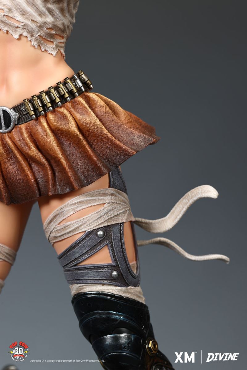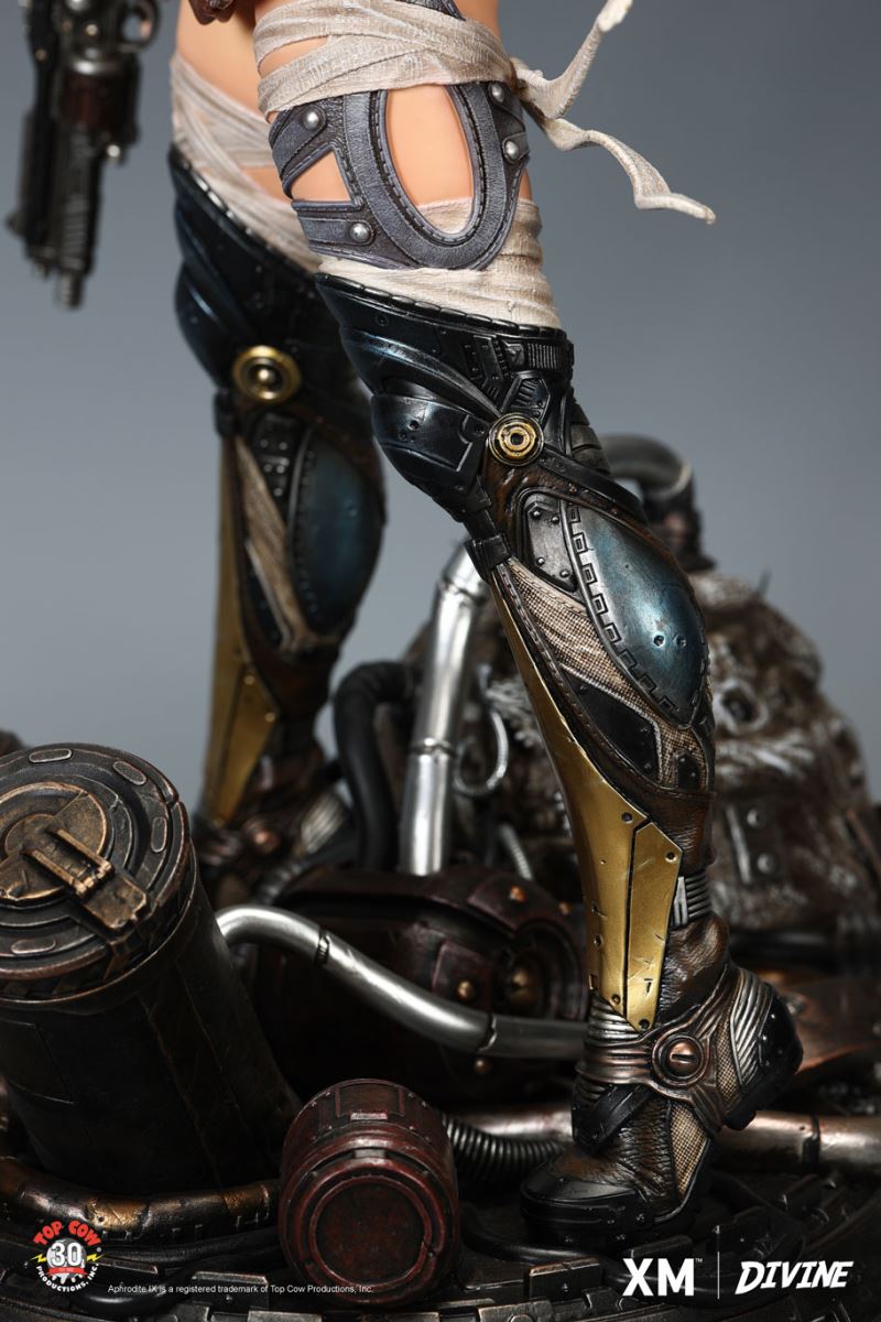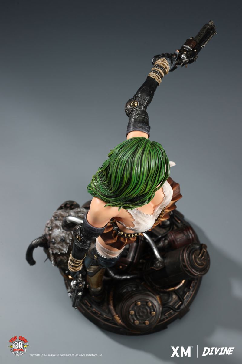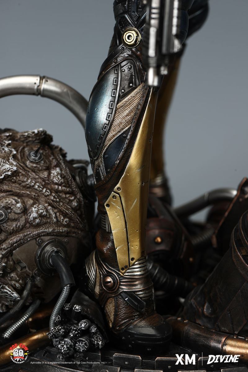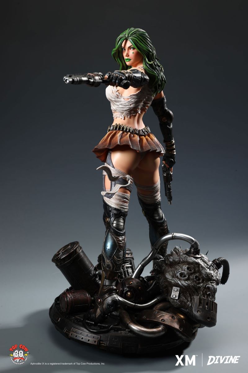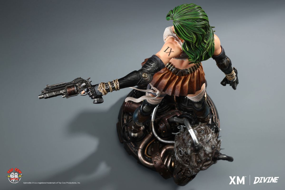 XM Studios is excited to present Aphrodite IX, our latest collaborative project with Divine! and Top Cow. This statue comes alive with an infusion of XM Studios’ signature craftsmanship. The bold and daring pose is supported with a storytelling base that pays homage to her nostalgic comic book run in the early 2000s. To achieve our renowned XM quality, each painstakingly hand-crafted statue is meticulously hand-painted and rigorously checked for their quality. On top of her signature Kelly green make-up and hair, special care has also been taken to bring out textures and details found all over Aphrodite’s costume. We knew that for us to depict her in the heat of a battle, these details would be crucial to the storytelling. No expense was spared in the creation of her peripherals either. From the futuristic dual weaponry and ammo belt to the amalgamated base that represents the cybernetic decadence found in the pages of the comic, everything was crafted with the utmost attention so as to bring this cybernetic assassin to life. We hope this art piece will bring you back, and allow you to reminisce about the vibrancy of Top Cow’s comic book aesthetics found in the early 2000s. Because that is what we had in mind when crafting it. Character Background: Hundreds of years after a cataclysmic event scorched the surface, Earth and its inabitants have been forever altered and a new landscape and political struggle has taken hold between two distinct factions fighting for control. Aphrodite IX is both anachronism and advanced technology in a world that she no longer recognizes. To survive in this future, she must choose sides in a war that she wants no part in. Read more: https://topcow.com/aphrodite-ix/The Aphrodite IX Premium Collectibles statue features:Highly detailed sculpt featuring Aphrodite IXCrafted in polystoneEach handcrafted statue is individually hand-painted with high-quality finish Artists:XM Studios Design and Development Team (2D)Tiago Zenobini de Souza (3D)About Divine:Divine is a labor of love born from a lifelong obsession of heavy metal, comic books and pop culture. Divine seeks to deliver the most iconic characters in statue form, bringing the horrors and the beauties of each and every character to life in glorious detail never seen before. For all international orders please visit Divine.Manufactured by:XM StudiosProduct size : 40 cm L X 33cm B X 54cm HtEst. Box Size : 64cm L X 60cm B X 22cm HtEst. Product Weight : 8kgEst. shipping weight : 10.5kgNote: Prototype shown and pending final approval, final product may differ