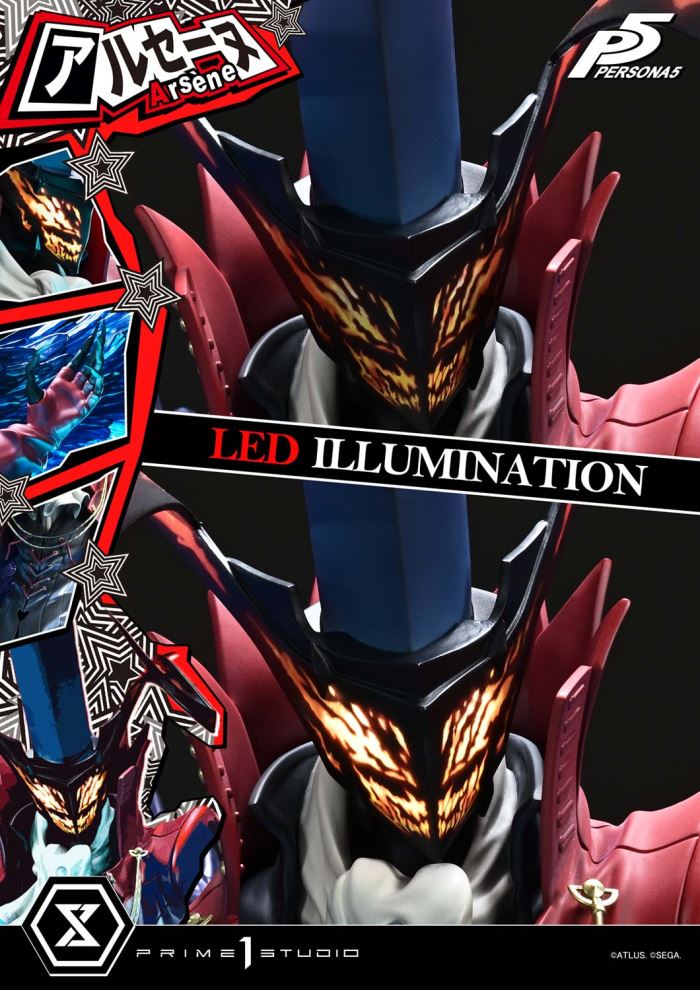 Arsène, manifested in monumental 1/4 scale.From the hit RPG that blends picaresque romance with school juvenile drama, Persona 5, comes Arsène—now joining the Premium Masterline series.Arsène appears at the protagonist’s awakening, and this statue captures that iconic moment with commanding presence. Dressed in a striking two-tone suit of crimson and black, topped with a long, hat-like silhouette, and crowned with expansive black wings—this figure brings the awe and tension of the scene in a breathtaking 1/4 scale, measuring an impressive 148 cm wide.Each gentlemanly detail of Arsène’s design harmonizes the game’s visual identity with real-world textures. From the iconic crimson hues and soaring curves of his headpiece to the soft, sculpted folds of the scarf at his chest, every element has been crafted without compromise. Especially eye-catching is the vivid blue flame rising from beneath his feet. The wings and legs reflect the same flame-like textures, capturing the very instant of his materialization. His head also features an LED lighting effect, illuminating an expression that evokes his triumphant laughter.But Arsène is never complete without the Persona-user who commands him. Designed as a complementary piece to the same-scale Protagonist (Joker), this statue features sculpt and color work that seamlessly align between the two. Display them together to recreate the thrilling summoning scene.Additionally, this Bonus Version includes a Phantom Thieves of Hearts logo stand — a special item sure to steal every fan’s heart.An art piece of sculpt, color, and visual effects at their highest level. A tribute to all players who once raced through the shadows as members of the Phantom Thieves.Specifications:Persona 5-themed BaseLED Light-Up Feature (Face)Phantom Thieves of Hearts Logo Stand [BONUS PART]*The logo stand is currently under supervision, and its design is subject to change.LED Power Supply Method: TBA* Please prepare batteries, USB cables, or other necessary items depending on the final power supply method.Notice:Prototype samples shown.Product details could be subject to change without further notice.Please note the final product specifications may differ because each product is Handmade.Since the product is still in the development stage, the Size (up to 10%) & Weight (up to 10kg) may be changed during the production stage.©ATLUS. ©SEGA.DETAILSBrandsPRIME 1 STATUECollectionPremium MasterlineSeriesPersona SeriesScale1/4 ScaleProduct CodePMP5-04SProduct Size Approx.H:96cm W:148cm D:63cmH:14cm W:16cm D:3cm(Logo Stand)Carton(Est):3 boxProduct Weight Approx.25.2 kgCarton Size Approx.Carton A [ H 58cm × W 76cm × D 44cm ]Carton B [ H 67cm × W 85.5cm × D 40cm ]Carton C [ H 65cm × W 85.5cm × D 40cm ]MaterialsPolystone and other materialsJAN4582647122438