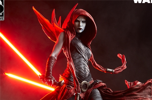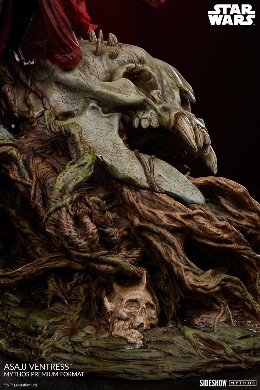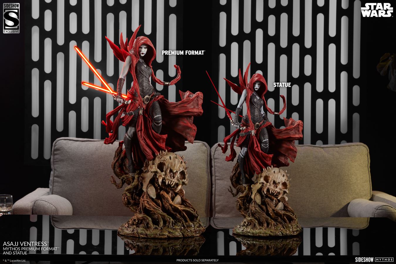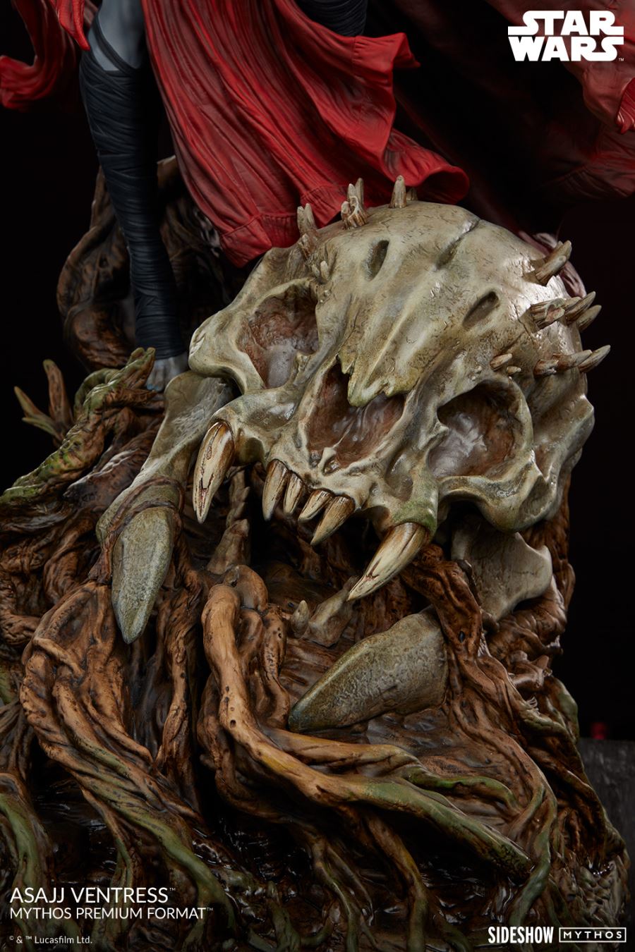 “Your weakness will not be my downfall!”Sideshow presents the Star Wars™ Asajj Ventress™ Mythos Premium Format™ Figure, an officially licensed Star Wars™ collectible highlighting the character in a stunning new scale.Sideshow’s Mythos series features fine art collectibles that allow the collector to imagine what could have been, but maybe never was. Myths meant to be initiated by the eye and completed by the mind. This quarter-scale presentation immerses you in the merciless world of the Witches of Dathomir.The Asajj Ventress Mythos Premium Format™ Figure measures 27” tall, 17” wide, and 17” deep as this menacing Nightsister stands poised on a snarling Ssurian skull. Its skeletal remains are snared in her home planet’s native flora as well as the gnarled growths of a Dathomirian swamp. The Sith assassin herself is swathed in an intricately flowing red and black outfit while she wields dual red Lightsabers — a sign of the grueling battle to come as she chases glory in the galaxy.This Asajj Ventress collectible features fully sculpted clothing in her culture’s traditional color palette. Her polystone bodice, leg guards, and gloves all have a wrapped and roughened appearance while the layered skirts and feathers adorning her shoulders are crafted with dynamic, billowing movement. Asajj Ventress’ signature alabaster complexion, piercing white gaze, and Zabrak facial markings are showcased beautifully by her bold appearance. This Star Wars statue also includes light-up sabers, their vibrant illumination revealing this enemy of the Jedi in a perfect contrast of light and shadow.Capturing the mystery of her story, the Exclusive Version of the Asajj Ventress™ Mythos Premium Format™ Figure includes two distinct portraits which allow collectors to display multiple stages of her ascension. One portrait features Asajj Ventress’ bald head and clouded eyes and the other shows her with a red hood drawn over her face, elevating the intrigue surrounding her character.Harness your magick and bring home the Asajj Ventress™ Mythos Premium Format™ Figure by Sideshow today.MaterialsPolystoneProduct SizeHeight: 27 (69 cm)Width: 17 (43 cm)Depth: 17 (43 cm) *