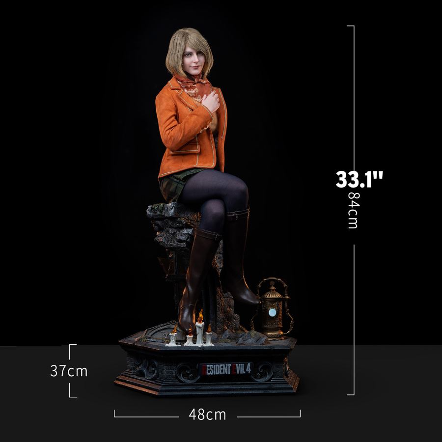 Ashley, the daughter of the US President Graham, was kidnapped on her way home from college, and Agent Leon S. Kennedy was sent to rescue her.In this brutal escape, she transformed from a protected target into a reliable partner, fighting along side with Leon.Infinity Studio, with meticulous craftsmanship, capturing Ashley's defining moment by reproducing and presented the classic sitting posture of her from the game CG.Head SculptCapturing the moment with lifelike sculpture. The hair is crafted using high-quality synthetic fibers with detailing and presenting a natural look. The eye uses prosthetic eyes, looking bright and vivid. Skin TextureRealistic touch, exquisite craftsmanship in material selection. The exposed skin parts are all made of platinum silicone, with delicate texture and realistic feel. ApparelIndustry standard clothing for detail restoration. Ashley's suit is made of custom-made muslin fabric, which is stiff and well-shaped, complemented by heavy-duty embroidery, making it delicate and beautiful.Highly restoring the game details by using real fabric for sweater and custom prints on the scarf and culottes. Product BaseCreating scene atmosphere with two lighting effects. The platform design recombines elements from the game, with the lantern shape accurately restoring the game's settings and featuring a built-in LED light. Light up candles and lanterns create a gloomy and mysterious display space. Don't miss your chance to add this Ashley Graham 1:2 Scale Statue to your Resident Evil collection today.MaterialsFiber , Polystone , LED , SiliconeProduct SizeHeight: 33.1 (84 cm)Width: 18.9 (48 cm)Depth: 14.6 (37 cm) *