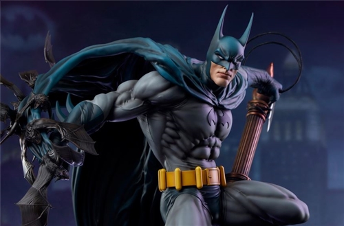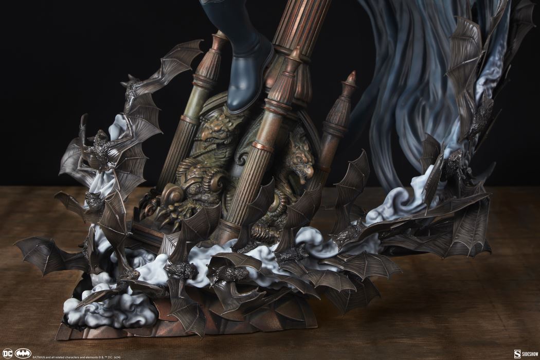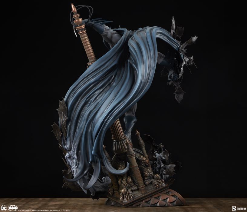 “I don’t know what it was that bent your life out of shape, but who knows? Maybe I’ve been there too. Maybe I can help.”Sideshow presents the Batman Premium Format™ Figure, a DC collectible which spotlights the dark nature of this detective.Measuring 27” tall, 21” wide, and 20” deep, the Batman Premium Format Figure finds Gotham City’s nocturnal super sleuth balanced at the summit of a church steeple. Bruce Wayne’s alter ego searches for clues to help him solve his current case while he grapples onto a crooked spire far above the city streets. As a colony of bats swarms around and morphs into his long, billowing cape, Batman becomes a prowling creature of the night who is able to stalk any enemy through the deepest shadows and the most dizzying heights.This intricate, fully sculpted Batman statue presents the World’s Greatest Detective completely composed and in his element despite the precarious position in which he stands. He wears his gray and blue comic-inspired costume as well as his iconic bright yellow belt. The cowl’s elongated ears, the hero’s enigmatic expression, and his coiled muscles all emphasize this collectible’s commanding presence in any fan’s personal Batcave.The game is afoot in Gotham! Bring home the Batman Premium Format Figure by Sideshow today.MaterialsPolystone Product SizeHeight: 27 (69 cm)Width: 21 (53 cm)Depth: 20 (51 cm)Weight: 24 lbs (10.9 kg) *