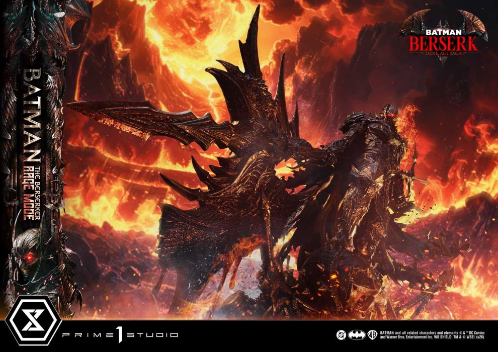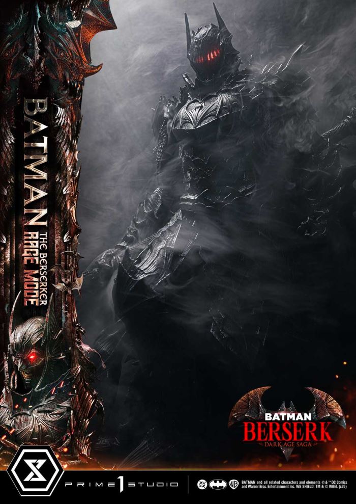 A colossal axe strike brings judgment upon a world without justice.The enraged Dark Knight is given form in 1/4 scale.A new hero emerges within the DC Omniverse—Batman: The Berserker Rage Mode joins the Ultimate Premium Masterline lineup.Venturing alone through a world crawling with demons, Batman wields the power of darkness to strike down darkness itself. This statue gives form, at 1/4 scale, to the dark hero envisioned by Prime 1 Studio. Standing with the massive axe “Judgment of Faith”—a fusion of four weapons—in hand, the piece pursues a powerful silhouette and densely layered detail.The full-face head represents the Final Form of a helmet that transforms in response to surging emotion. Red LED illumination in the eyes expresses a rage on the verge of consuming reason itself. The armor, which binds the body like restraints, was crafted under the theme of dark protection, emphasizing a sinister presence. From the widely spreading cape, bats take flight, heightening the drama of the moment.At his feet lies Bane, transformed into a demonic creature and impaled by a sword. His unfocused eyes, rigid fingers, and the heavy presence of helmet and chains are rendered with meticulous attention to texture and color, capturing the realism of a final, dying scream.Presented by Prime 1 Studio, the enraged Dark Knight. Within your collection room, the curtain rises on a story arc that no one has yet witnessed.Specifications:Batman: The Berserker-Themed BaseLED Illumination (Batman’s Eyes)LED Power Supply Method: TBD* Please prepare batteries, USB cables, or other necessary items depending on the final power supply method.Notice:Prototype samples shown.Product details could be subject to change without further notice.Please note the final product specifications may differ because each product is Handmade.Since the product is still in the development stage, the Size (up to 10%) & Weight (up to 10kg) may be changed during the production stage.BATMAN and all related characters and elements © & ™ DC Comics and Warner Bros. Entertainment Inc. WB SHIELD: TM & © WBEI. (s26)DETAILSBrandsPRIME 1 STATUECollectionUltimate Premium MasterlineSeriesBatman SeriesScale1/4 ScaleProduct CodeUPMDC-14Product Size Approx.H:82cm W:113cm D:53cmCarton(Est):3 boxProduct Weight Approx.35kgCarton Size Approx.Carton A [ H 66cm × W 62cm × D 51cm ]Carton B [ H 73cm × W 72cm × D 40cm ]Carton C [ H 62cm × W 86cm × D 41cm ]MaterialsPolystone and other materialsJAN4582647123633