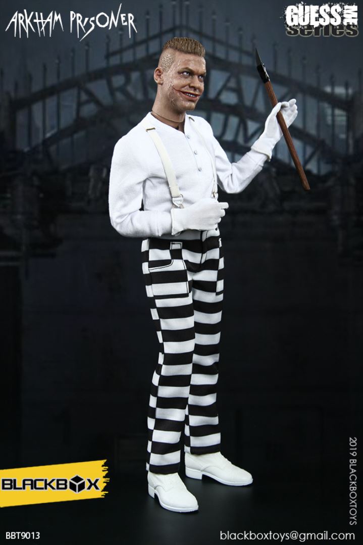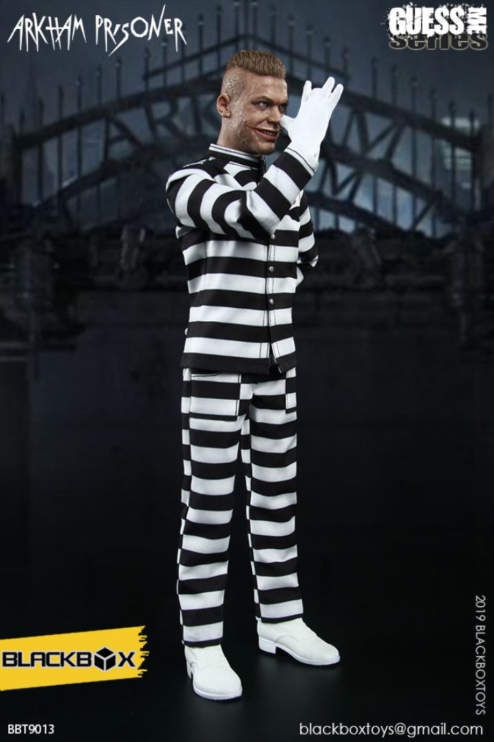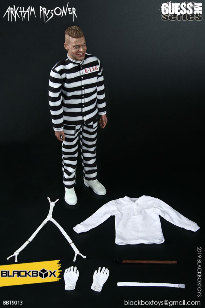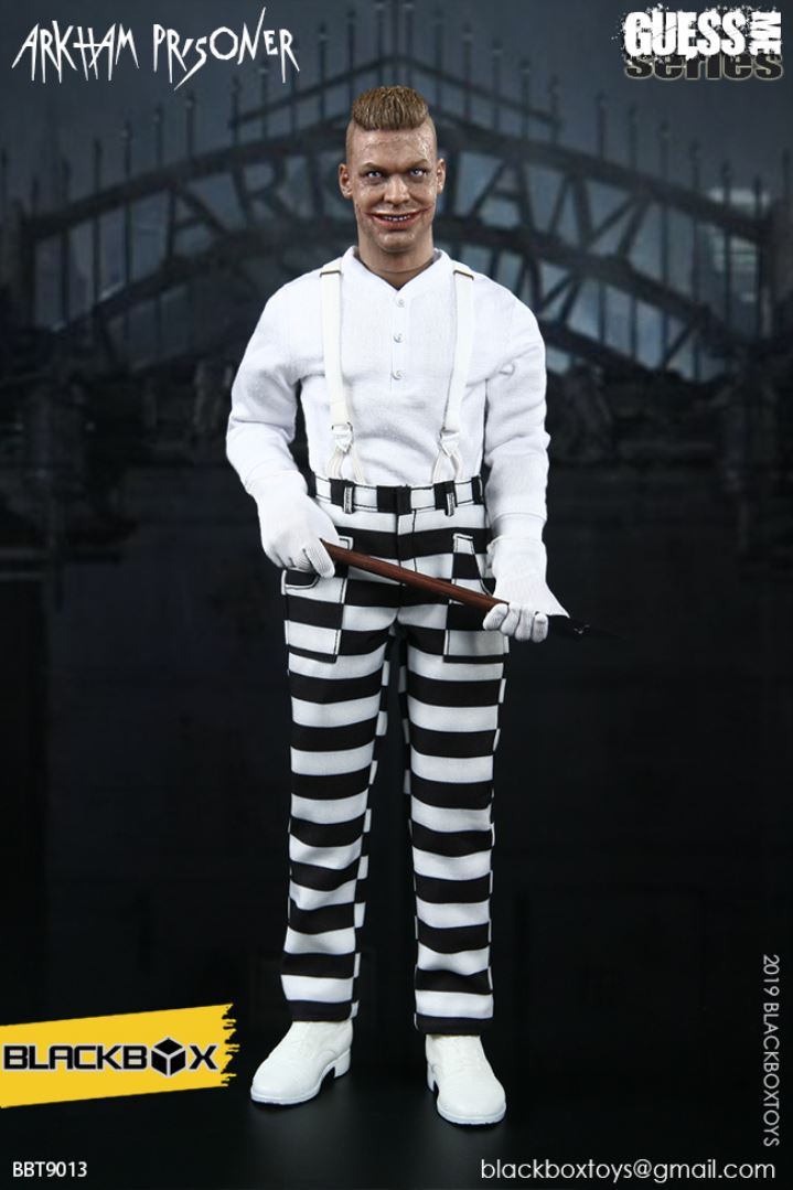 BLACKBOX 1/6 GUESS ME SERIES ARKHAM PRISONERblack box toy BLACKBOX 1/6 Who is my series - Arkham's prisoner - Gotham JeromeMovable PRODUCT ITEM NO.: BBT9013SET INCLUDES:Clothing COSTUME :black and white color Arkham prison uniform ARKHAM PRISON UNIFORMwhite long sleeve grandfather shirt MEN'S LONG SLEEVE GRANDAD TOPwhite sling SUSPENDERSwhite gloves GLOVESwhite canvas slider buckle belt CANVAS MILITARY WEB BELT WITH SLIDER BUCKLEhead carving HEAD SCULPTURE JEROME body Even BODY W/ RELAXED HANDSequipped with ACCESSORIES:Boots BOOTSWeapons WEAPONS:Homemade Apache Arrows CUSTOM APACHE ARROWHEADS