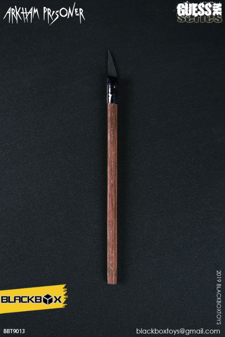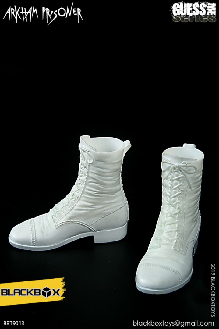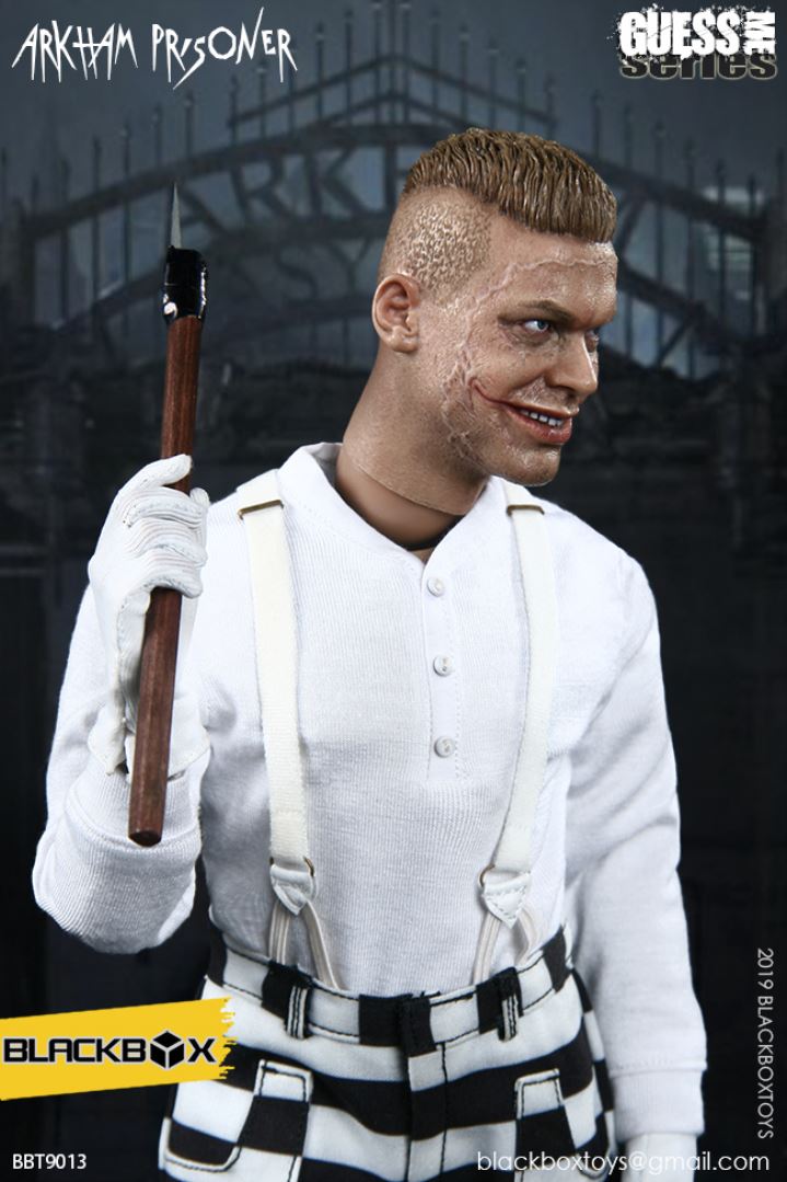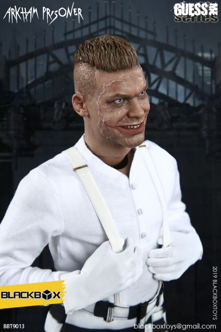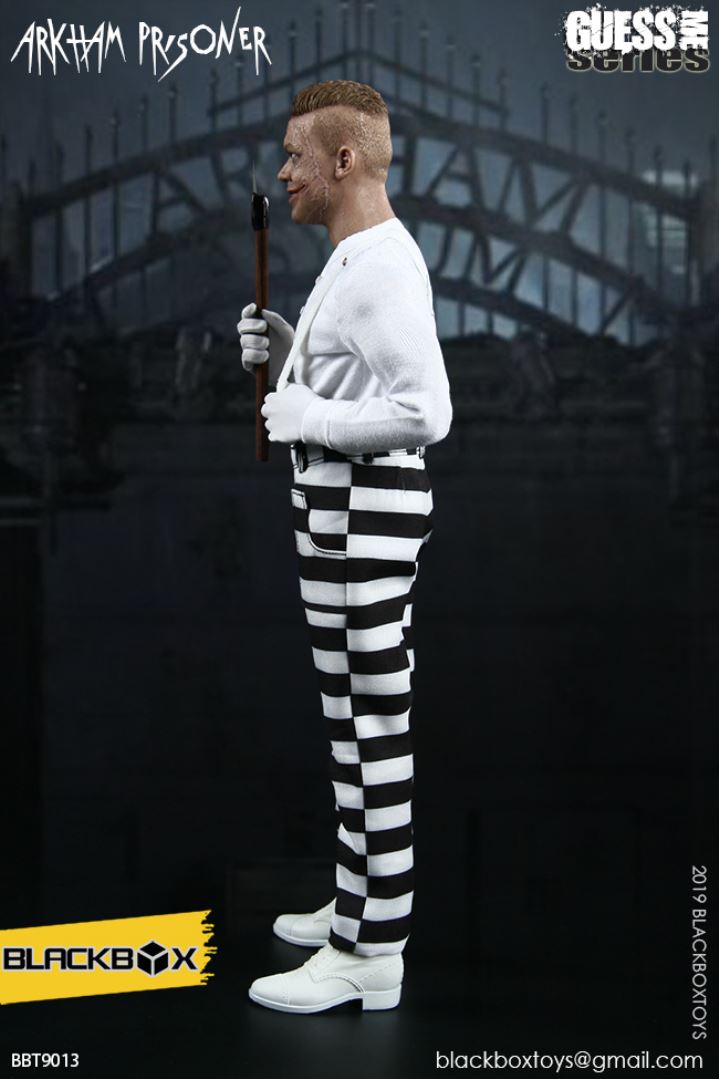 BLACKBOX 1/6 GUESS ME SERIES ARKHAM PRISONERblack box toy BLACKBOX 1/6 Who is my series - Arkham's prisoner - Gotham JeromeMovable PRODUCT ITEM NO.: BBT9013SET INCLUDES:Clothing COSTUME :black and white color Arkham prison uniform ARKHAM PRISON UNIFORMwhite long sleeve grandfather shirt MEN'S LONG SLEEVE GRANDAD TOPwhite sling SUSPENDERSwhite gloves GLOVESwhite canvas slider buckle belt CANVAS MILITARY WEB BELT WITH SLIDER BUCKLEhead carving HEAD SCULPTURE JEROME body Even BODY W/ RELAXED HANDSequipped with ACCESSORIES:Boots BOOTSWeapons WEAPONS:Homemade Apache Arrows CUSTOM APACHE ARROWHEADS
