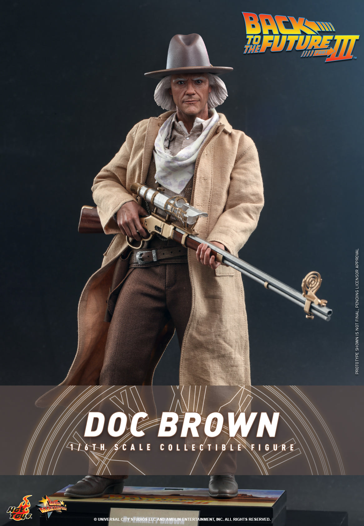 หุ่นจำลองของ Doc Brown ล่าสุดนี้สร้างขึ้นจากรูปลักษณ์ของคริสโตเฟอร์ ลอยด์ทางตะวันตกเก่าในบทบาทของดร. เอ็มเม็ตต์ บราวน์ ที่ประดิษฐ์ขึ้นอย่างสวยงามโดยมีลักษณะเป็นรูปปั้นหัวที่พัฒนาขึ้นใหม่พร้อมหมวกคาวบอย เครื่องแต่งกายที่มีรายละเอียดสูงพร้อมการตัดเย็บอย่างปราณีต เสื้อคลุมและผ้าพันคอเพื่อสร้างลุคที่เป็นซิกเนเจอร์ดังที่เห็นหน้าหอนาฬิกา อาวุธและอุปกรณ์เสริมที่มีรายละเอียดสูง เช่น ปืนไรเฟิล ปืนพก ไทม์แมชชีนจิ๋ว นาฬิกาพก เครื่องสื่อสารพร้อมแบตเตอรี่ และขาตั้งฟิกเกอร์