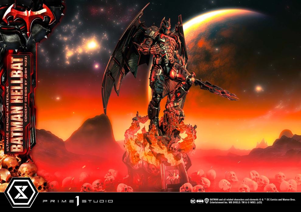You say I'm fated to die in this suit. My victory says otherwise.Get ready to gear up! Enter the treacherous Bat-Suit, a daring choice that seeks power at a price. Prime 1 Studio introduces DC fans to the super-epic release from our Batman lineup, the UPMDC-06 Ultimate Premium Masterline Batman Hellbat Concept Design by Josh Nizzi.Batman equips his Hellbat suit and embarks on a grueling mission to resurrect his deceased son, Damian Wayne, while facing off against the DC Universe's most formidable villain, Darkseid. The Hellbat, forged by the Justice League and designed by Batman, is a double-edged blade that trades tremendous strength for the wearer's life.Prime 1 Studio proudly collaborated with renowned concept artist Josh Nizzi to extract the full might of this high-risk, unforgiving menace of a suit. The exo-suit's surreal attack and evasive capabilities are evident in the energy-based broadsword and the large wings forming from its back. The helmet’s red eye visor and the chest insignia on the mechanical torso scream “Don’t mess with me.” Josh Nizzi also adds a touch of originality and depth by highlighting the muscle lines across the whole body with red lines, showcasing the overall flexibility and durability of the nano-kinetic metallic suit. Inspired by the planet Apokolips, the base is finely finished with embedded LEDs, creating illuminating flames and a metallic red bat symbol that guides you to the battleground.This legendary suit, crafted with the combined wisdom of the Justice League to challenge even Darkseid, is a must-have addition to your collection. Bring justice to your display by Pre-ordering the UPMDC-06 Ultimate Premium Masterline Batman Hellbat Concept Design by Josh Nizzi now! Specifications: Apokolips -themed baseLED Illumination flames on base Notice: Prototype samples shown.Product details could be subject to change without further notice.Please note the final product specifications may differ because each product is Handmade.Since the product is still in the development stage, the Size (up to 10%) & Weight (up to 10kg) may be changed during the production stage. BATMAN and all related characters and elements © & ™ DC Comics and Warner Bros. Entertainment Inc. WB SHIELD: TM & © WBEI. (s23) DETAILSBrandsPRIME 1 STATUECollectionUltimate Premium MasterlineSeriesDC SeriesScale1/4 ScaleProduct CodeUPMDC-06Product Size Approx.H:76cm W:49cm D:40cmPackage Weight Approx.About 15.4 kgCarton(Est.): 1 boxMaterialsPolystone and other materialsJAN4580708048277