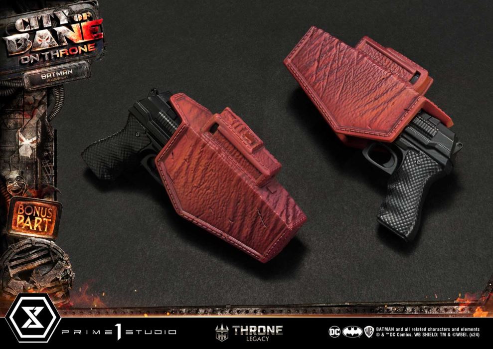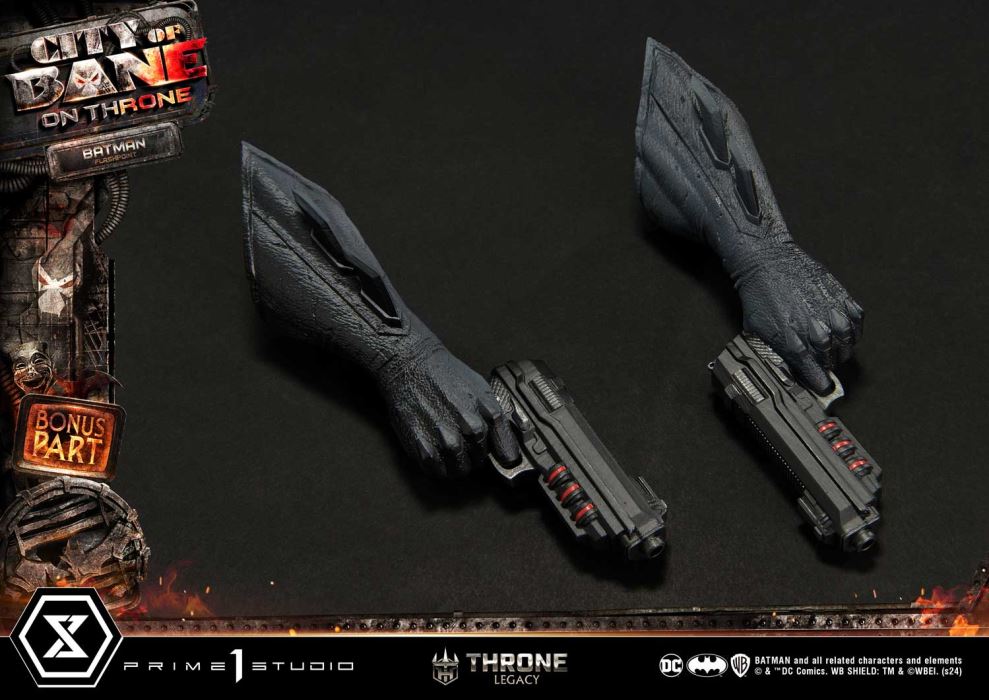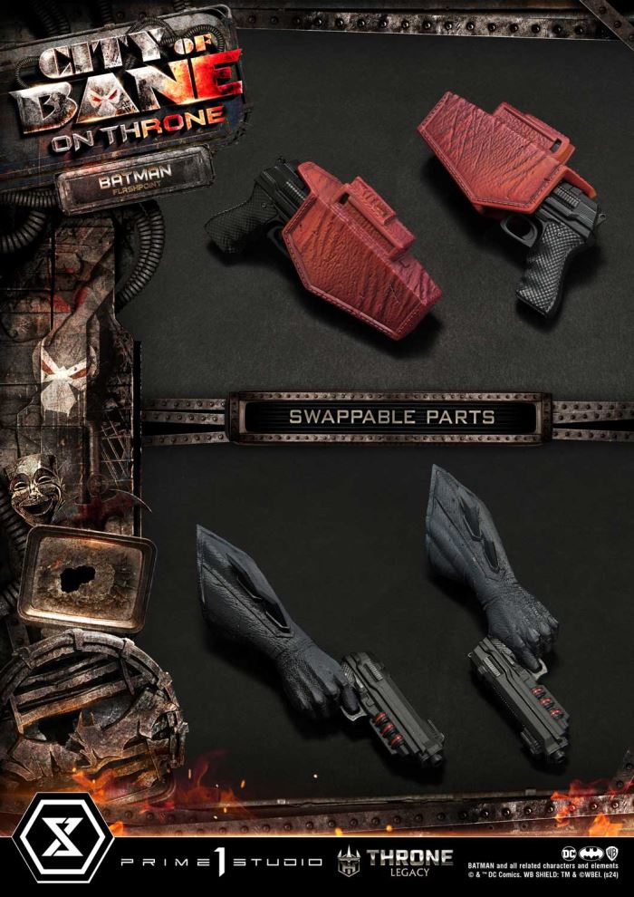 “Do not make this mistake. I’m not a silly villain or a bumbling police officer. I’m not a pretender to the throne, destined to fall. I’m Batman”Prime 1 Studio is proud to present the next much-anticipated entry to the Throne Legacy Collection in collaboration with DC artist Carlos D’Anda; here is the 1:4 scale TLCDC-06S Flashpoint Batman Bonus Version from Batman comics!Enter the twisted and alternate reality of Gotham City featuring Batman from the Flashpoint timeline. In this timeline, Thomas Wayne takes on the mantle of Batman after the death of his son, Bruce Wayne, in a tragic incident that changed the course of history. In this reality, Thomas becomes a darker and more brutal version of Batman, driven by grief and vengeance.From DC artist Carlos D’Anda’s concept design, our skilled artisans at Prime 1 Studio bring to life this version of the Dark Knight. Meticulously crafted to capture the very essence of Flashpoint Batman’s brooding and relentless determination. He stands at 23.6 inches tall, in an upright and menacing stance with both fists at his sides. Our sculptors and painters have done an amazing job at texturizing every part of his distinctive Flashpoint attire, a visually striking departure from the traditional Batman costume. The cowl is tightly drawn over the face, and features a more rugged and weathered appearance, reflecting the harsh reality of the Flashpoint world. The suit, a darker shade mixed with bright red accents underneath the iconic bat symbol emblazed on his chest, and the crimson utility belt was loaded with gadgets and weapons. As a symbol of hope in a world consumed by chaos, Flashpoint Batman stands tall as a beacon of justice, ready to confront the darkest threats that plague Gotham City.When you order the Bonus Version from our official online store or any authorized distribution, you will receive two swappable hand-parts, where he is holding guns in each hand as well as swappable gun holsters on each side of his thighs.Do not miss out on adding this exquisite masterpiece to your collection, and pre-order the TLCDC-06S Flashpoint Batman Bonus Version today!Specifications:Statue Size approximately 23.6 inches tall [H:60cm W:43cm D:20cm]Batman-themed baseTwo (2) Swappable Free hand partsTwo (2) Swappable hand parts holding Gun[BONUS]Two (2) Swappable Gun holsters [BONUS]Notice:Prototype samples shown.Product details could be subject to change without further notice.Please note the final product specifications may differ because each product is Handmade.Since the product is still in the development stage, the Size (up to 10%) & Weight (up to 10kg) may be changed during the production stage.BATMAN and all related characters and elements © & ™ DC Comics. WB SHIELD: TM & © WBEI. (s24) DETAILSBrandsPRIME 1 STATUECollectionThrone LegacySeriesBatman SeriesScale1/4 ScaleProduct CodeTLCDC-06SProduct Size Approx.H:60cm W:43cm D:20cmCarton(Est):1 boxProduct Weight Approx.9.8 kgMaterialsPolystone and other materialsJAN4580708049267