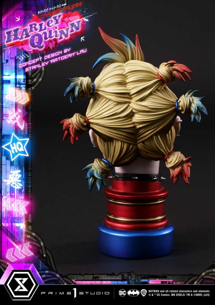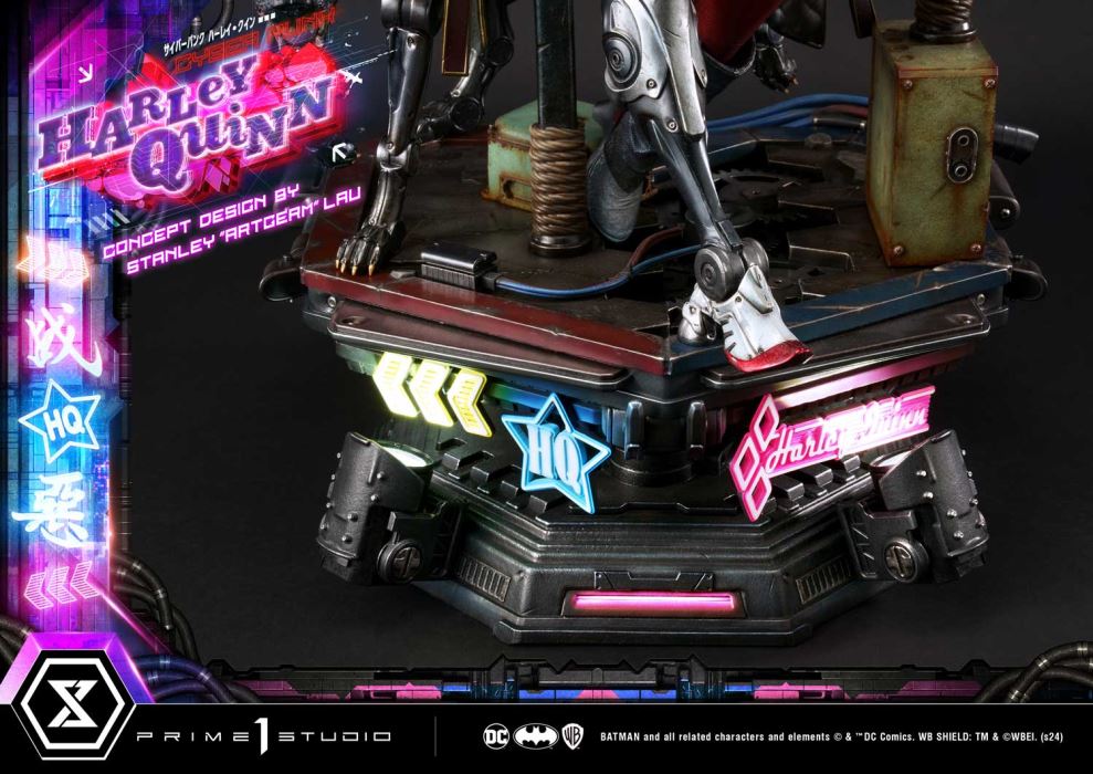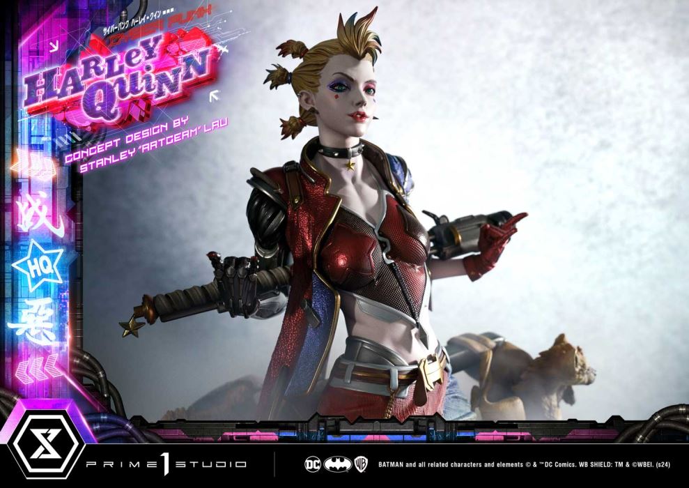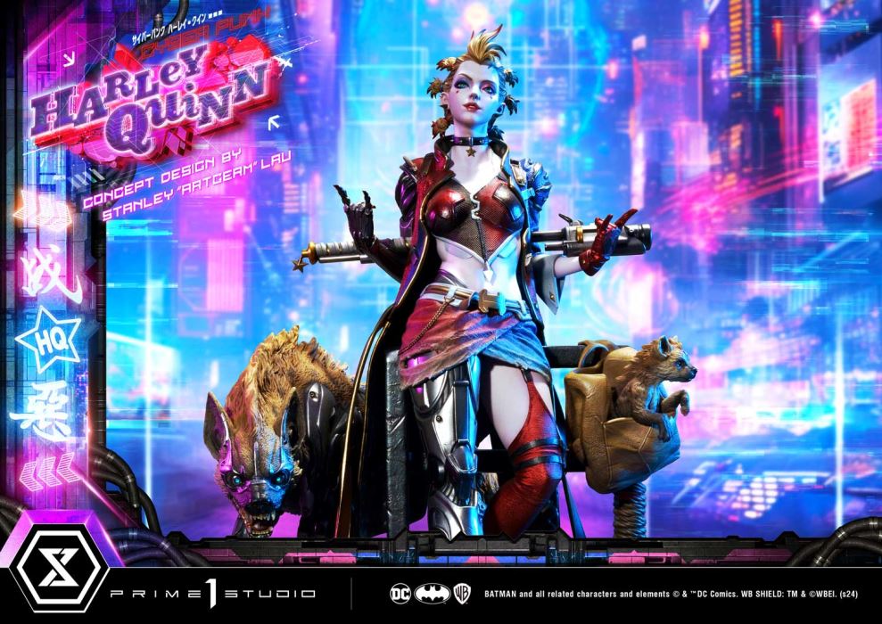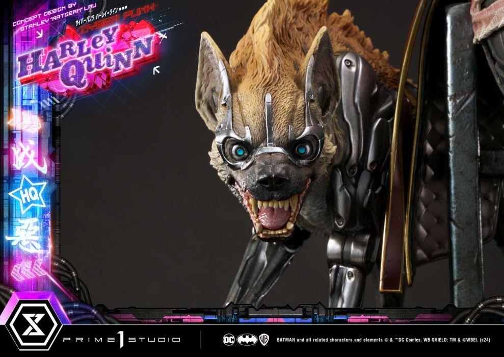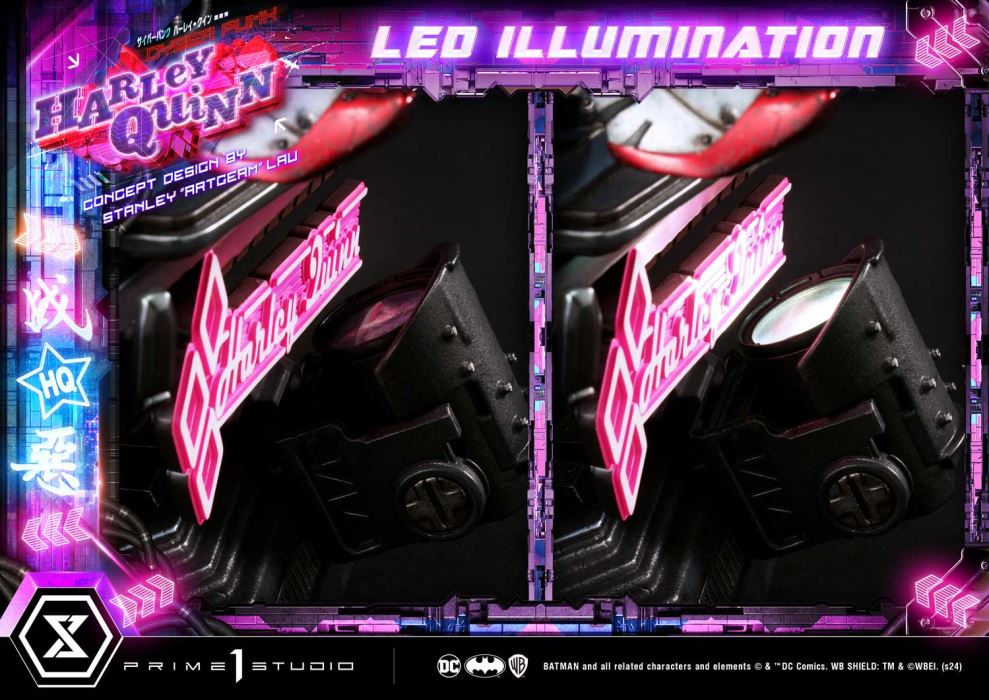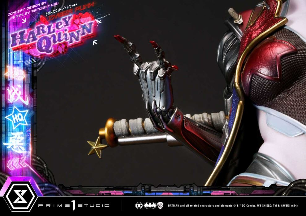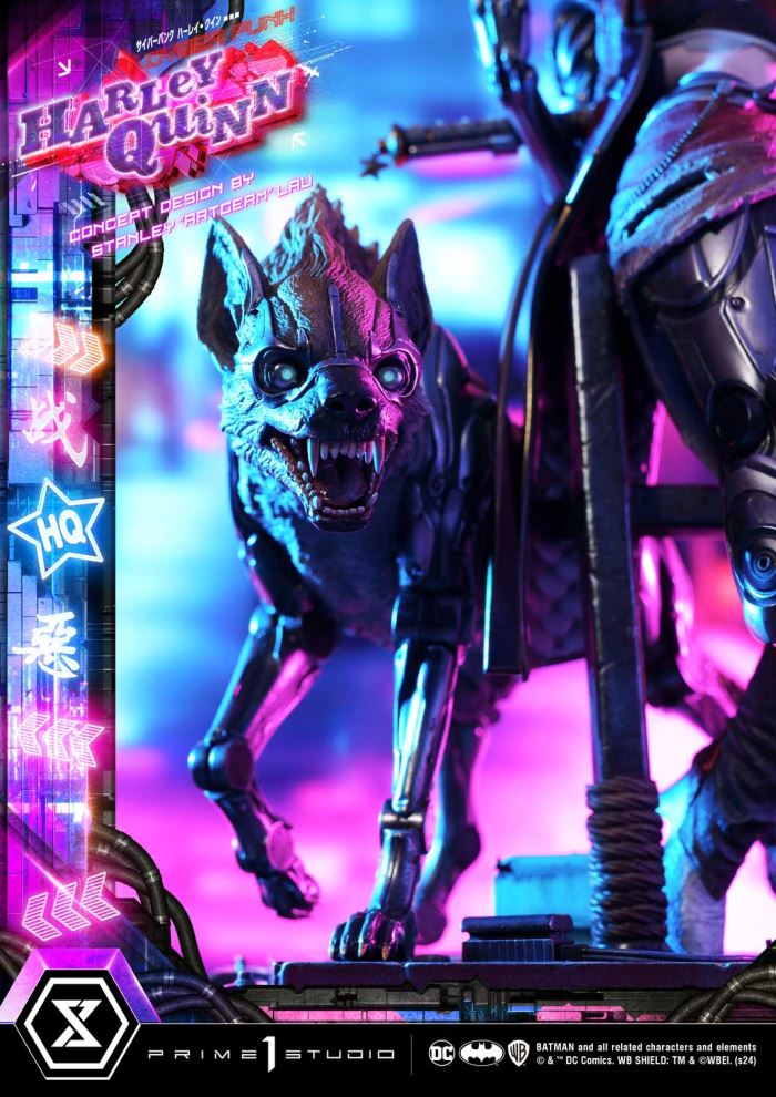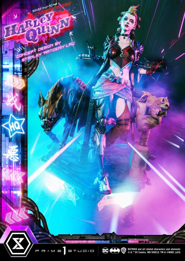 Mama’s gonna paint the streets with blood”Prime 1 Studio is proud to present yet another breathtaking addition to our Ultimate Museum Masterline Series, in collaboration with Stanley “Artgerm” Lau, here is the 1:4 Scale UPMDC-08 Cyberpunk Harley Quinn from DC Comics!This time around, Prime 1 Studio takes you far into the future, to a dystopian Gotham City. The already dark and corrupt Gotham reaches new societal lows as technological advancements reach new highs. The one and only Artgerm has once again come up with a masterful reimagination of our beloved Harley Quinn and the artists at Prime 1 Studio have done an outstanding job at bringing Stanley Lau’s concept to life.Standing over 24 inches tall, this new and improved Harley has been redesigned from head to toe. Her edgy yet playful demeanor is captured in her striking stance, her weapon wedged snugly between her elbows and back as she makes the horn gesture with both hands, exuding a subtle blend of ease but also confidence. Pretty much like every other denizen of Cyberpunk Gotham, she is augmented with cybernetics, technological modifications applied to the human body for improved physical and mental capabilities, blurring the lines between man and machine. Her right-side appendages have been enhanced and completely swapped by cyborg prosthetics. Her attire has also been redesigned to fit her avant-garde futuristic fashion style, while still retaining her signature duality of red and blue. Her initials are featured on the back of her coat. As usual, she is accompanied by her loyal hyenas Bud and Lou, as you can see, cybernetic enhancements aren’t only reserved for humans. They all stand atop a cyberpunk-city-themed base that features LED illumination, it wouldn’t truly be cyberpunk without the neon lights, now, would it? You can display Harley in a softer and poised facial expression or a more rock-edgy tongue-out with the two included head parts, we’ve also thrown in a pair of sunglasses as well as a head base.The Maid of Mischief means business in this cyberpunk Gotham of the future, so be sure not to miss out on this awe-striking redesign by Stanley “Artgerm” Lau and place your pre-order of the UPMDC-08 Cyberpunk Harley Quinn today! Specifications: Statue Size approximately 23.6 inches tall [H:60cm W:36cm D:35cm]Cyberpunk-themed baseLED illuminations on baseTwo (2) Swappable head parts (Normal and Tongue)One (1) Swappable back logoOne (1) pair of sunglassesOne (1) headstands Notice: Prototype samples shown.Product details could be subject to change without further notice.Please note the final product specifications may differ because each product is Handmade.Since the product is still in the development stage, the Size (up to 10%) & Weight (up to 10kg) may be changed during the production stage. BATMAN and all related characters and elements © & ™ DC Comics. WB SHIELD: TM & © WBEI. (s24)DETAILSBrandsPRIME 1 STATUECollectionUltimate Premium MasterlineSeriesDC SeriesScale1/4 ScaleProduct CodeUPMDC-08Product Size Approx.H:60cm W:36cm D:35cmCarton(Est.): 1 boxProduct Weight Approx.About 13.6 kgMaterialsPolystone and other materialsJAN4580708048826