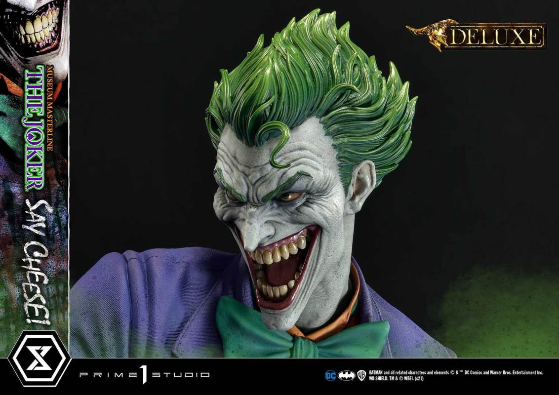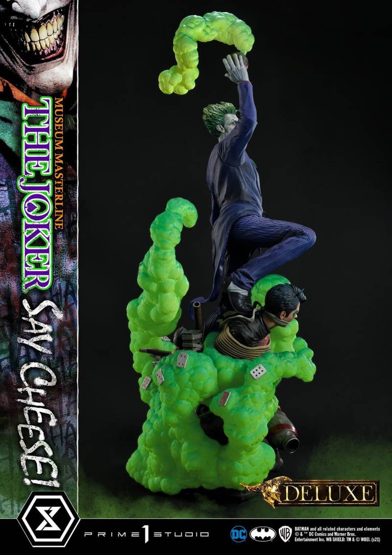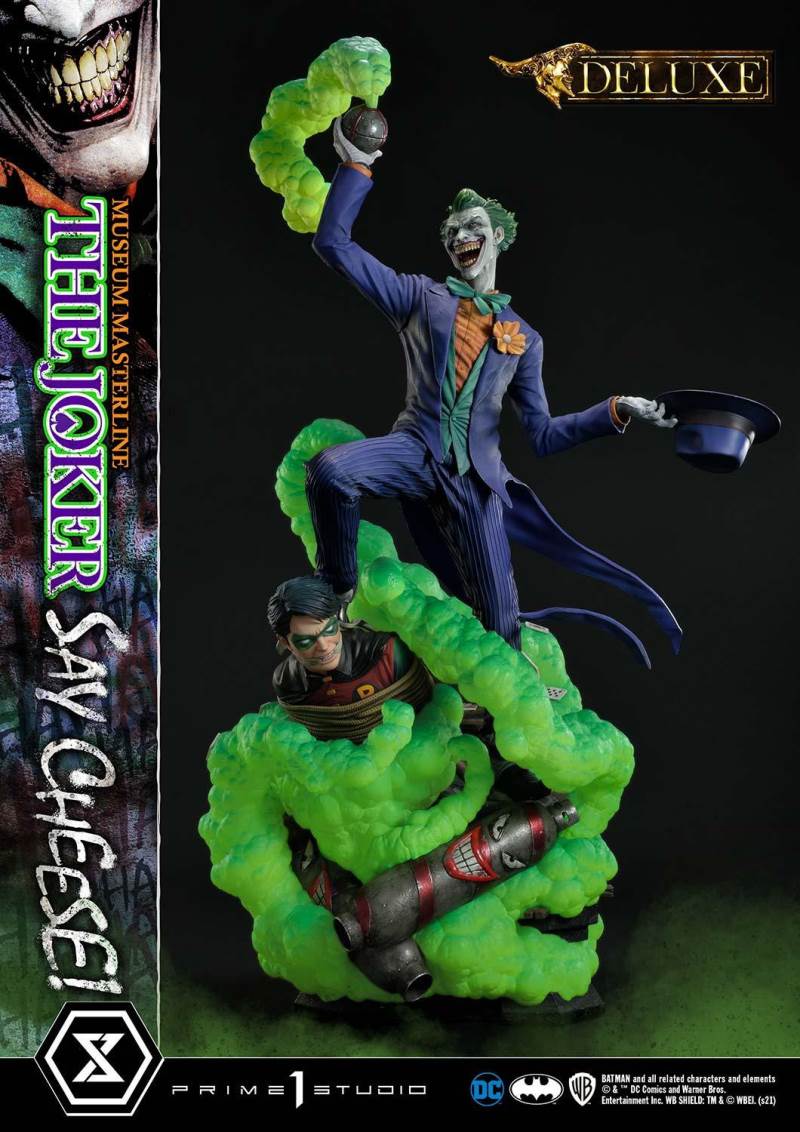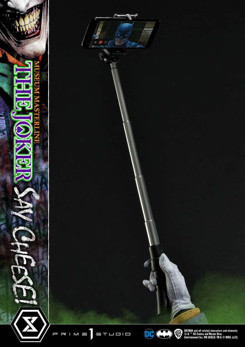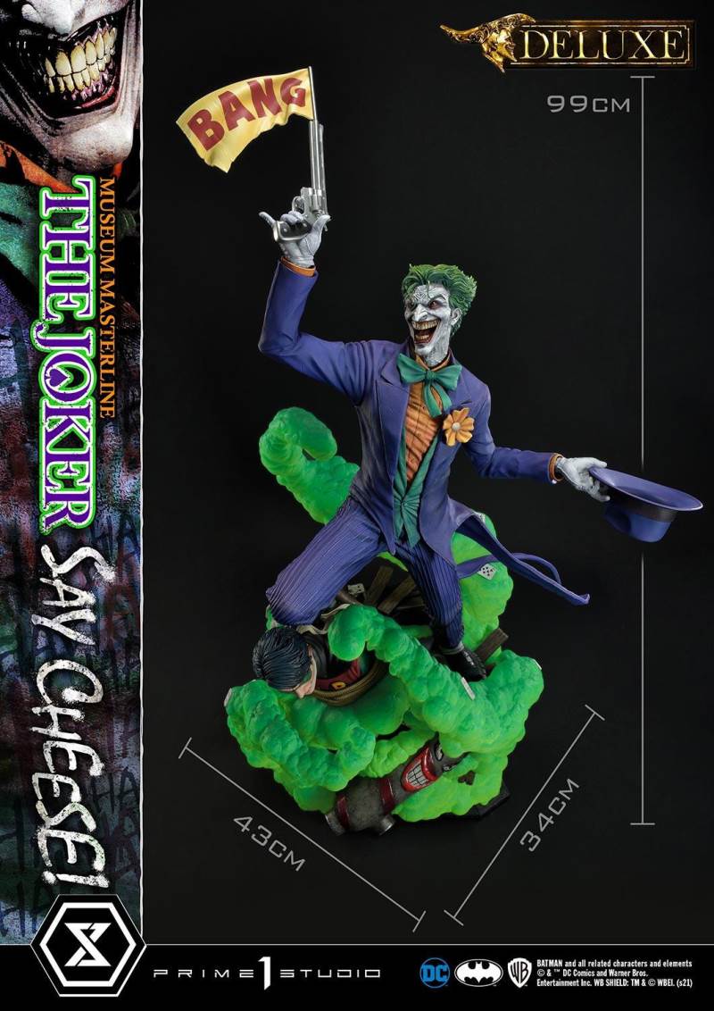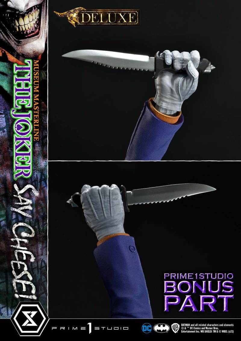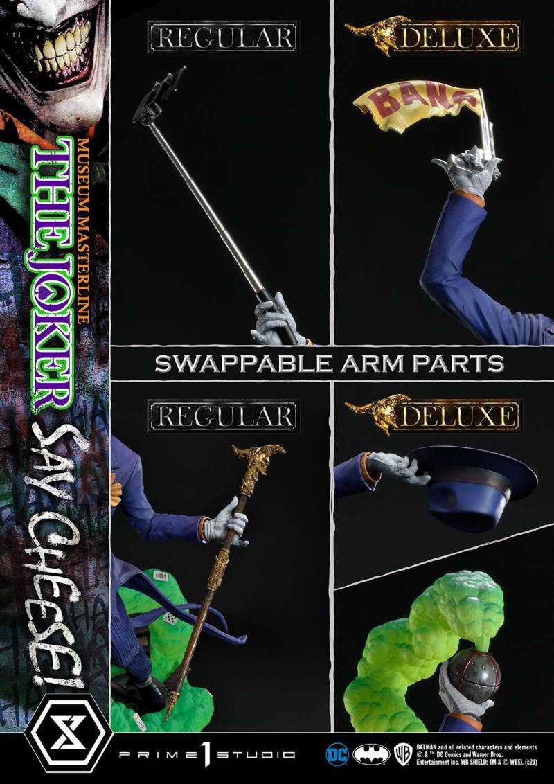 DescriptionsI’m not mad at all! I’m just differently sane!!!Prime 1 Studio is always proud to present the Clown Prince of Crime in our Museum Masterline DC Series, so today, we present our top-of-the-line 1/3 Scale The Joker “Say Cheese” Statue!Perhaps the best thing about The Joker is his immediate recognizability as Batman’s preeminent arch-nemesis and opposite number. He’s an unparalleled DC super-villain who can hold his own against not only The Dark Knight Detective, but also gods, monsters, and other super villains!And that’s why, to celebrate the multitude of ways The Joker is the best super villain ever, Prime 1 Studio offers you, our loyal DC fans, his most expressive statue to date! In the 39 inches tall “Say Cheese”, we find that The Joker has gotten the drop on Robin and bound him tightly! And right as the Ace of Knaves releases an aerosolized version of his toxic Joker Venom, which threatens to suffocate the Boy Wonder, The Joker chooses this exact moment to call The Caped Crusader and taunt him! The Joker truly possesses a warped mind!Prime 1 Studio artists worked together to fully realize the Harlequin of Hate at the top of his game. We have sculpted The Joker’s suit to impeccable exactness, crafting the perfect wrinkles, pleats, seams, and textures to reveal that his style is as important as his substance. The Joker’s grimace carries the fatal malice in his heart as he stares face to face with Batman. We’ve made sure to take our comic book references seriously and sculpt the perfect hair, lines, and expression into The Joker’s face. Our painters have been hard at work rendering this statue with the utmost heightened realism to bring you a dazzlingly colorful figure! The depth and volume of The Joker’s face are subtly rendered with fine airbrushing, his suit is a powerful purple, which sets off the verdant greens of the rest of the statue.In this Deluxe Version, you can swap out The Joker’s selfie stick with two other right arms: an arm holding The Joker’s famous BANG! Flag pistol, or an arm holding a Joker Grenade full of the same toxic Joker Venom gas! As for his left arm, feel free to switch from the finely detailed cane to the left arm holding the purple fedora that completes his stylish ensemble!Best of all, the Deluxe Version includes in total three swappable portraits so that you can pick and choose what look The Joker will have. The many different heads call to mind the many styles that the malevolent mischief-maker has been drawn in. It really lends to The Joker’s versatility as a full-fledged character! See if you can guess which comic book styles they were influenced by! And no matter what your choice is, you will have loads of fun trying on all the different heads and arms this Deluxe Version comes with.Excitingly, if you purchase your The Joker “Say Cheese” statue from our Prime 1 Studio official online store. You will have access to this Deluxe Bonus Version which gets you not one, but two more swappable Right Arms: one Right Arm holding his famous Crowbar, and another Right Arm holding a Knife!Last but not least, The Joker is standing on an imperiled Robin, as Joker Venom gas is quickly enveloping him. Not a mere throwaway base embellishment, this Robin has received as much attention as the rest of the statue in detail and appearance. We’ve imbued the gas swirling around him with an ethereal quality through our lifelike sculpting and talented paintwork. All you need to do is turn the statue to reveal and enjoy even more easter eggs that we’ve included in this one-of-a-kind offering that is sure to delight fans of The Joker and of Prime 1 Studio alike.Since you can never have enough statues of The Joker in your life, hurry and grab this one for yourself today!Specifications:Robin Surrounded by Swirling Joker Venom Gas theme baseTwo (2) Head Stands BustThree (3) Swappable Head PortraitsTwo (2) Swappable Left Arms (Joker Cane, Fedora Hat)Three (3) Swappable Right Arms (Selfie Stick, BANG! Flag Pistol, Joker Grenade)Two (2) Swappable Bonus Right Arms (Crowbar, Knife) [BONUS PART]Notice:Prototype samples shown.Product details could be subjected to change without further notice.Please note the final product specifications may differ because each product is Handmade.Since the product is still in the development stage, the Size (up to 10%) & Weight (up to 10kg) may be changed during the production stage.BATMAN and all related characters and elements © & ™ DC Comics and Warner Bros. Entertainment Inc. WB SHIELD: TM & © WBEI. (s21)