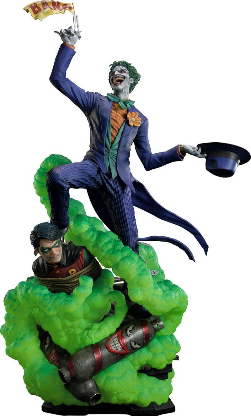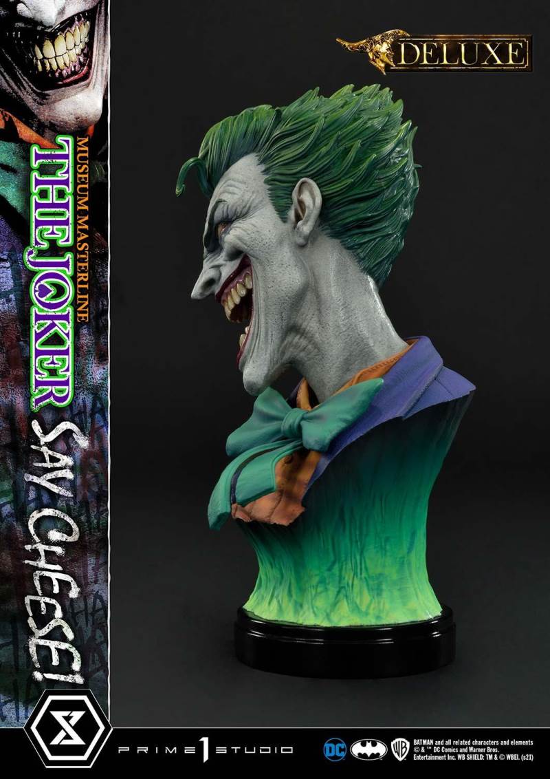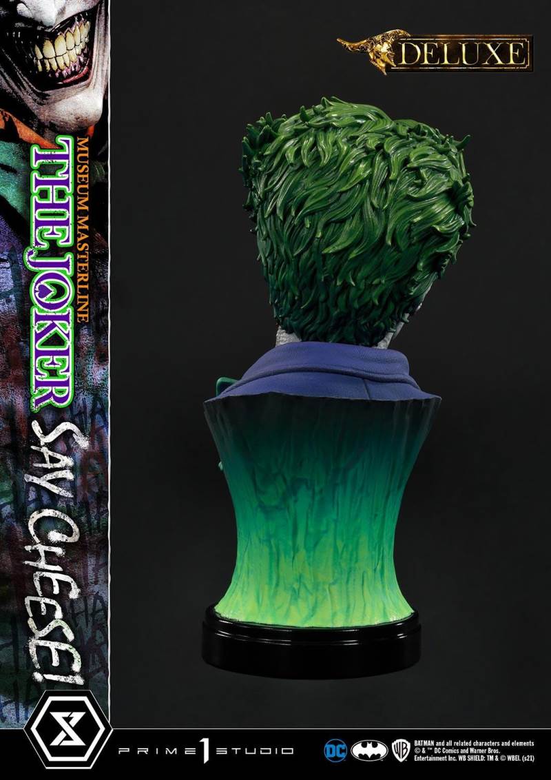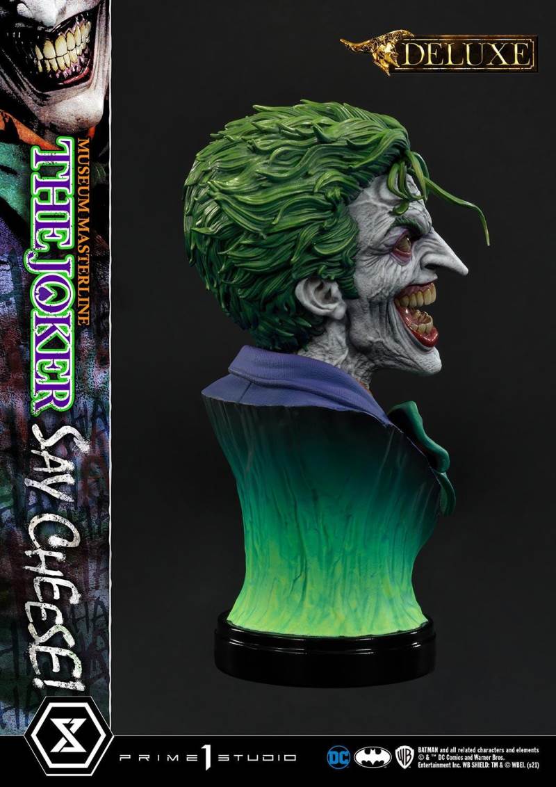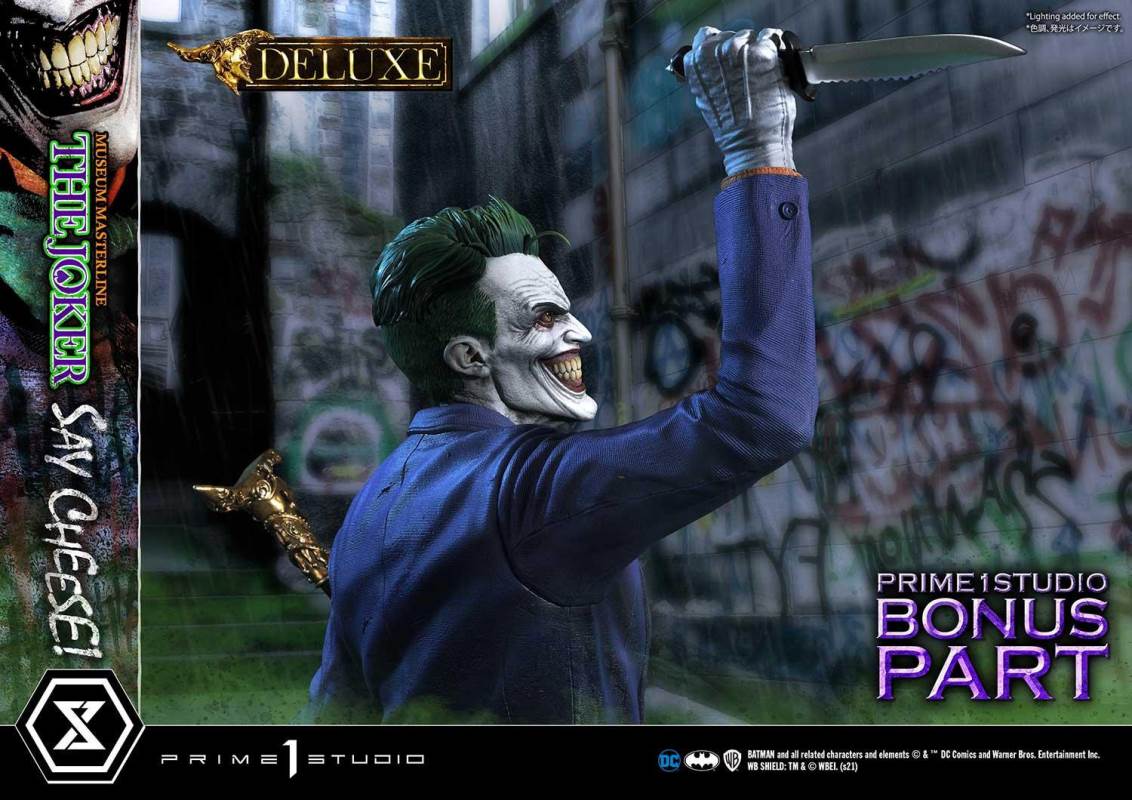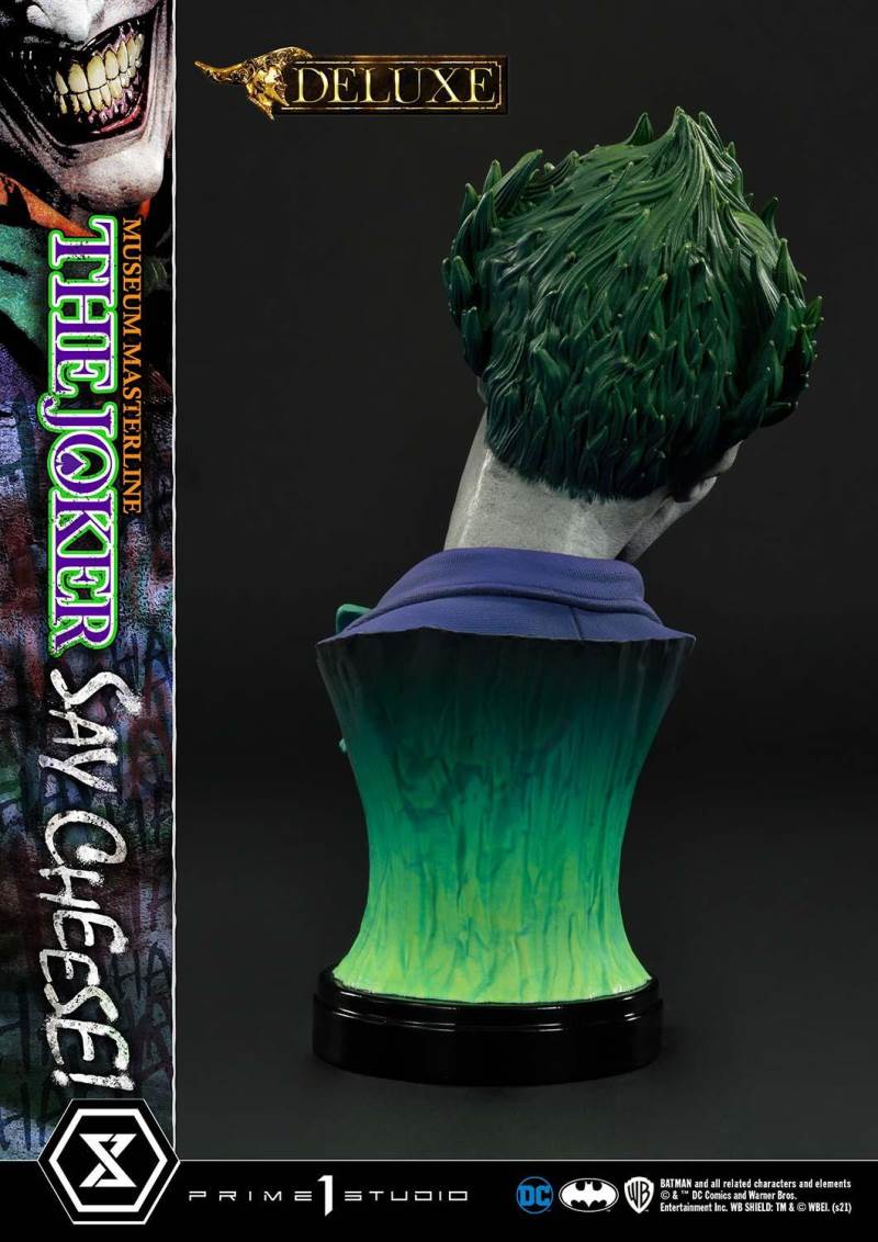 DescriptionsI’m not mad at all! I’m just differently sane!!!Prime 1 Studio is always proud to present the Clown Prince of Crime in our Museum Masterline DC Series, so today, we present our top-of-the-line 1/3 Scale The Joker “Say Cheese” Statue!Perhaps the best thing about The Joker is his immediate recognizability as Batman’s preeminent arch-nemesis and opposite number. He’s an unparalleled DC super-villain who can hold his own against not only The Dark Knight Detective, but also gods, monsters, and other super villains!And that’s why, to celebrate the multitude of ways The Joker is the best super villain ever, Prime 1 Studio offers you, our loyal DC fans, his most expressive statue to date! In the 39 inches tall “Say Cheese”, we find that The Joker has gotten the drop on Robin and bound him tightly! And right as the Ace of Knaves releases an aerosolized version of his toxic Joker Venom, which threatens to suffocate the Boy Wonder, The Joker chooses this exact moment to call The Caped Crusader and taunt him! The Joker truly possesses a warped mind!Prime 1 Studio artists worked together to fully realize the Harlequin of Hate at the top of his game. We have sculpted The Joker’s suit to impeccable exactness, crafting the perfect wrinkles, pleats, seams, and textures to reveal that his style is as important as his substance. The Joker’s grimace carries the fatal malice in his heart as he stares face to face with Batman. We’ve made sure to take our comic book references seriously and sculpt the perfect hair, lines, and expression into The Joker’s face. Our painters have been hard at work rendering this statue with the utmost heightened realism to bring you a dazzlingly colorful figure! The depth and volume of The Joker’s face are subtly rendered with fine airbrushing, his suit is a powerful purple, which sets off the verdant greens of the rest of the statue.In this Deluxe Version, you can swap out The Joker’s selfie stick with two other right arms: an arm holding The Joker’s famous BANG! Flag pistol, or an arm holding a Joker Grenade full of the same toxic Joker Venom gas! As for his left arm, feel free to switch from the finely detailed cane to the left arm holding the purple fedora that completes his stylish ensemble!Best of all, the Deluxe Version includes in total three swappable portraits so that you can pick and choose what look The Joker will have. The many different heads call to mind the many styles that the malevolent mischief-maker has been drawn in. It really lends to The Joker’s versatility as a full-fledged character! See if you can guess which comic book styles they were influenced by! And no matter what your choice is, you will have loads of fun trying on all the different heads and arms this Deluxe Version comes with.Excitingly, if you purchase your The Joker “Say Cheese” statue from our Prime 1 Studio official online store. You will have access to this Deluxe Bonus Version which gets you not one, but two more swappable Right Arms: one Right Arm holding his famous Crowbar, and another Right Arm holding a Knife!Last but not least, The Joker is standing on an imperiled Robin, as Joker Venom gas is quickly enveloping him. Not a mere throwaway base embellishment, this Robin has received as much attention as the rest of the statue in detail and appearance. We’ve imbued the gas swirling around him with an ethereal quality through our lifelike sculpting and talented paintwork. All you need to do is turn the statue to reveal and enjoy even more easter eggs that we’ve included in this one-of-a-kind offering that is sure to delight fans of The Joker and of Prime 1 Studio alike.Since you can never have enough statues of The Joker in your life, hurry and grab this one for yourself today!Specifications:Robin Surrounded by Swirling Joker Venom Gas theme baseTwo (2) Head Stands BustThree (3) Swappable Head PortraitsTwo (2) Swappable Left Arms (Joker Cane, Fedora Hat)Three (3) Swappable Right Arms (Selfie Stick, BANG! Flag Pistol, Joker Grenade)Two (2) Swappable Bonus Right Arms (Crowbar, Knife) [BONUS PART]Notice:Prototype samples shown.Product details could be subjected to change without further notice.Please note the final product specifications may differ because each product is Handmade.Since the product is still in the development stage, the Size (up to 10%) & Weight (up to 10kg) may be changed during the production stage.BATMAN and all related characters and elements © & ™ DC Comics and Warner Bros. Entertainment Inc. WB SHIELD: TM & © WBEI. (s21)