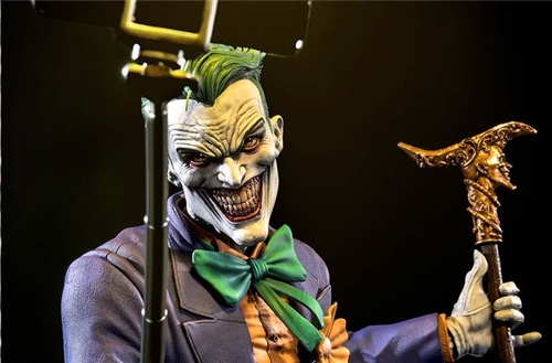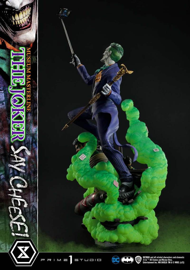 DescriptionsI’m not mad at all! I’m just differently sane!!!Prime 1 Studio is always proud to present the Clown Prince of Crime in our Museum Masterline DC Series, so today we present our top-of-the-line 1/3 Scale The Joker “Say Cheese” Statue!Perhaps the best thing about The Joker is his immediate recognizability as Batman’s preeminent arch-nemesis and opposite number. He’s an unparalleled DC super-villain who can hold his own against not only The Dark Knight Detective, but also gods, monsters, and other super villains!And that’s why, to celebrate the multitude of ways The Joker is the best super villain ever, Prime 1 Studio offers you, our loyal DC fans, his most expressive statue to date! In the 39 inches tall “Say Cheese”, we find that The Joker has gotten the drop on Robin and bound him tightly! And right as the Ace of Knaves releases an aerosolized version of his toxic Joker Venom, which threatens to suffocate the Boy Wonder, The Joker chooses this exact moment to call The Caped Crusader and taunt him! The Joker truly possesses a warped mind!Prime 1 Studio artists worked together to fully realize the Harlequin of Hate at the top of his game. We have sculpted The Joker’s suit to impeccable exactness, crafting the perfect wrinkles, pleats, seams, and textures to reveal that his style is as important as his substance. The Joker’s grimace carries the fatal malice in his heart as he stares face to face with Batman. We’ve made sure to take our comic book references seriously and sculpt the perfect hair, lines and expression into The Joker’s face. Our painters have been hard at work rendering this statue with the utmost heightened realism to bring you a dazzlingly colorful figure! The depth and volume of The Joker’s face are subtly rendered with fine airbrushing, his suit is a powerful purple, which sets off the verdant greens of the rest of the statue.We’ve equipped The Joker with a mobile phone on a selfie stick, with which he is probably offering The Batman some sort of last-minute deal for Robin’s life. While in his other hand, we’ve crafted a finely detailed cane, which shows off the level of care and craftsmanship we have put into this creation!Last but not least, The Joker is standing on an imperiled Robin, as Joker Venom gas is quickly enveloping him. Not a mere throwaway base embellishment, this Robin has received as much attention as the rest of the statue in detail and appearance. We’ve imbued the gas swirling around him with an ethereal quality through our lifelike sculpting and talented paintwork. All you need to do is turn the statue to reveal and enjoy even more easter eggs that we’ve included in this one-of-a-kind offering that is sure to delight fans of The Joker and of Prime 1 Studio alike.Since you can never have enough statues of The Joker in your life, hurry and grab this one for yourself today!Specifications:Robin Surrounded by Swirling Joker Venom Gas theme baseNotice:Prototype samples shown.Product details could be subjected to change without further notice.Please note the final product specifications may differ because each product is Handmade.Since the product is still in the development stage, the Size (up to 10%) & Weight (up to 10kg) may be changed during the production stage.BATMAN and all related characters and elements © & ™ DC Comics and Warner Bros. Entertainment Inc. WB SHIELD: TM & © WBEI. (s21)