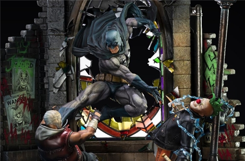 เราเห็นอัศวินดำโจมตีอาชญากรสองคนที่นี่โดยข้ามหน้าต่างกระจกสีที่ได้รับแรงบันดาลใจจาก Cover of Batman # 50 จาก Ultimate Comics แสดงให้เห็นภาพของคู่ต่อสู้ที่เลวร้ายที่สุดของเขาในขณะที่การแต่งหน้าตัวตลกของผู้โจมตีทั้งสองแสดงให้เห็นถึงความสัมพันธ์กับเขา โจ๊กเกอร์ที่น่าอับอาย