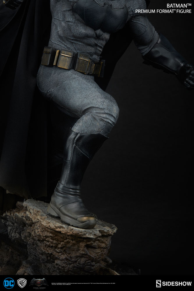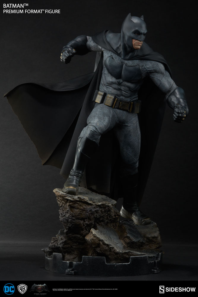 ABOUT THIS PREMIUM FORMAT™ FIGURE“Do you bleed? You will.”Boom! We just can’t get enough of Batman v Superman: Dawn of Justice, as Sideshow introduces the Batman Premium Format™ Figure.The impressive 20” tall polystone statue is clad in a faux-leather cape and movie-accurate suit with striking details based on Batman’s actual costume from the epic film. Ready to take on the son of Krypton, the caped crusader joins Sideshow’s Premium Format™ collection in this dark, powerful recreation of Ben Affleck’s likeness from the film.Don’t fear the bat, just bring him home!LicenseDC ComicsTypePremium Format™ FigureManufacturerSideshow CollectiblesArtistsRachel Roubicek (Design)Martin Canale (Design)David Giraud (Sculpt)Walter O'Neal (Sculpt)Alfred Paredes (Sculpt)Simon Garcia (Mold & Cast)Chadwick Andersen (Mold & Cast)Bernardo Esquivel (Paint)Tim Hanson (Costume Fabrication)The Sideshow Design and Development TeamADDITIONAL DETAILS & DIMENSIONSProduct Size20 H (508mm) x 14 W (355.6mm) x 15 L (381mm)*Box Size16.00 H (406.4mm) x 21.00 W (533.4mm) x 25.00 L (635mm)*Product Weight15.00 lbs (6.8 kg)*Dimensional Weight37.0000 lbs*Int'l Dim. Weight51.0000 lbs** Size and weight are approximate values.SKU300386UPC747720229631BATMAN V SUPERMAN: DAWN OF JUSTICE and all related characters and elements © & ™ DC Comics and Warner Bros. Entertainment Inc. (s16)
