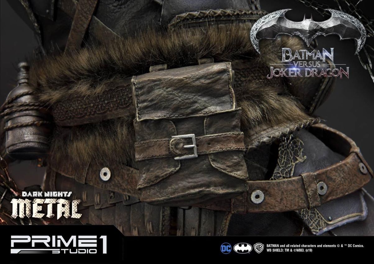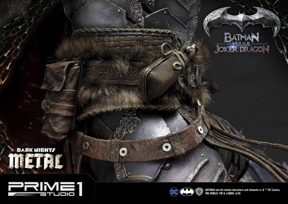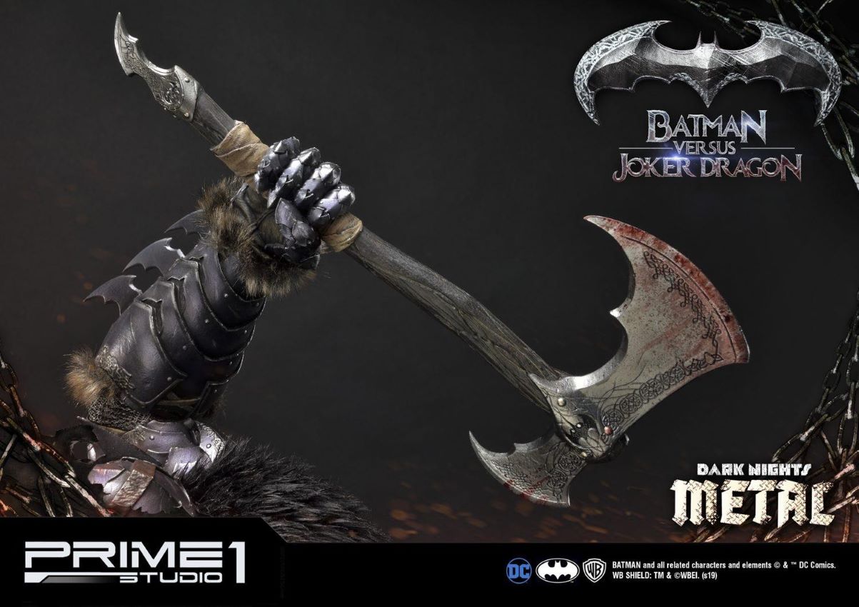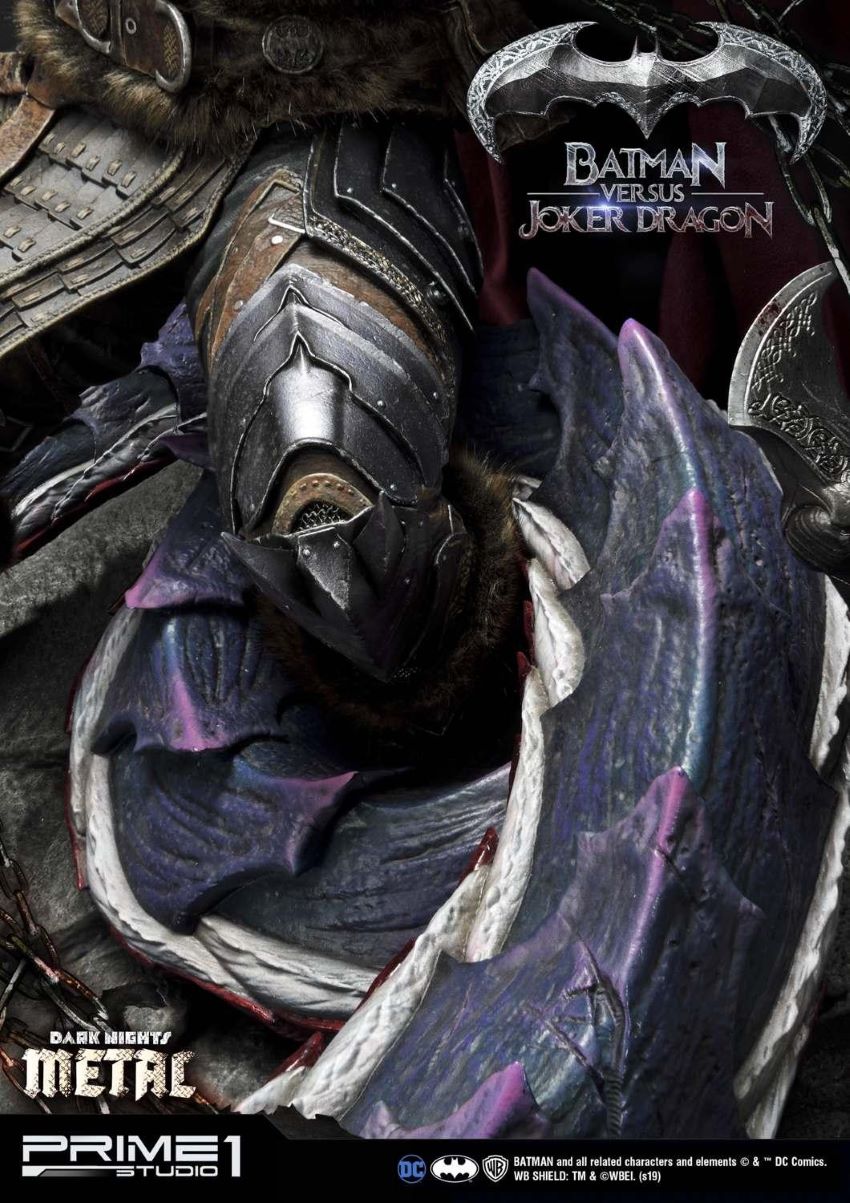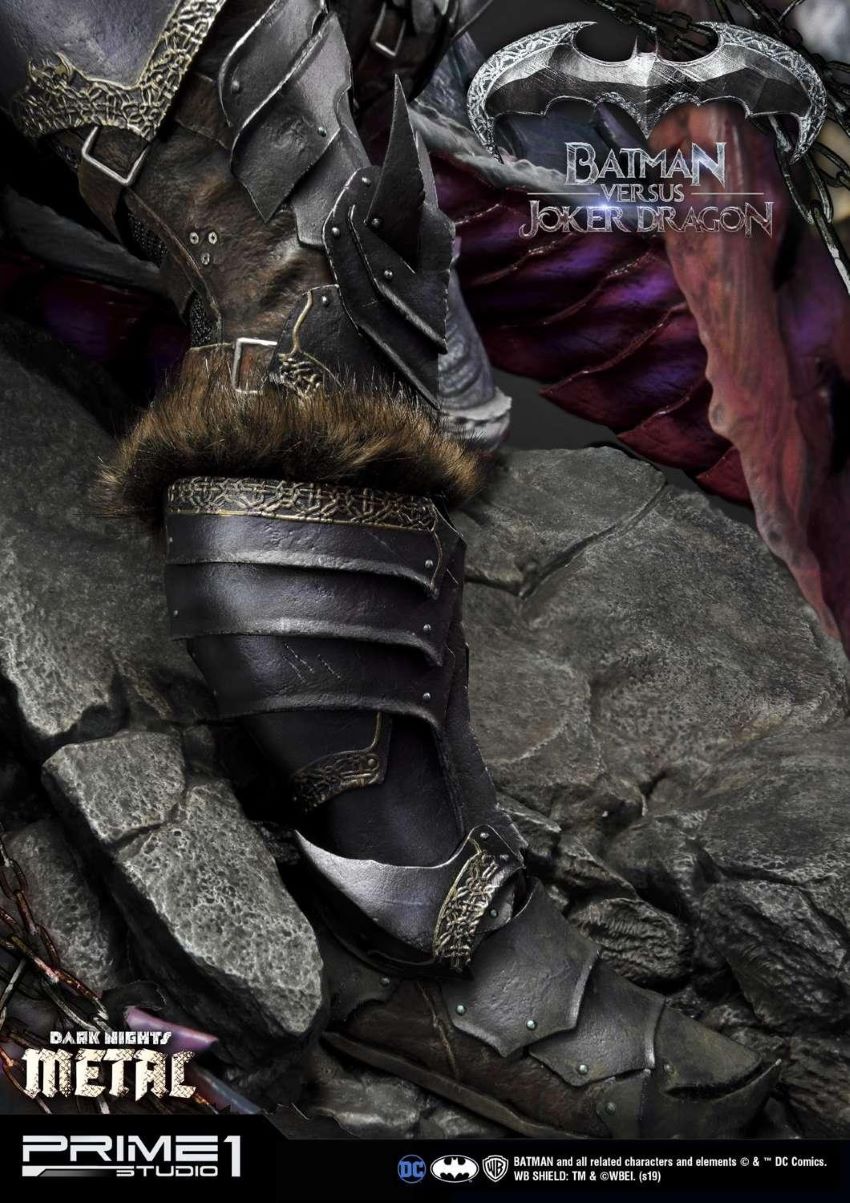 DescriptionsPrime 1 Studio is excited to present the second product of Dark Nights: Metal Comics series: MMDCMT-02 Batman Versus Joker Dragon Statue.The story involves Batman discovering a dark multiverse that exists beneath the core DC multiverse. Eventually he discovers seven evil versions of himself from the dark multiverse that are led by the dark god known as Barbatos.We created an epic statue of a Batman in a Knight Armor fighting a Dragon with Joker’s characteristics. It is a beautifully crafted diorama with an exceptional attention to details starting with faux fur elements of Batman’s armor and ending with a very realistic texture of the statue. The statue tells us a story of a bloody and fierce battle full of naturalistic features.The Batman Versus Joker Dragon Statue stands approximately 34 inches tall and it is a must have for all DC Comics Dark Nights: Metal fans! A great piece to add in your collection with Batman Who Laughs from the same series.Specifications:Statue Size approximately 34 inches tall [H:86.9cm W:77.9cm D:59.3cm]One (1) designed theme baseNotice:Prototype samples shown.Product details could be subjected to change without further notice.BATMAN and all related characters and elements © & ™ DC Comics and Warner Bros. Entertainment Inc. WB SHIELD: TM & © WBEI. (s19)