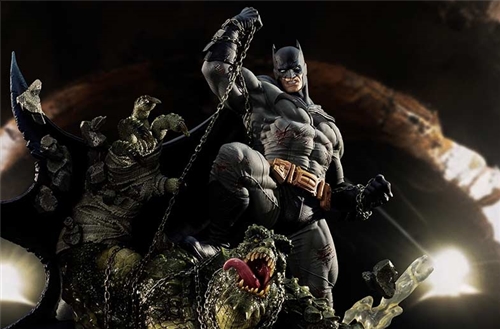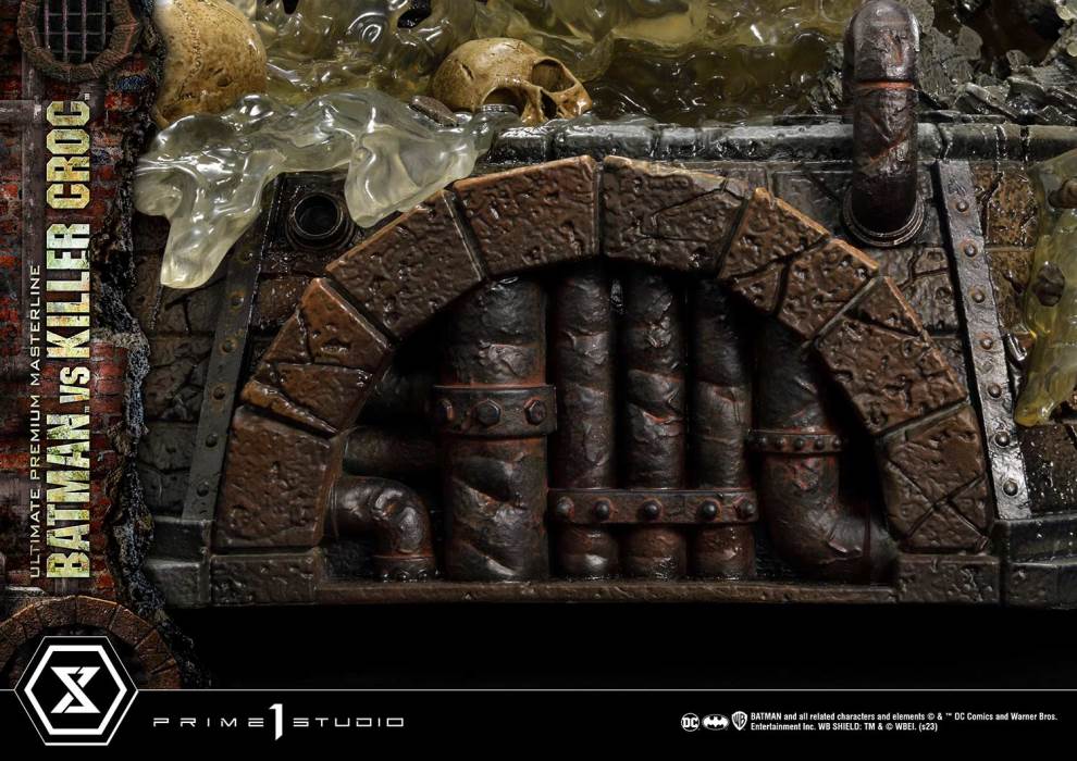 You're just in time... cuz the bird wasn't enough. And now I'm hungry for bat. - Killer CrocThe epic Batman vs. Killer Croc diorama, erupting in the dark depths of Gotham City's sewers, has been intricately brought to life. This Ultimate Premium Masterline rendition showcases the relentless struggle between Batman, the city's guardian, and the formidable Killer Croc, all captured with striking detail.Witness the intense confrontation that unfurled in the underbelly of Gotham - Batman vs. Killer Croc. This Ultimate Premium Masterline collectible reimagines the visceral clash between the iconic Dark Knight and the monstrous Killer Croc with impeccable craftsmanship. In this dynamic statue, Batman takes on Waylon Jones, aka Killer Croc with just his bare hands and a chain in the dark underground sewers of Gotham. The massive battle-damaged reptilian creature suffocated by the Dark Knight flounders in the rancid waters as debris hurtles around them. Every muscle, wound, and chain is masterfully sculpted, capturing every detail of this element rich scene to encapsulate the ferocity of their battle. The base, designed to replicate the grimy sewers of Gotham, evokes an atmosphere of unease with splashing water, scattered debris and skulls, and even watchful rats.Get ready to relive the sparks flying in this savage sewage battle, as the Dark Knight confronts the mighty Killer Croc. This collectible offers a stunning display of their high-stakes confrontation, meticulously sculpted to perfection. Don't miss out on this extraordinary narrative collector's gem that adds an extra layer of excitement to your collection room. Specifications:Statue Size Approximately 28 inches [H: 71cm W: 59cm D: 54cm]Gotham Sewer-themed base Notice: Prototype samples shown.Product details could be subject to change without further notice.Please note the final product specifications may differ because each product is Handmade.Since the product is still in the development stage, the Size (up to 10%) & Weight (up to 10kg) may be changed during the production stage. BATMAN and all related characters and elements © & ™ DC Comics and Warner Bros. Entertainment Inc. WB SHIELD: TM & © WBEI. (s23) DETAILSBrandsPRIME 1 STATUECollectionUltimate Premium MasterlineSeriesBatman SeriesScale1/4 ScaleProduct CodeUPMDC-07Product Size Approx.H:71cm W:59cm D:54cmCarton(Est.): 2 boxesProduct Weight Approx.About 28.6 Kg(*)MaterialsPolystone and other materialsJAN4580708048451