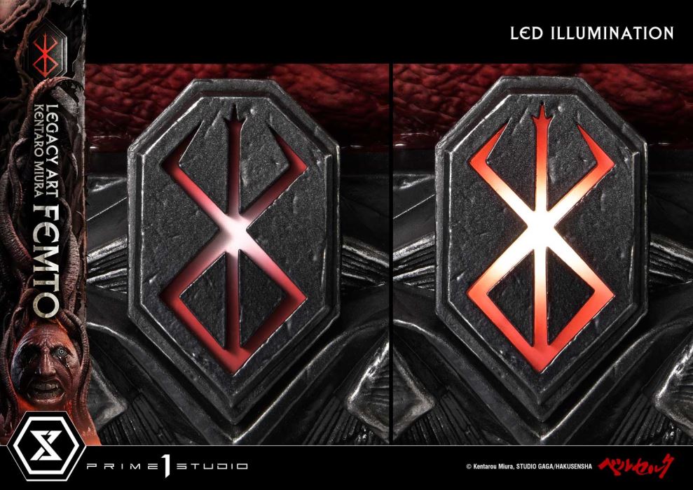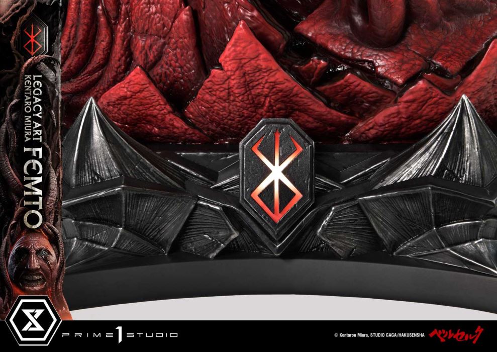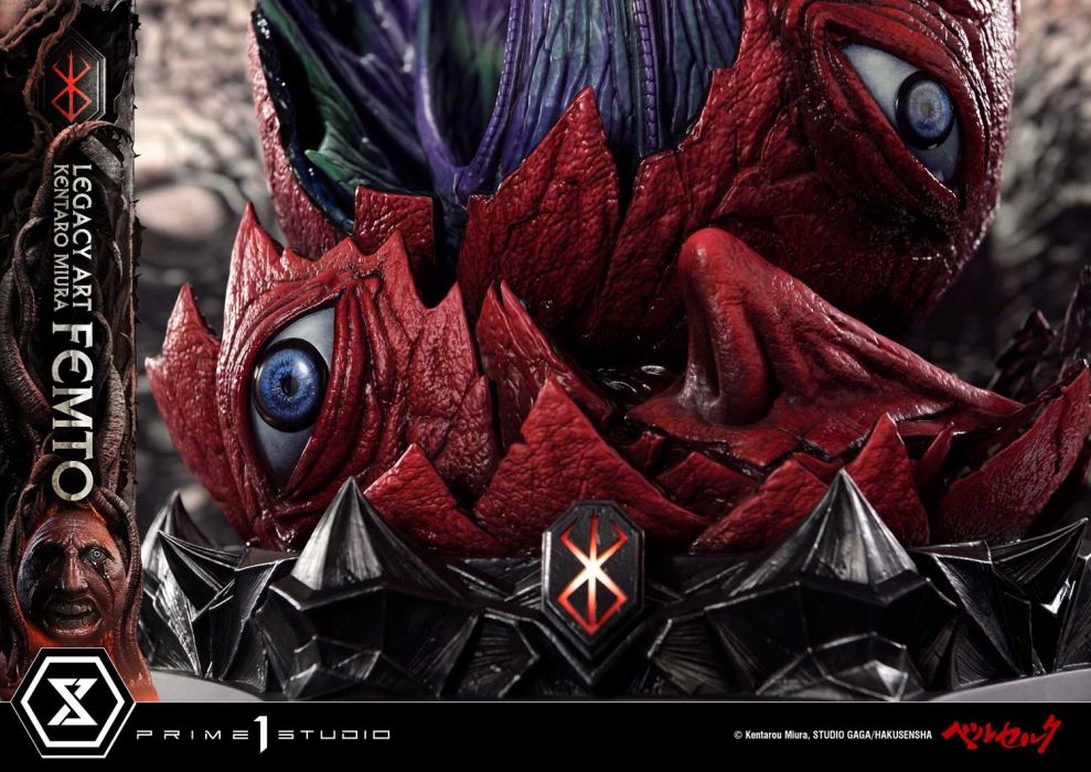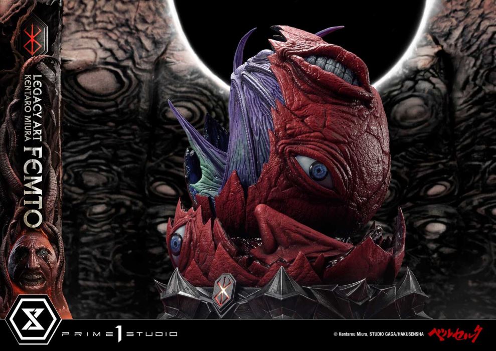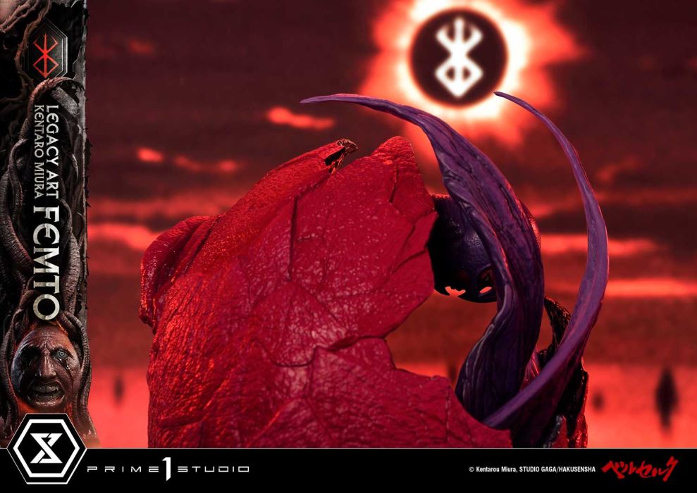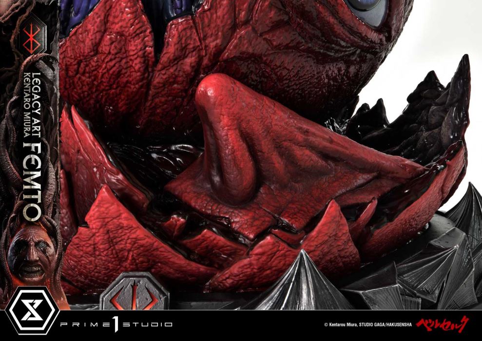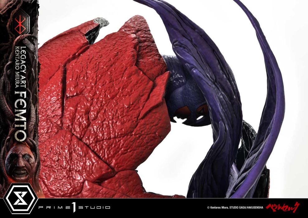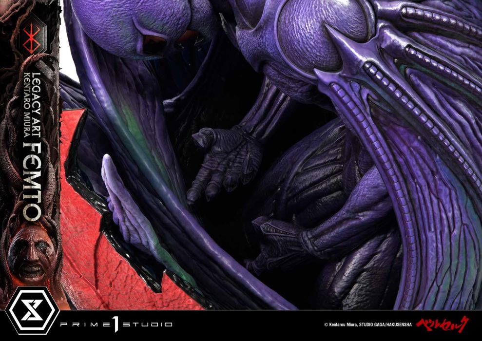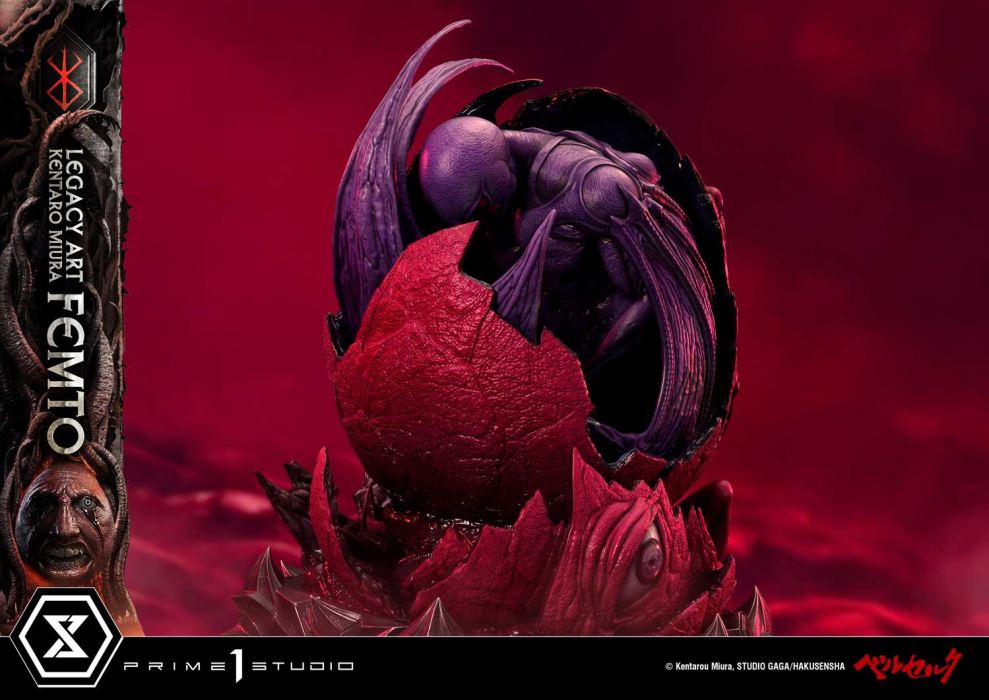 Guided by causality, darkness eclipses light.The Fifth is born, true to the depth of the original art.From the dark fantasy Berserk, comes Legacy Art 'Kentaro Miura', a series that brings to life the unique artistry left behind by the legendary mangaka. Now, the latest addition to this line features none other than Femto, the Hawk of Darkness!Femto, the fifth member of the God Hand, was born during the Eclipse, which occurs once every 216 years, after offering his Band of the Falcon and his one true friend as sacrifices. This piece is modeled after the cover of Volume 12 of the original manga, capturing the iconic scene that symbolizes causality. The weighty, oil-paint-like texture is recreated in polystone, bringing this moment to life in three dimensions.Viewed from the front, the statue mirrors the original illustration perfectly. The bottomless fear, inhuman power, and insatiable longing are all conveyed through its beautiful form. Special care has been taken with the composition of the unseen sides and back as well. The expression beneath the helmet is entirely original, with hollow eyes and cracked skin, evoking the absence of the man who once was Griffith.The helmet’s textured surface, the massive wings shaded with purples and greens, and the pale highlights on his cheeks – every detail has been painted to replicate Miura-sensei’s delicate yet powerful art style. The eye of The Beherit is made of clear parts, giving the iris an eerie vibrancy, while the sacrificial brand embedded in the sinister base glows ominously thanks to an internal LED, heightening the sense of despair in a way only a three-dimensional piece can.In addition, this bonus version comes with a crimson Beherit, The Egg of the King. The eerie face, aligned in its proper position, sheds endless tears of blood as if summoning the Guardian Angels themselves.This moment, where darkness eclipses light in three dimensions, is a gift to Berserk fans around the world!Specifications:Berserk Themed Base (with LED Illumination)The Egg of the King [BONUS PART] LED Power Supply Method: TBA* Please prepare batteries, USB cables, or other necessary items depending on the final power supply method.Notice:Prototype samples shown.Product details could be subject to change without further notice.Please note the final product specifications may differ because each product is Handmade.Since the product is still in the development stage, the Size (up to 10%) & Weight (up to 10kg) may be changed during the production stage.©三浦建太郎・スタジオ我画/白泉社DETAILSBrandsPRIME 1 STATUECollectionLegacy Art Kentaro MiuraSeriesBerserkScale1/4 ScaleProduct CodeLABR-04SProduct Size Approx.H:46cm W:44cm D:39cmH:19cm W:10cm D:11cm (The Egg of the King)Carton(Est):1 boxProduct Weight Approx.19 kgMaterialsPolystone and other materialsJAN4582647120489