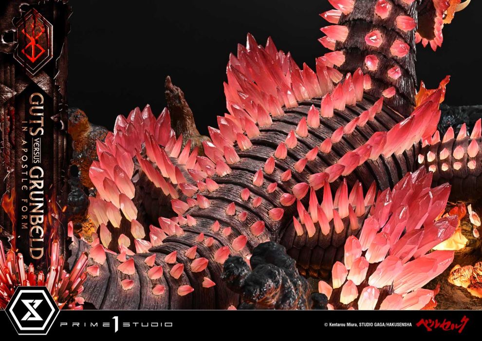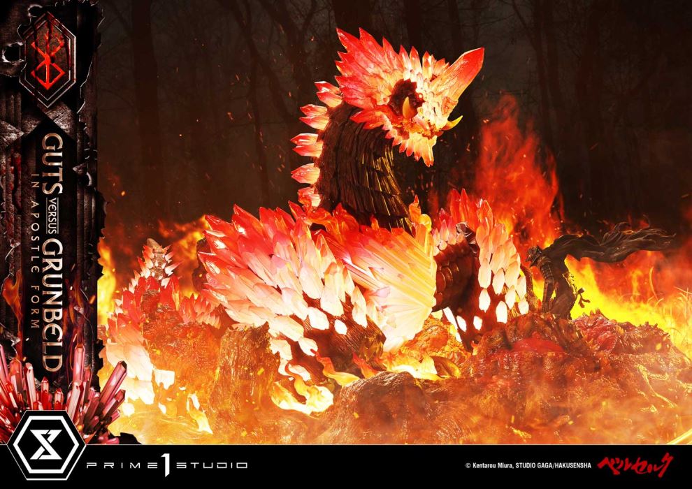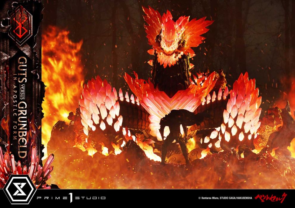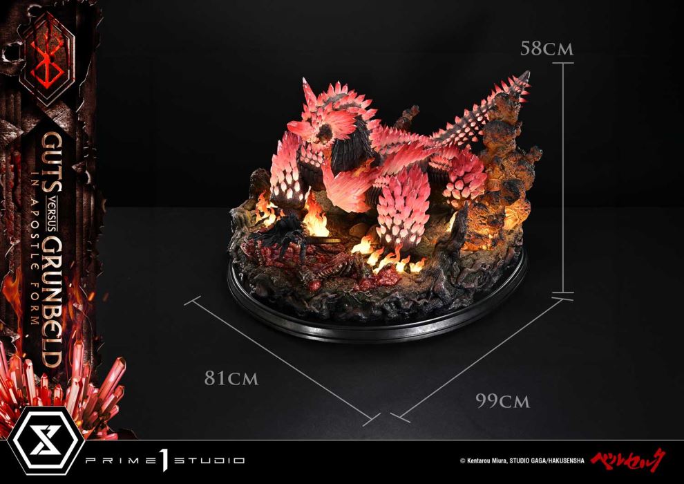 Patron Bonus PartReceive the Berserker Armor (Pre-Equip) as a Special GiftIn the burning Forest of the Spirit Tree, a colossal Apostle arises.Berserker versus the Flame Dragon—Act II, immortalized in diorama form.Encased in the cursed armor, Guts faces Grunbeld in his true Apostle form. The fierce battle from Volume 27 of Berserk takes shape within the Ultimate Diorama Masterline.Inspired by the double-spread illustration depicting their confrontation, this diorama reimagines the entire scene with creative interpretation. Each panel featuring the two was analyzed in-depth to determine their scale balance, posing, and layout. Spanning over 80 cm in width, the piece captures the overwhelming tension between two warriors who have crossed the line into madness.Grunbeld’s massive body combines rugged surface textures with clear parts reminiscent of red crystal, evoking both his strength and fiery intensity. Guts, too, is sculpted with remarkable precision—from his billowing cape and blood-soaked Dragonslayer to the distinct glint in each eye of his Berserker Armor. The level of detail far exceeds what one would expect from this scale.The circular base, depicting the Forest of the Spirit Tree, serves as a key visual element. Fallen Apostles and motionless golems silently tell the story of a brutal struggle, bringing to life the aftermath of an apocalyptic clash.Complementing the sculpt and paintwork is the built-in LED lighting system. True to the title Flame Dragon, Grunbeld radiates with fiery brilliance, while the tranquil forest is consumed by rising flames—translating the manga’s intensity directly into the display.For dedicated fans, a special Patron Bonus Part is also included. Customers who purchase this product together with one eligible companion product (either of the two designated items) will receive an exclusive Berserker Armor (Pre-Equip) display model—depicting the Berserker Armor at the shrine, awaiting its destined bearer. Please refer to the details in the bonus section.A monumental diorama capturing Act II of the Berserker versus the Flame Dragon. One of the most iconic battles in Berserk, brought from the page to your collection room.Specifications:Berserk-themed BaseLED Illumination (Grunbeld, Base Flames)LED Power Supply Method: TBD* Please prepare batteries, USB cables, or other necessary items depending on the final power supply method.Patron Bonus Part Berserker Armor (Pre-Equip)Product Size Approx. H:14cm W:14cm D:12cm / Product Weight Approx. 59.5 kg(including patron bonus part)[Patron Bonus Eligibility Conditions]Customers who purchase this product along with one of the eligible products from the official online store will receive the Patron Bonus Part as a free gift.Eligible Store: Prime 1 Studio Official Online StorePatron Bonus Part: Berserker Armor (Pre-Equip)Eligible Products:- Ultimate Premium Masterline Berserk Guts, Berserker Armor Grunbeld VS Guts Deluxe Bonus Version- Ultimate Premium Masterline Berserk Grunbeld Grunbeld VS Guts Bonus Version*Please note: If your order for an eligible product is canceled, you will no longer be entitled to receive the Patron Bonus.*We will contact those who are eligible for the Patron Bonus at a later date. Notice:Prototype samples shown.Product details could be subject to change without further notice.Please note the final product specifications may differ because each product is Handmade.Since the product is still in the development stage, the Size (up to 10%) & Weight (up to 10kg) may be changed during the production stage.© Kentarou Miura, STUDIO GAGA/HAKUSENSHA