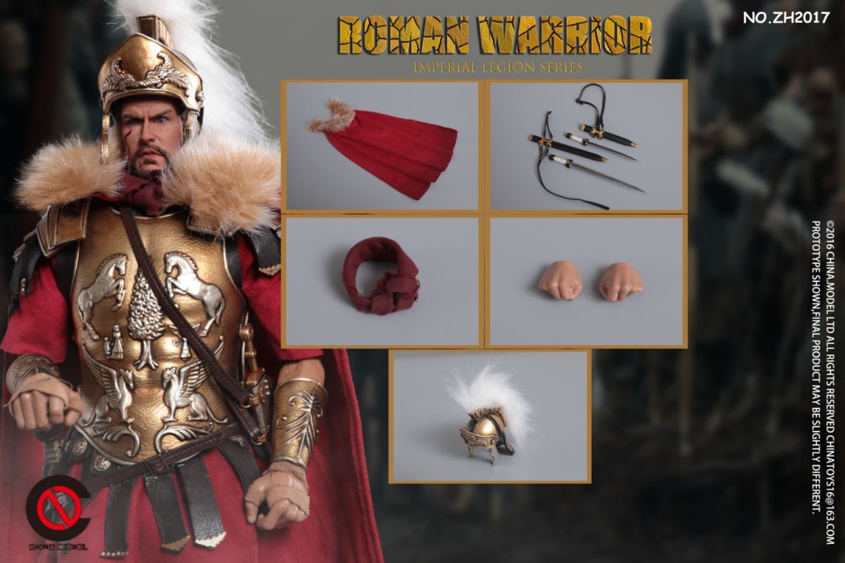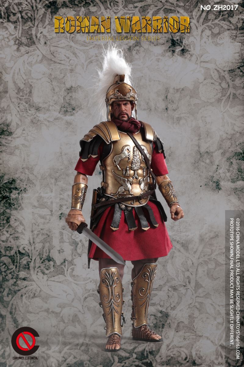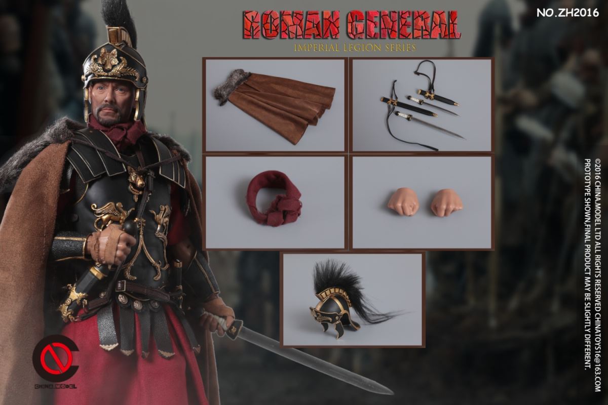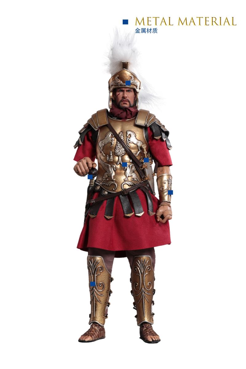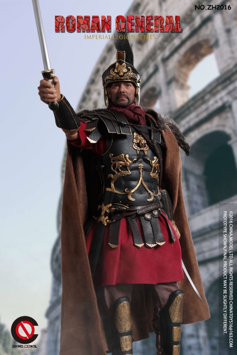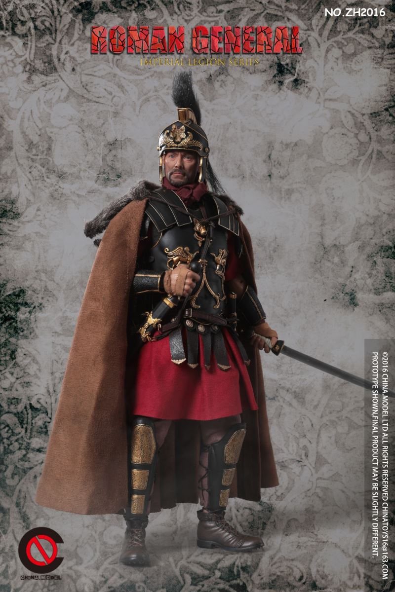 CHINA. Model No: zh016 1:6 black gold Roman general movable dollMaterial: metal, cloth, plasticAccessories list:1 head carving1 elementHand type 2 pairs1 piece of clothes1 pair of trousers1 pair of shoes1 CloakLeather Armor 1 piece1 BreastplateShoulder armor 1 pieceOne leg armor1 wrist guard1 scarfHelmet 1 setLong sword 1 set1 set of dagger