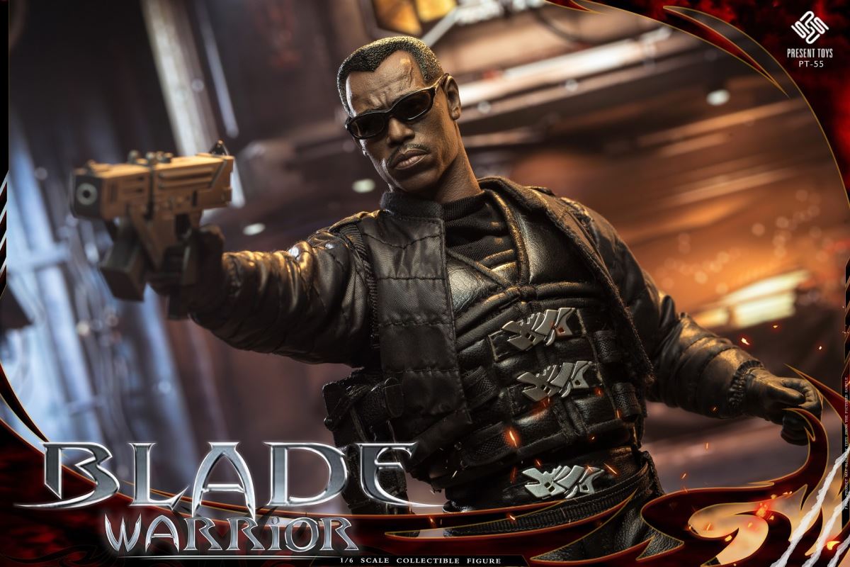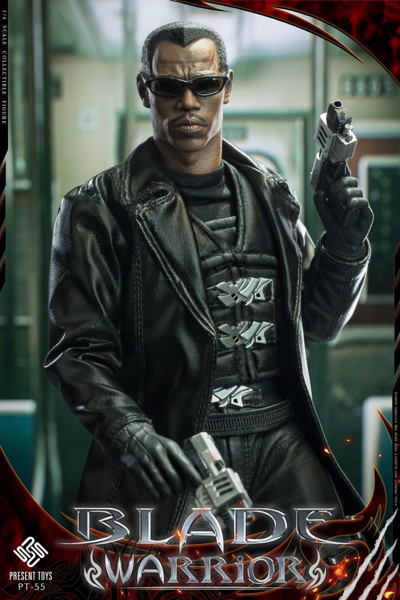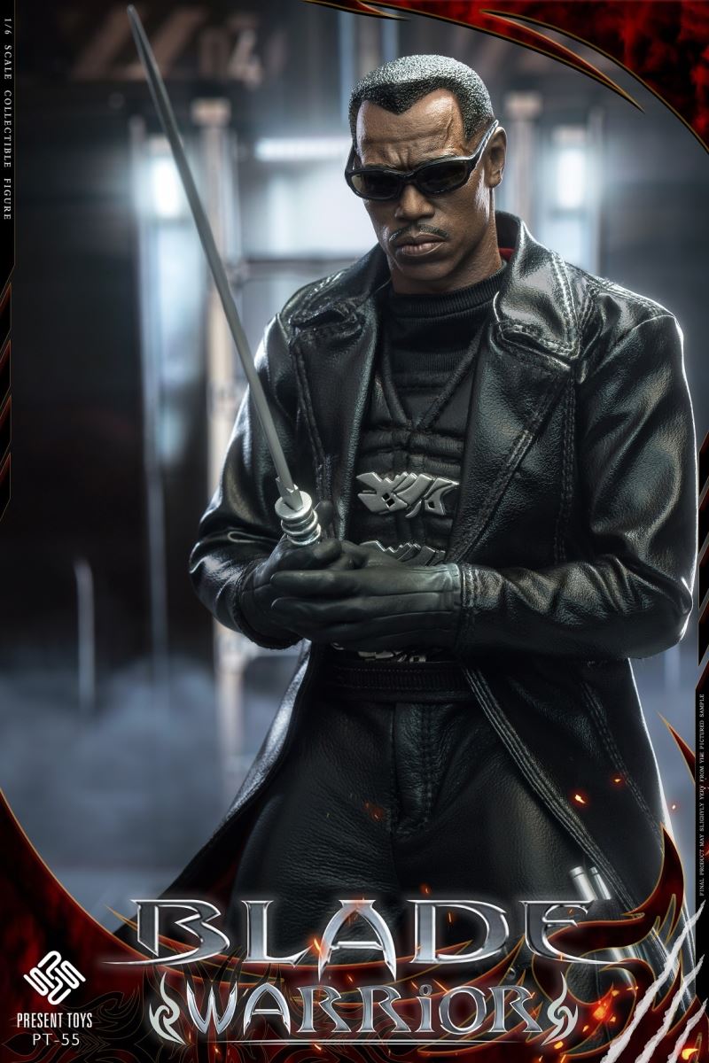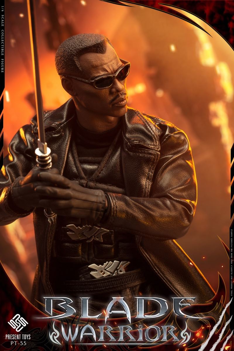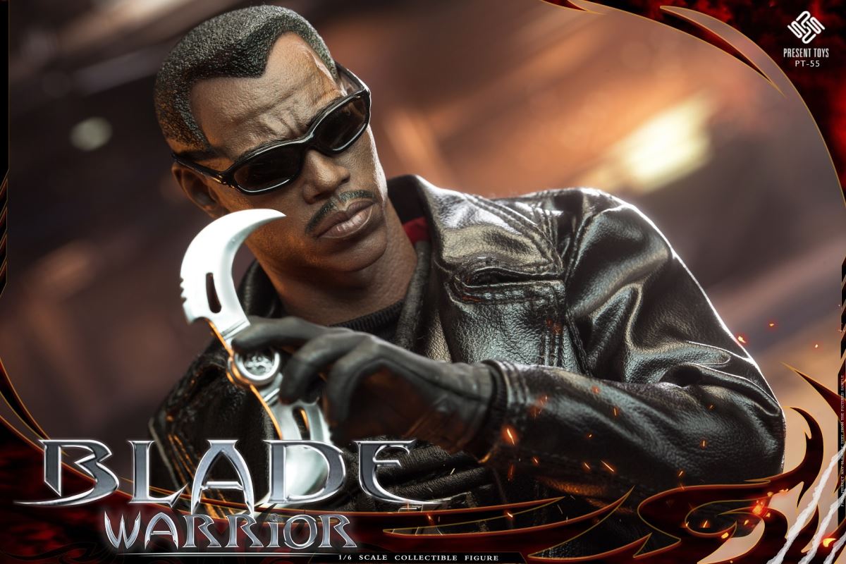 PRESENT TOYS is proud to release a new product: 1:6 collectible toy – Blade warrior.Product Specs:Name: Blade warriorProduct Number: PT-sp55Scale: 1/6Product List:Head sculpture *1Body*1Hand shape *6Silver longsword *1Scabbard *1Shoulder holster *1Foldable Machete *2Retractable hand armour *2Machine gun *1Pistol *2Sunglasses *1Silver cone*5Exclusive platform*1Costume:Black Leather *1 (made of genuine leather)Black Leather Pants *1 (made of genuine leather)Bulletproof vest *1Down jacket *1Dark short sleeves *1The belt*1 Boots* 2Estimate release date 2023 3rd-4th quarter(subject to the actual delivery time of the manufacturer.)