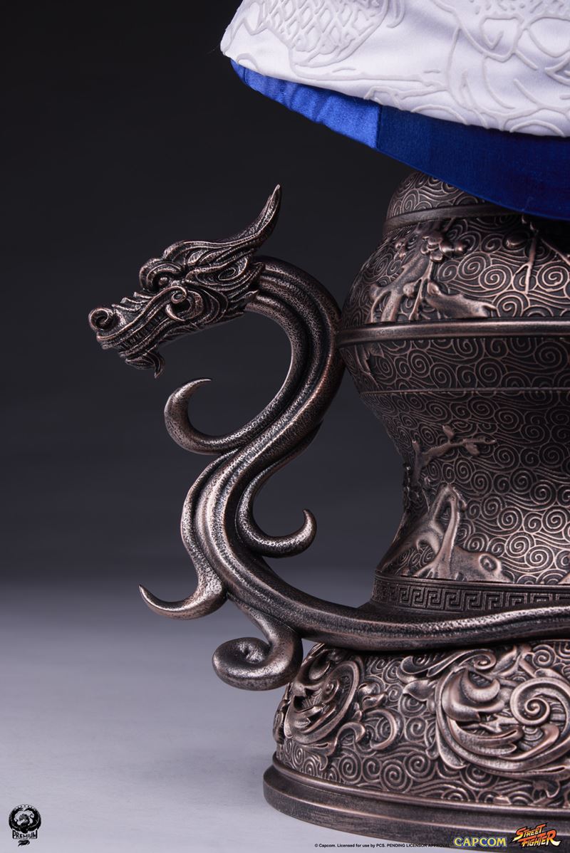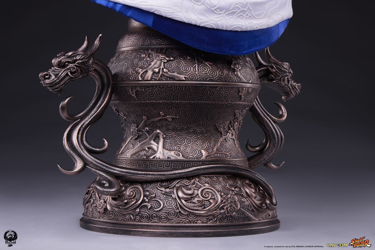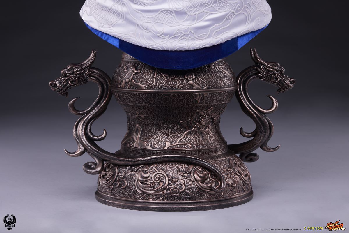 ABOUTI won because I have a reason to fight.Premium Collectibles Studio presents the Chun-Li Life-Size Bust based on one of the most quintessential female characters of the popular Street Fighter franchise.Standing at 35” high and 24” wide, this recreation of the “strongest woman in the world” presents Chun-Li posing in a martial arts salute atop a pedestal base, ready to take down any adversary that stands in the way of justice.Chun-Li's portrait features a lifelike silicone head and arms along with synthetic hair to create a fully formed realistic depiction of this female martial arts master. Mixed media accessories and white ribbons hold Chun-Li's hair up in her iconic ox horn hairstyle. Along with her classic red eyeliner and pointed-brow look, Chun-Li's expression is stoic and disciplined as a seasoned upholder of the law.This piece packs an elegant punch with mixed media clothing portraying Chun-Li in her well-known blue qipao with gold accents and a white sash embroidered with a detailed pattern. On her wrists, Chun-Li also dons her trusty black bracelets with metallic spikes. The bronzed pedestal base is adorned with intricate designs and two sculpted Chinese dragons.Be courageous and bring home a sophisticated Street Fighter staple today with the Chun-Li 1:1 Scale Bust!Materials : Silicone , Mixed Media , Synthetic fibersProduct SizeHeight: 35 (88.9 cm)Width: 16.5 (41.9 cm)Depth: 24 (61 cm) *