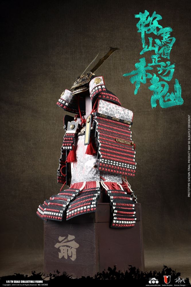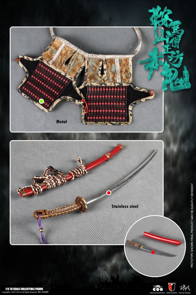 COOMODEL NO.SE060 1/6 SERIES OF EMPIRES (DIECAST ALLOY) - RED GHOST OF MOUNT KURAMA (DEMON VERSION)BARCODE:6971242120921* The whole suit of armor is built of manually-attched clips, 100% alloy-made* Edges of swords are made of stainless steelThe 1/6th scale Red Ghost Collectible Figure specially features:- One (1) realistic head sculpture of Minamoto no Yoshitsune- One (1) super action body- Eight (8) Pieces of Interchangeable PalmsRed Ghost Parts:- One (1) head sculpture of the white haired Red Ghost- Four (4) pieces of Interchangeable ghost palms- One (1) pair of ghost feetCostumes:- One (1) white shirt- One (1) black robe- One (1) black band- One (1) pair of black trousersArmors:- One (1) gold helmet with lion heraldry - One (1) suit of black and red armor- One (1) pair of red shoulder armors- One (1) gold left chest armor- One (1) black and red right chest armor- One (1) pair of black and red vambraces- One (1) pair of black and red cuishes- One (1) pair of black and red jambeaus- One (1) blue and white armor tie- One (1) pair of gold shoesWeapons:- One (1) katana (long sword)- One (1) red katana scabbard- One (1) wakizashi (short sword)- One (1) red wakizashi scabbard- Two (2) ghost macesAccessories:- One (1) black figure stand