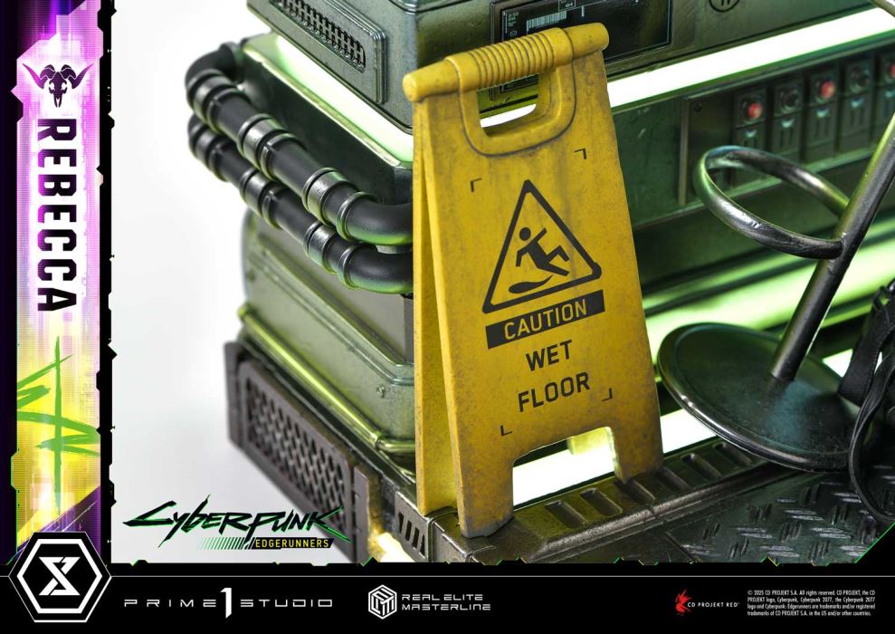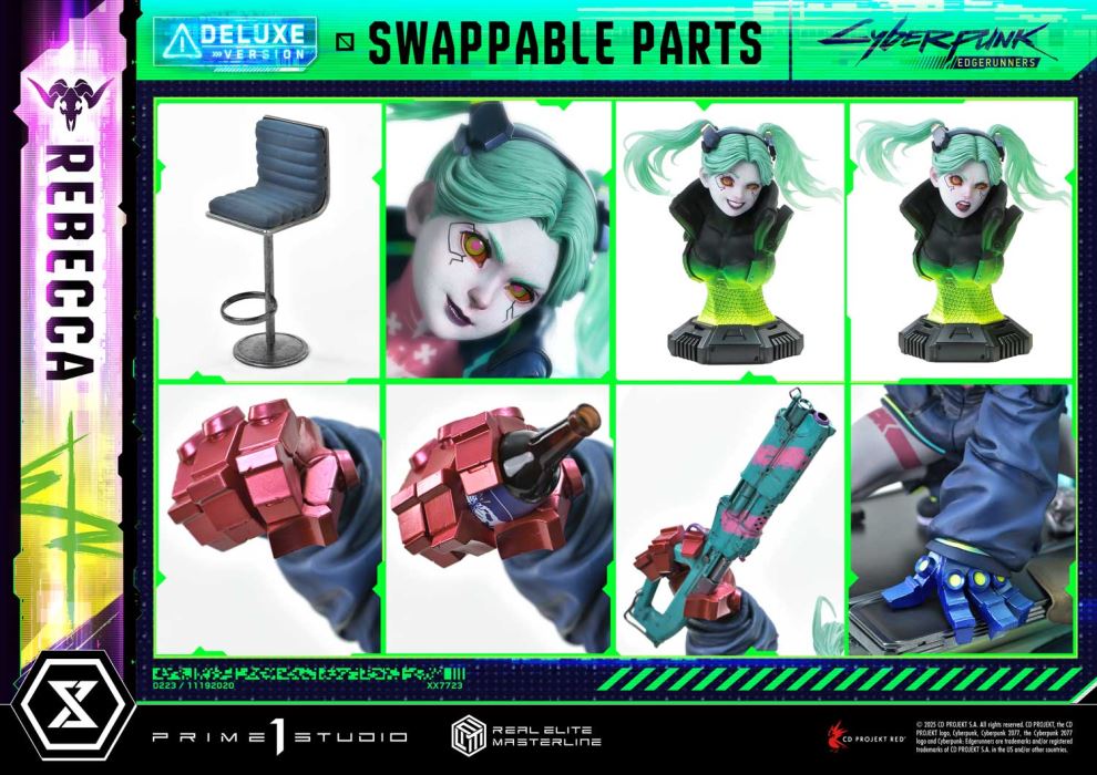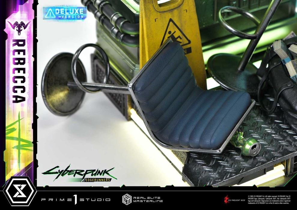 Sign me up, choomba. Into the fire.— RebeccaRebecca from Cyberpunk: Edgerunners joins the Real Elite Masterline series in 1/4 scale!What if Rebecca and the rest of David's crew were recreated in the CG style of Cyberpunk 2077? This bold concept has been brought to life as a high-precision statue. Her small frame, bursting with raw emotion, blends the realism of the game’s design with the expressive style of the anime to create a figure full of intensity.As CD PROJEKT RED Producer Saya Elder highlighted during Prime 1 Studio’s NEXT LEVEL SHOWCASE XIII, the sculpt and paintwork faithfully reflect the world of Cyberpunk: Edgerunners, down to the finest details. From her twin pigtails spreading out to each side, to the pink tattoos glowing against her pale skin, and the gleam of her cybernetic arms, every element draws from the anime’s visual identity while offering new layers of appeal.The specially crafted base is inspired by Afterlife, the legendary bar. Neon lighting rendered with LED and reflective paint, a weathered SAMURAI poster peeling from the wall, and stacks of eddies spilling from her bag, this chaotic yet captivating environment evokes the gritty underworld of Night City in stunning detail.The Deluxe Bonus Version includes a wide array of parts for dynamic display options. Display her with a cheeky grin holding Broseph, or locked and loaded with the high-powered Guts. With the additional counter chair and head stands, your display possibilities expand even further.This version also comes with an exclusive bonus: a bubblegum-blowing head part that captures her quirky, mischievous side—a subtle nod to her more playful moments.Reimagined in the world of Cyberpunk 2077, Rebecca is ready to join your collection, standing proudly alongside David and Lucy.Specifications:Cyberpunk: Edgerunners Themed Base with LED IlluminationThree (3) Swappable Heads (Serious, Angry, Smiling)Three (3) Swappable Right Hands (Fist, Guts, Broseph)One (1) Counter ChairTwo (2) Head StandsOne (1) Head Part (Bubblegum) [BONUS PART]One (1) Head Stand [BONUS PART]LED Power Supply Method: TBD * Please prepare batteries, USB cables, or other necessary items depending on the final power supply method.<div = sdfsdfd=margin: 0px; padding: 0px; border: 0px; font: inherit; vertical-align: baseline; text-align: center;>David, Lucy, and Rebecca—United at AfterlifeThis statue can be connected with “REMCP-01 Lucy” and “REMCP-02 David” to recreate the scene where the trio gathers at Afterlife. (Connection positions as shown in the photo.)Notice:Prototype samples shown.Product details could be subject to change without further notice.Please note the final product specifications may differ because each product is Handmade.Since the product is still in the development stage, the Size (up to 10%) & Weight (up to 10kg) may be changed during the production stage.© 2025 CD PROJEKT S.A. All rights reserved. CD PROJEKT, the CD PROJEKT logo, Cyberpunk, Cyberpunk 2077, the Cyberpunk 2079 logo and Cyberpunk: Edgerunners are trademarks and/or registered trademarks of CD PROJEKT S.A. in the US and/or other countries.DETAILSBrandsPRIME 1 STATUECollectionReal Elite MasterlineSeriesCyberpunk: EdgerunnersScale1/4 ScaleProduct CodeREMCP-03DXSProduct Size Approx.H:54cm W:36cm D:43cmH:64cm W:36cm D:43cm(with Guts)Carton(Est):1 boxProduct Weight Approx.14.3 kgMaterialsPolystone and other materialsJAN4582647121585