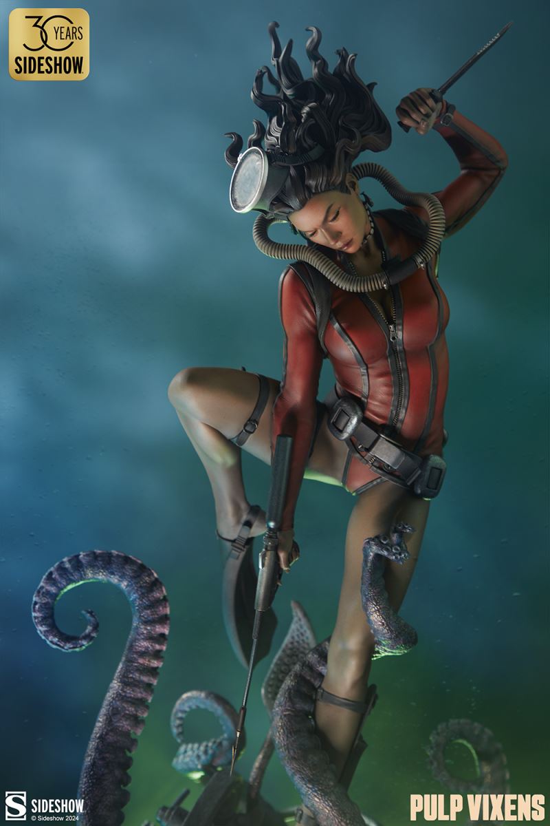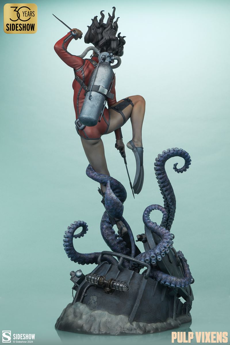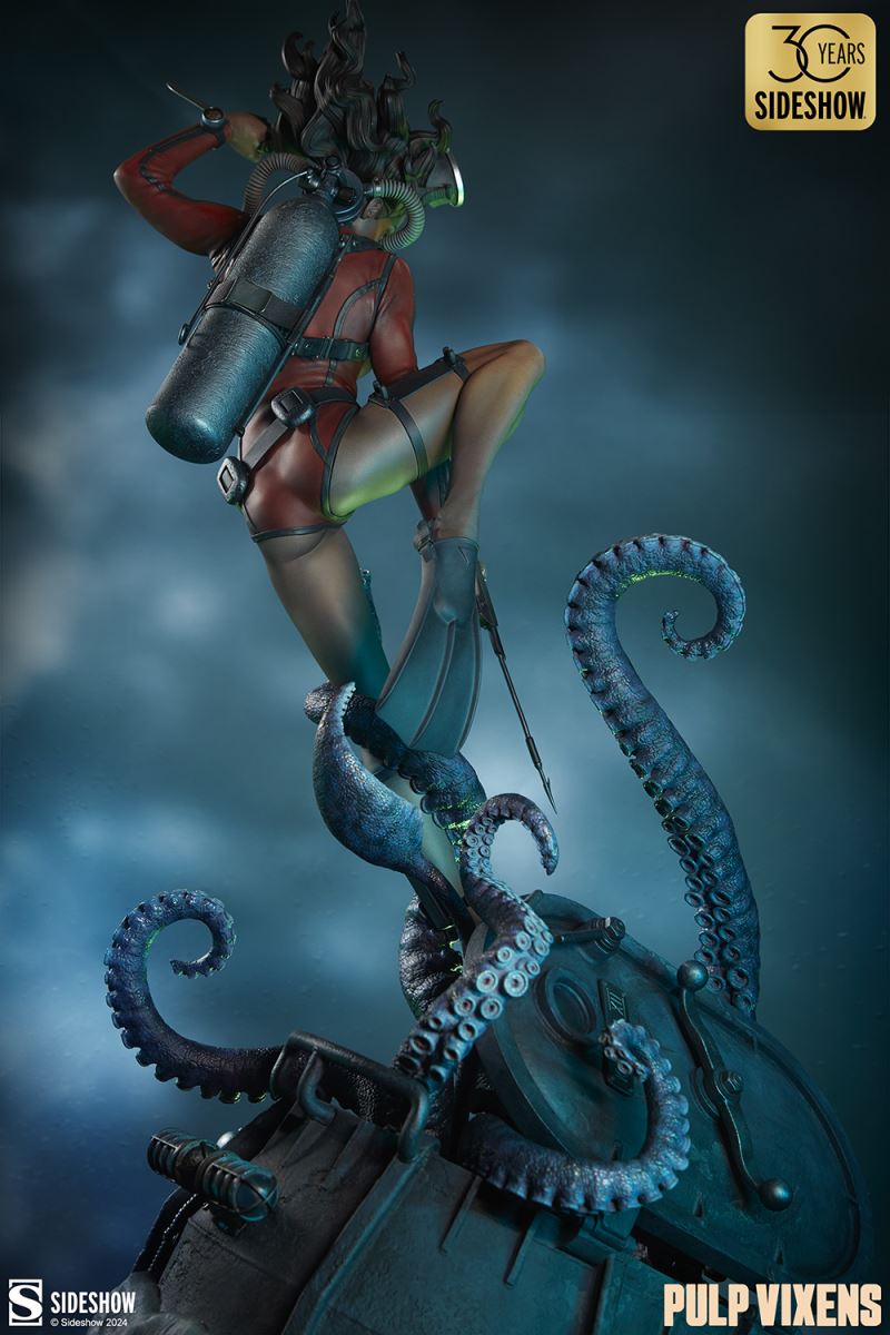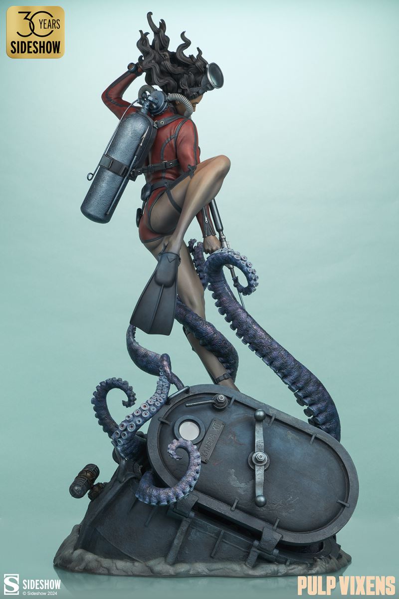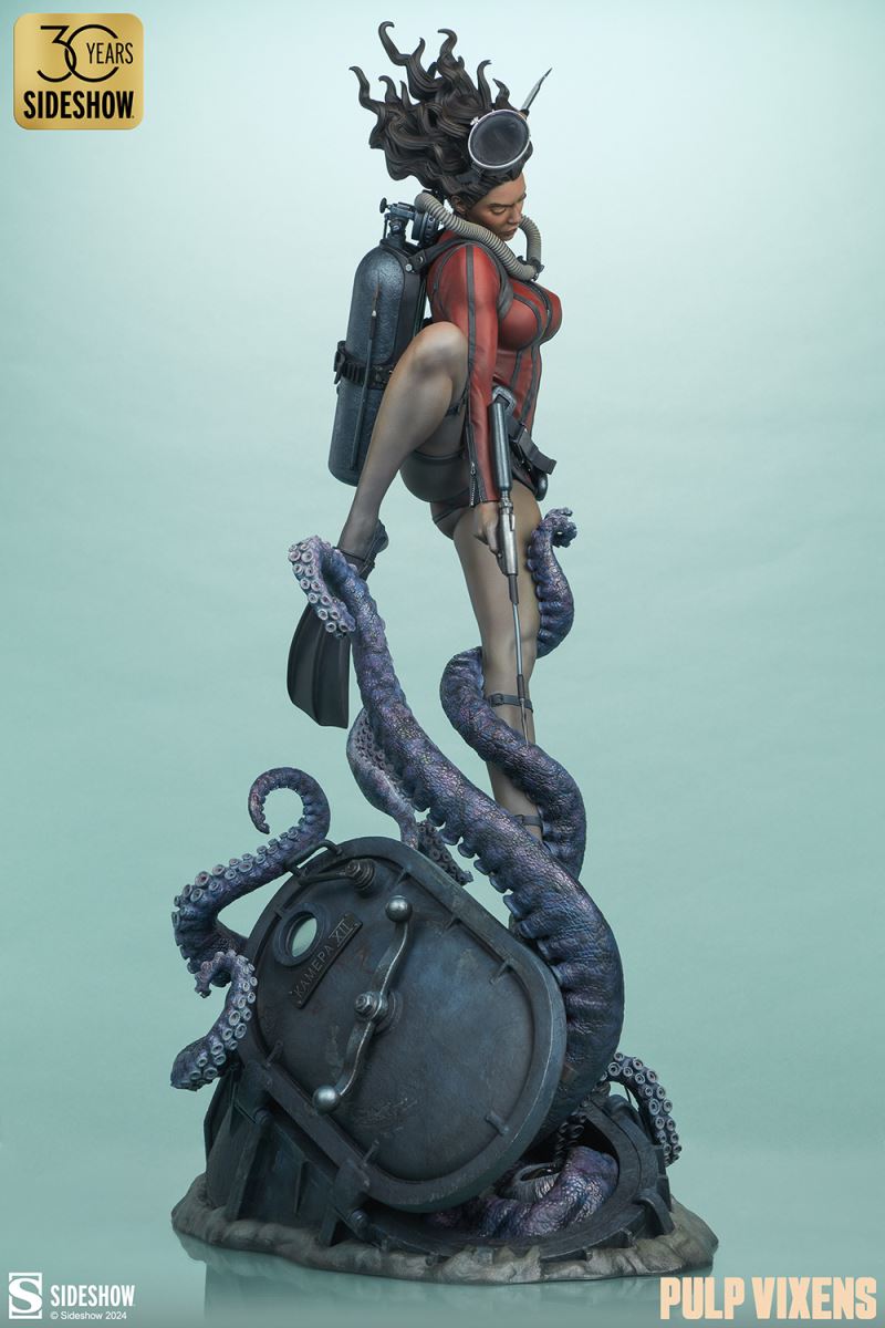 “Where nightmares are made …”Submerge yourself in the world of femme fatales and sinister syndicates with Pulp Vixens by Sideshow. Episode 2: “Deep Down” sends a graceful spy with a complex past sinking into a briny lair of scientific secrets.Agent Hawana Kalili takes the plunge in the Pulp Vixens: Deep Down Premium Format™ Figure, diving into the waters off the coast of Borneo in search of a stolen submarine belonging to an organization known as Kamera XII. But this is no day at the beach! As she comes face to face with unfathomable horrors beneath the waves, she’ll discover a family history murkier than the deepest ocean. This detailed collectible statue shows the diver tangled in the tentacled clutches of a giant squid emerging from the hidden vessel. Her personal diving gear protects her from the mounting ocean pressure — but can Agent Hawana survive the big leagues, or will she be sleeping with the fishes?The Pulp Vixens: Deep Down Premium Format Figure measures 26” tall x 11.15” wide x 13.2” deep and is fully sculpted to capture all of the maritime action of this dangerous deep-sea assignment. Codenamed Dancer, Hawana herself is as graceful and lethal as they come, cutting through the ocean’s depths with ease. The polystone statue features illumination effects, including ambient purple interior lights for the open experiment chamber and flickering red warning lights on the outside of the submarine. Even in the depths of the ocean, these light-up features bring added vibrancy and urgency to the environment. Dynamic paint application and the flow of Hawana’s hair and equipment create the effect of a weightless underwater scene that will have you holding your breath! Are you ready to take the plunge with Pulp Vixens? Reel in your next mission and add the Pulp Vixens: Deep Down Premium Format Figure to your collection today.If you want more intel on the world of Pulp Vixens, scan the latest mission brief and check out Sideshow’s Pulp Vixens Collection Spotlight. And don’t miss Episode 1, the Pulp Vixens: Mr. Sin Premium Format™ Figure, pitting a starlet-turned-spy against a madman! What is Pulp Vixens?Pulp Vixens reveals a hidden world of kitten-heeled killers battling a sinister shadow organization hell-bent on controlling the world. This globetrotting series of collectibles captures the thrill of high-stakes, highly classified action in stunning statue form. Are you ready to go on a secret mission with the Pulp Vixens?Pulp Vixens Episode 2: Deep Down“Where nightmares are made …”The pressure is mounting for Hawana Kalili in Pulp Vixens Episode 2: “Deep Down.” On a mission to an exotic coastal village in Borneo, Agent Hawana will be forced to face her father’s history with the evil organization known as Kamera XII! Diving beneath the waves, she’ll come face to scuba mask with her old man's ghastly experiments hidden aboard a stolen Russian submarine. Can Hawana rise above the tangled tentacles of her past, or will she be drowned by the horrors awaiting her Deep Down?MaterialsPolystoneProduct SizeHeight: 26 (66 cm)Width: 11.15 (28 cm)Depth: 13.2 (34 cm)Weight: 10 lbs (4.5 kg) *