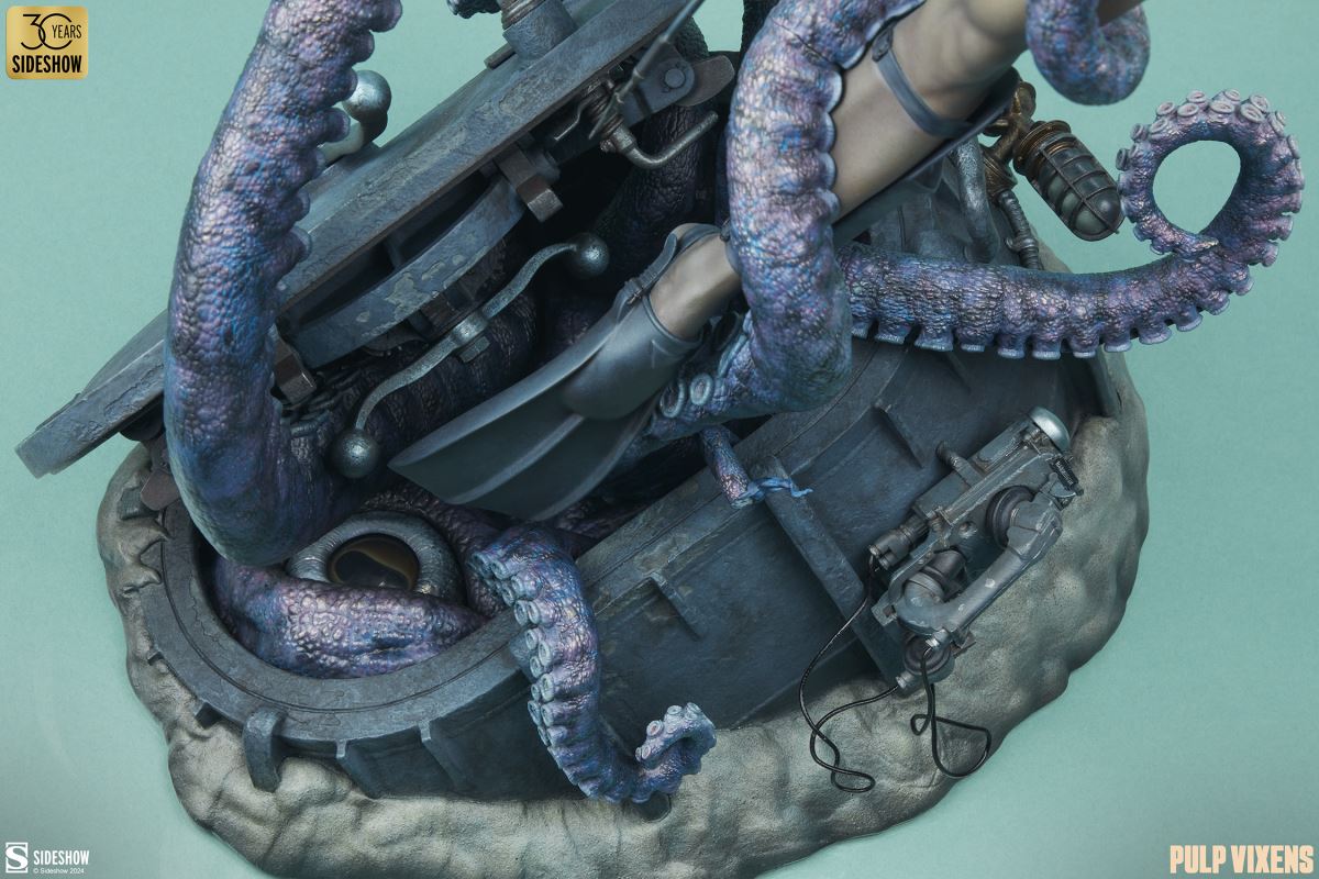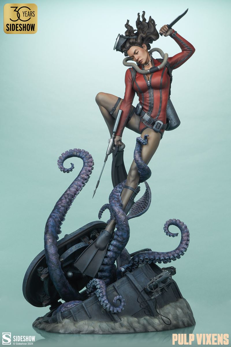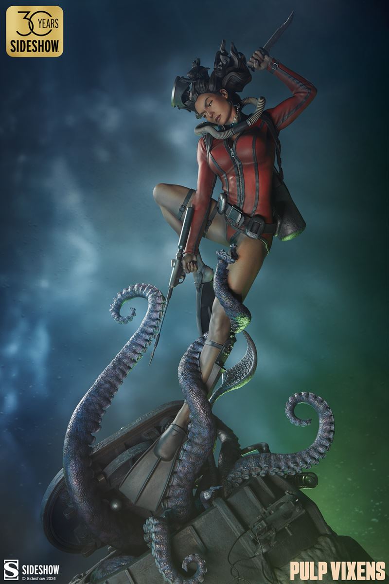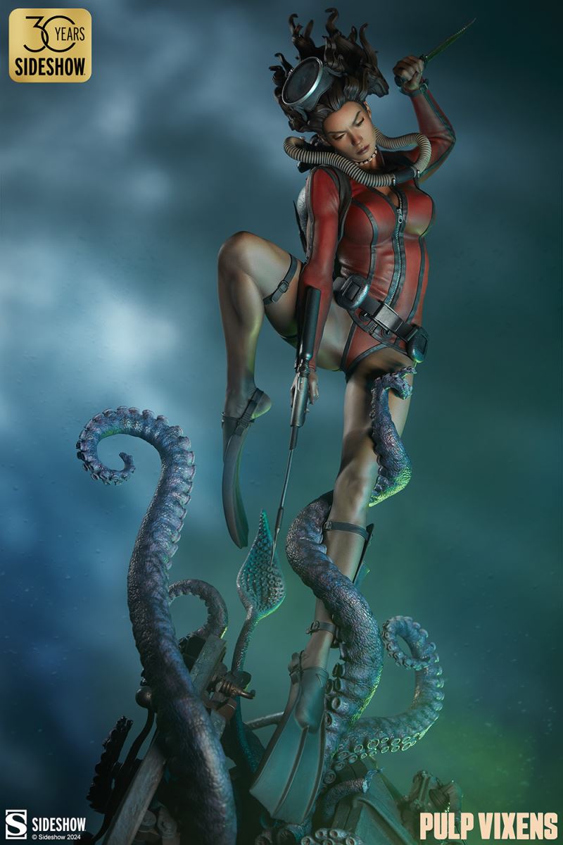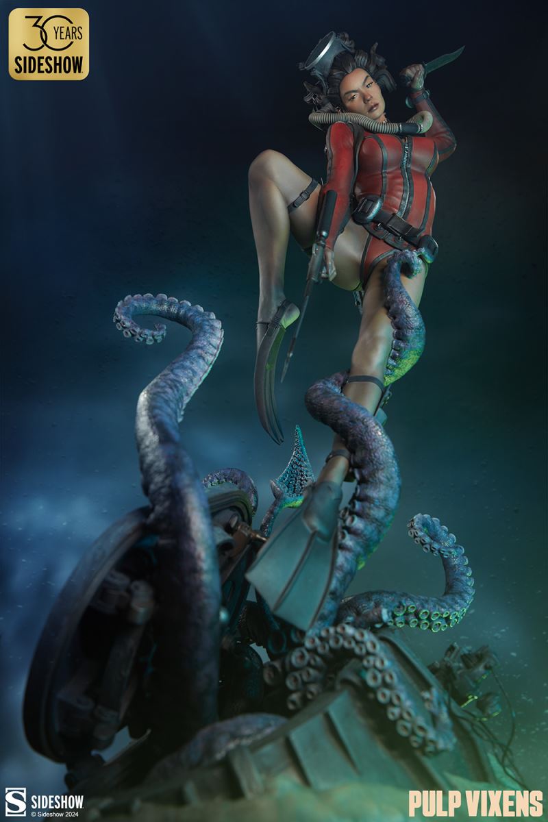 “Where nightmares are made …”Submerge yourself in the world of femme fatales and sinister syndicates with Pulp Vixens by Sideshow. Episode 2: “Deep Down” sends a graceful spy with a complex past sinking into a briny lair of scientific secrets.Agent Hawana Kalili takes the plunge in the Pulp Vixens: Deep Down Premium Format™ Figure, diving into the waters off the coast of Borneo in search of a stolen submarine belonging to an organization known as Kamera XII. But this is no day at the beach! As she comes face to face with unfathomable horrors beneath the waves, she’ll discover a family history murkier than the deepest ocean. This detailed collectible statue shows the diver tangled in the tentacled clutches of a giant squid emerging from the hidden vessel. Her personal diving gear protects her from the mounting ocean pressure — but can Agent Hawana survive the big leagues, or will she be sleeping with the fishes?The Pulp Vixens: Deep Down Premium Format Figure measures 26” tall x 11.15” wide x 13.2” deep and is fully sculpted to capture all of the maritime action of this dangerous deep-sea assignment. Codenamed Dancer, Hawana herself is as graceful and lethal as they come, cutting through the ocean’s depths with ease. The polystone statue features illumination effects, including ambient purple interior lights for the open experiment chamber and flickering red warning lights on the outside of the submarine. Even in the depths of the ocean, these light-up features bring added vibrancy and urgency to the environment. Dynamic paint application and the flow of Hawana’s hair and equipment create the effect of a weightless underwater scene that will have you holding your breath! Are you ready to take the plunge with Pulp Vixens? Reel in your next mission and add the Pulp Vixens: Deep Down Premium Format Figure to your collection today.If you want more intel on the world of Pulp Vixens, scan the latest mission brief and check out Sideshow’s Pulp Vixens Collection Spotlight. And don’t miss Episode 1, the Pulp Vixens: Mr. Sin Premium Format™ Figure, pitting a starlet-turned-spy against a madman! What is Pulp Vixens?Pulp Vixens reveals a hidden world of kitten-heeled killers battling a sinister shadow organization hell-bent on controlling the world. This globetrotting series of collectibles captures the thrill of high-stakes, highly classified action in stunning statue form. Are you ready to go on a secret mission with the Pulp Vixens?Pulp Vixens Episode 2: Deep Down“Where nightmares are made …”The pressure is mounting for Hawana Kalili in Pulp Vixens Episode 2: “Deep Down.” On a mission to an exotic coastal village in Borneo, Agent Hawana will be forced to face her father’s history with the evil organization known as Kamera XII! Diving beneath the waves, she’ll come face to scuba mask with her old man's ghastly experiments hidden aboard a stolen Russian submarine. Can Hawana rise above the tangled tentacles of her past, or will she be drowned by the horrors awaiting her Deep Down?MaterialsPolystoneProduct SizeHeight: 26 (66 cm)Width: 11.15 (28 cm)Depth: 13.2 (34 cm)Weight: 10 lbs (4.5 kg) *