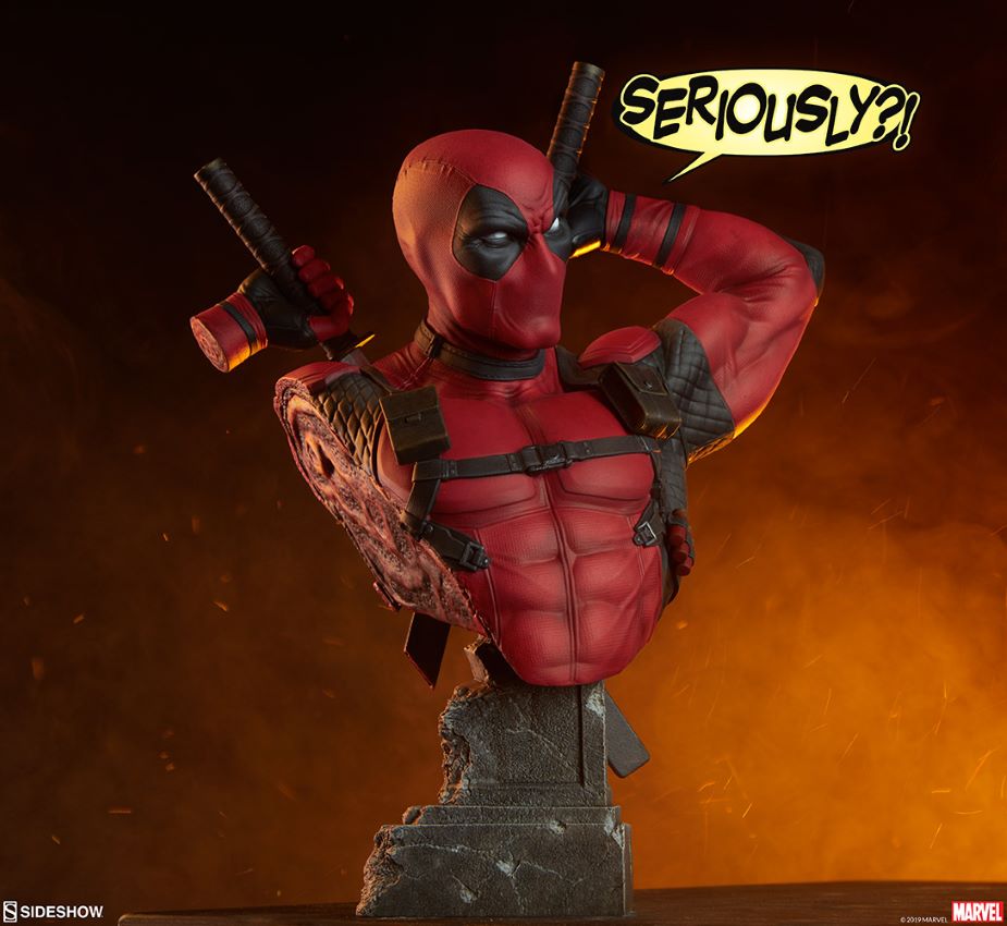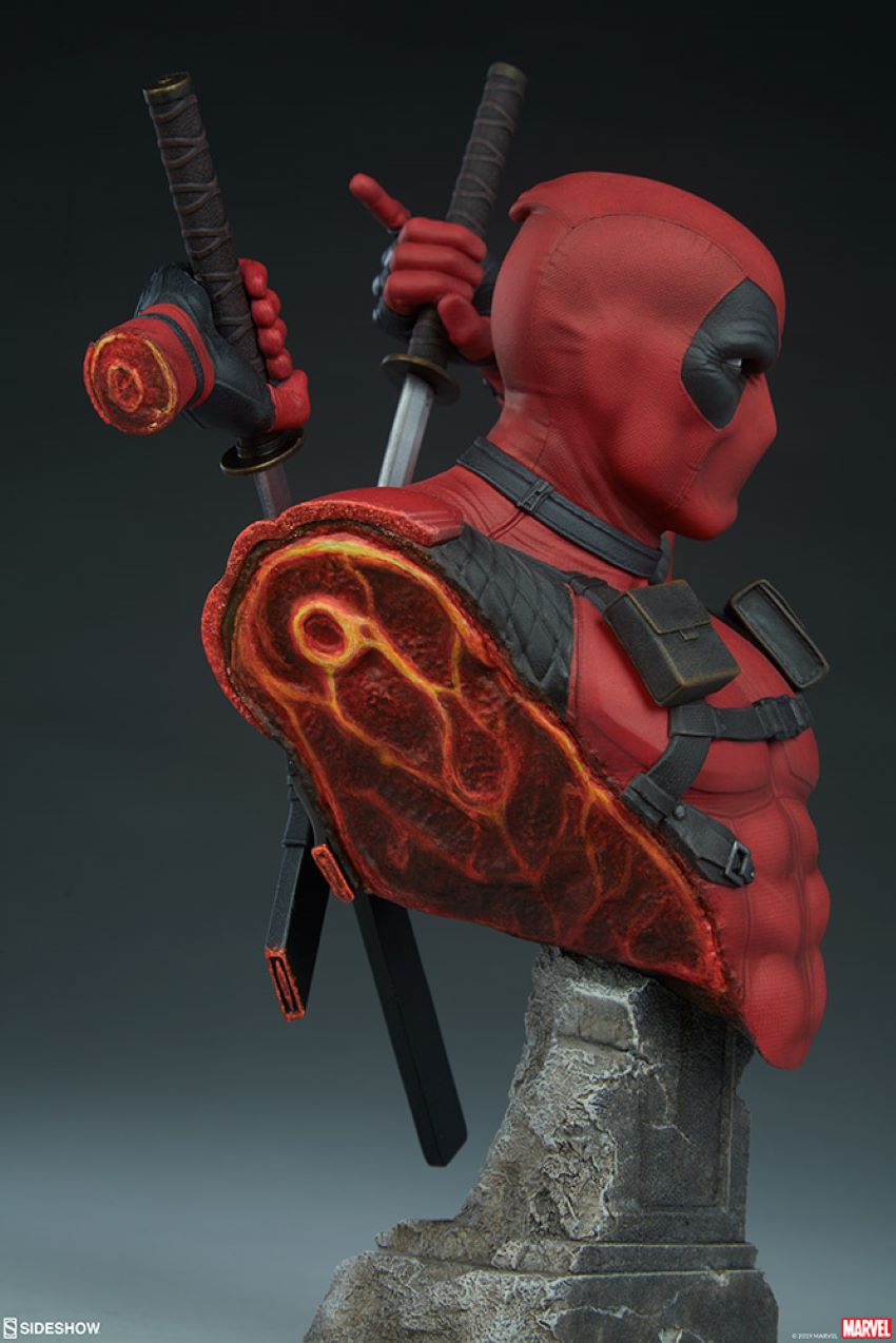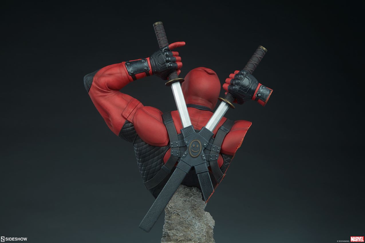 Deadpool Bust นั้นสูง 11 นิ้วเนื่องจาก Merc พร้อมกับปากเตรียมพร้อมที่จะดึงดาบคาตานะคู่ของเขาออกมาต่อสู้ โกนที่ใกล้ที่สุดของเขาอาจจะค่อนข้างมาก - Deadpool ถูกหั่นบาง ๆ เผยให้เห็นความกล้าของเขาที่ทุกคนมองเห็นได้ แต่ไม่ต้องกังวลเขาจะไม่เป็นไร - พวกเขาไม่เรียกเขาว่าคนเลวทรามต่ำช้าเพื่ออะไร