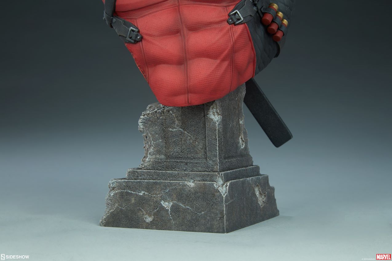Deadpool Bust ตั้งอยู่บนฐานเสาหินที่มีลักษณะเหมือน Wade Wilson มากกว่าที่คุณต้องการ ชุดสะสมของ polyresin นี้มีชุดรูปแกะสลักอย่างเต็มรูปแบบที่มีรายละเอียดด้วยแผ่นรองไหล่ (สำหรับสิ่งที่เขาทิ้งไว้) เช่นเดียวกับกระเป๋า, สายรัด, และแผงสีดำพื้นผิวเพื่อให้ดูลายเซ็นของเขา