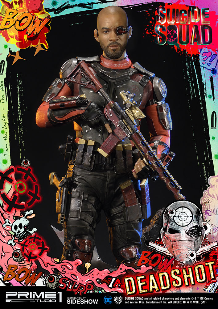 ABOUT THIS STATUESo that's it, huh? We're the patsies. We're some kind of suicide squad.Sideshow and Prime 1 Studio are proud to present Deadshot from Suicide Squad. Deadshot is often a hired assassin, regularly boasting to “never miss.” This deadly assassin, who's real name is Floyd Lawton, may be one of the best marksmen on Earth, if not the best. He is capable of using a large variety of weaponry but is most frequently portrayed as using a pair of silenced, wrist-mounted guns.Don't miss your chance to add Deadshot to your squad!LicenseDC ComicsTypeStatueManufacturerPrime 1 StudioWHAT'S IN THE BOX?The Deadshot Statue features:Size approximately 30 inches tallHigh-quality translucent resin for a lifelike skin effectOne (1) alternate masked head sculpt portraitOne (1) alternate masked head sculpt with aiming device on the left eyeOne (1) exclusive Will Smith head sculpt portraitADDITIONAL DETAILS & DIMENSIONSExpected to ShipFeb 2018 - Apr 2018Item shown is a prototype. When shipped, the final production piece may differ in appearance.Product Size29.92 H (759.97mm) x 15.35 W (389.89mm) x 13.77 L (349.76mm)*Dimensional WeightTBDInt'l Dim. WeightTBD* Size and weight are approximate values.SKU9029621PRICE$974.99SUICIDE SQUAD and all related characters and elements © & ™ DC Comics and Warner Bros. Entertainment Inc. WB SHEILD: TM & © WBEI. (s17)