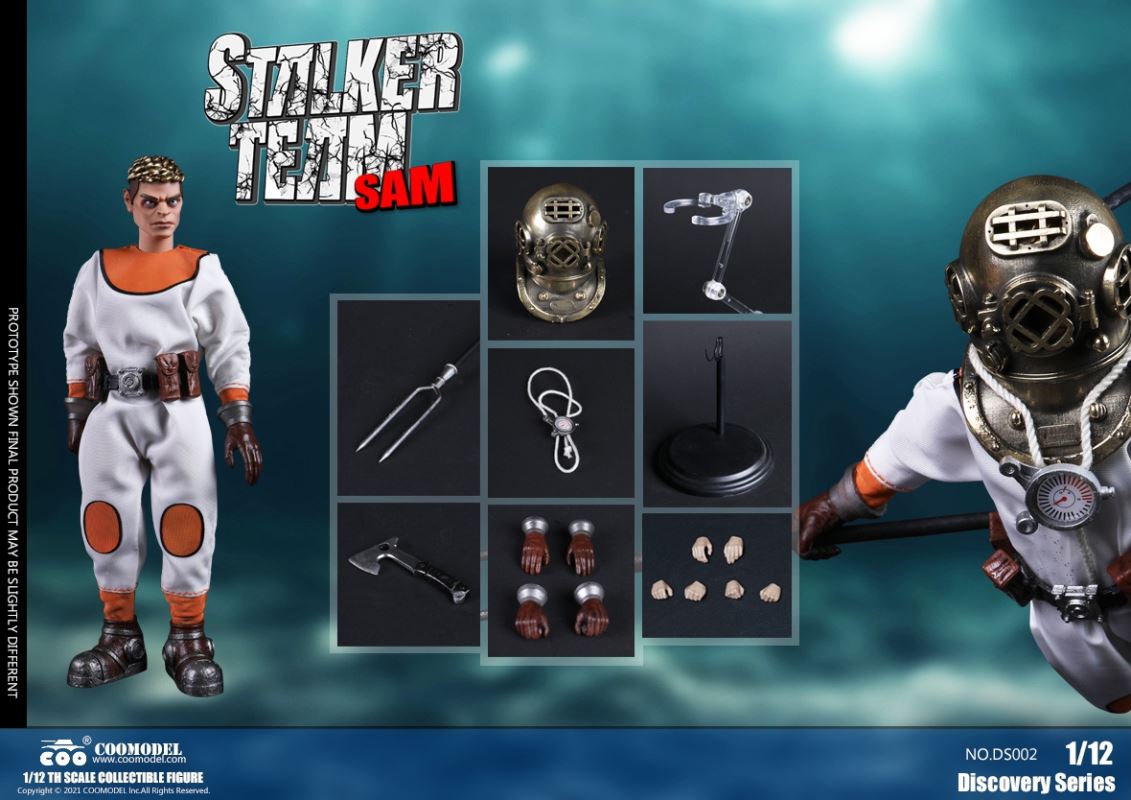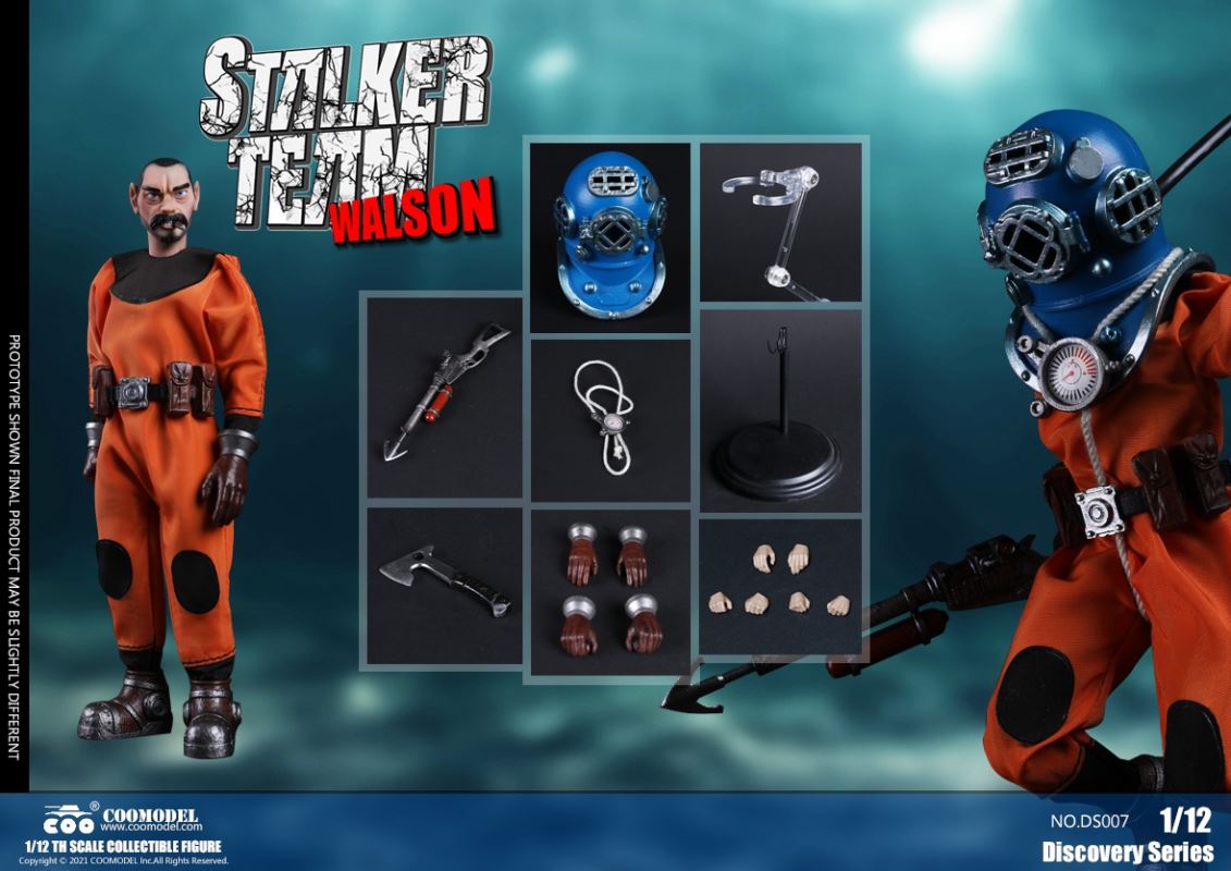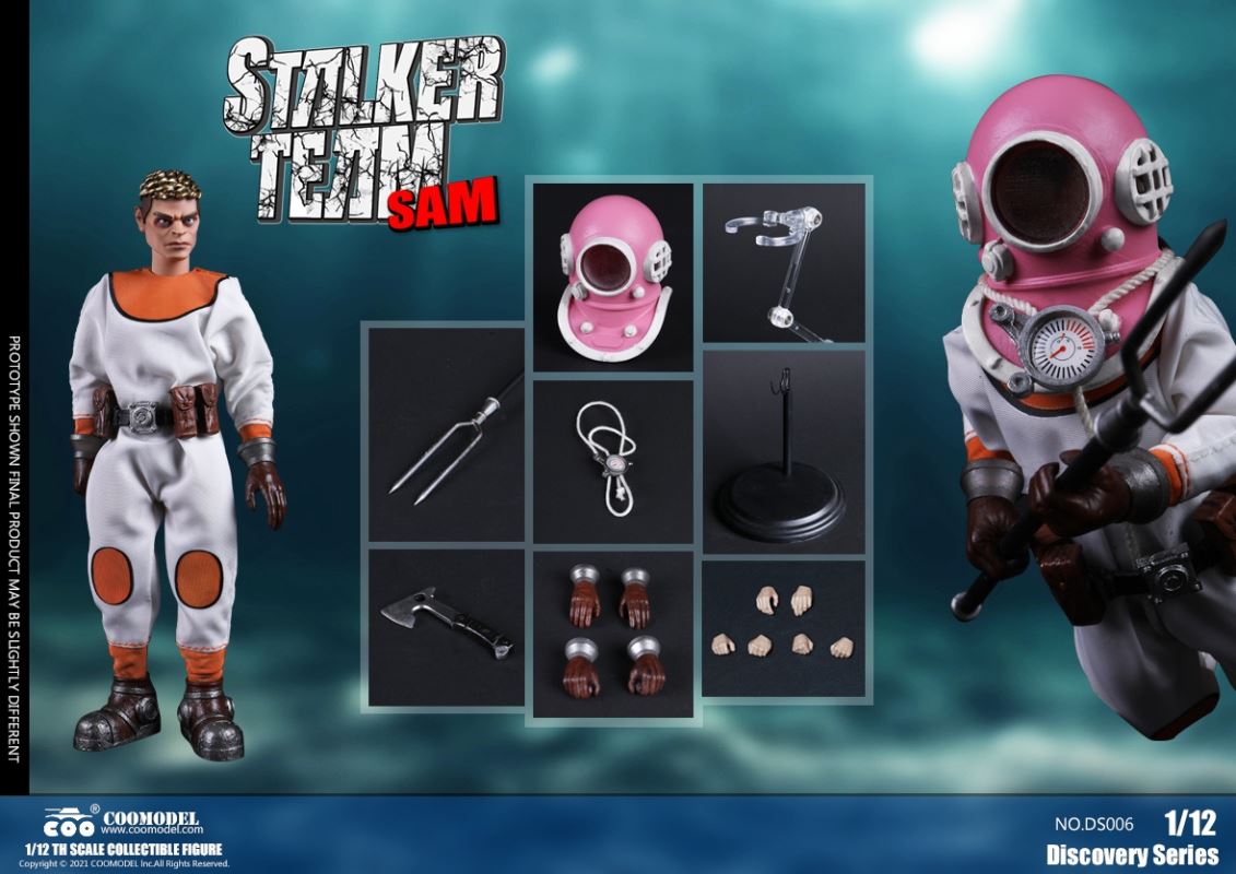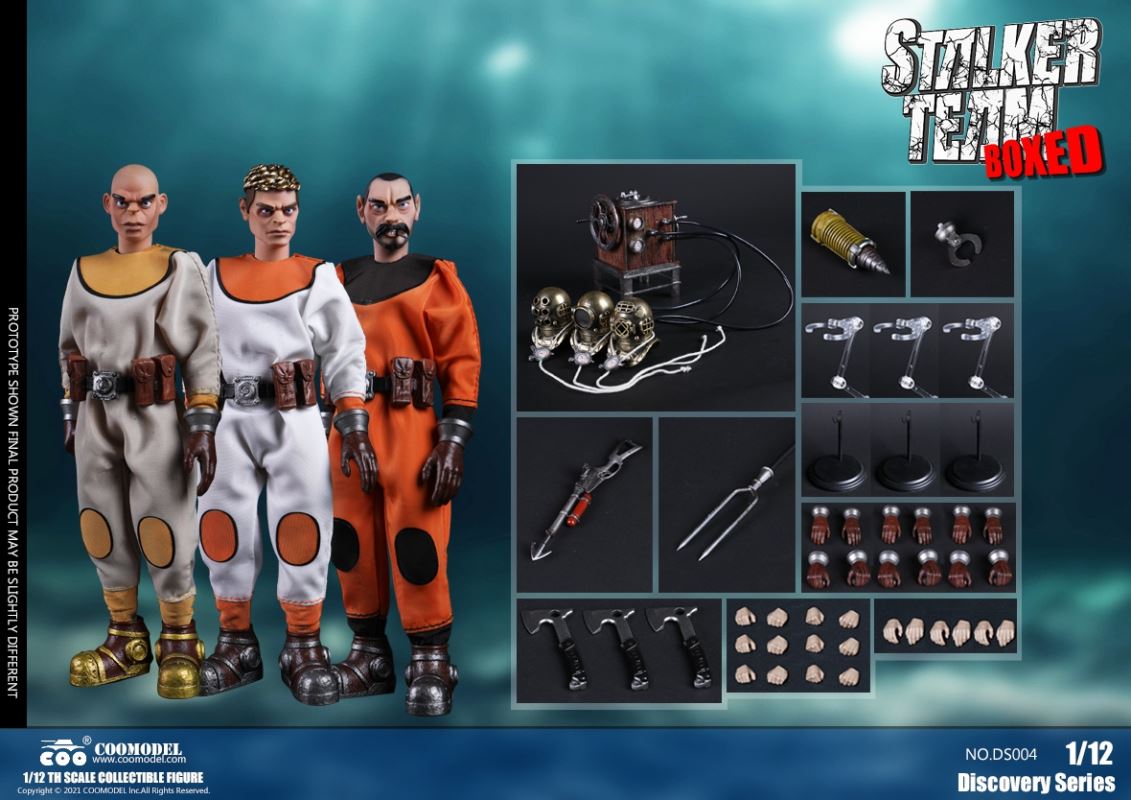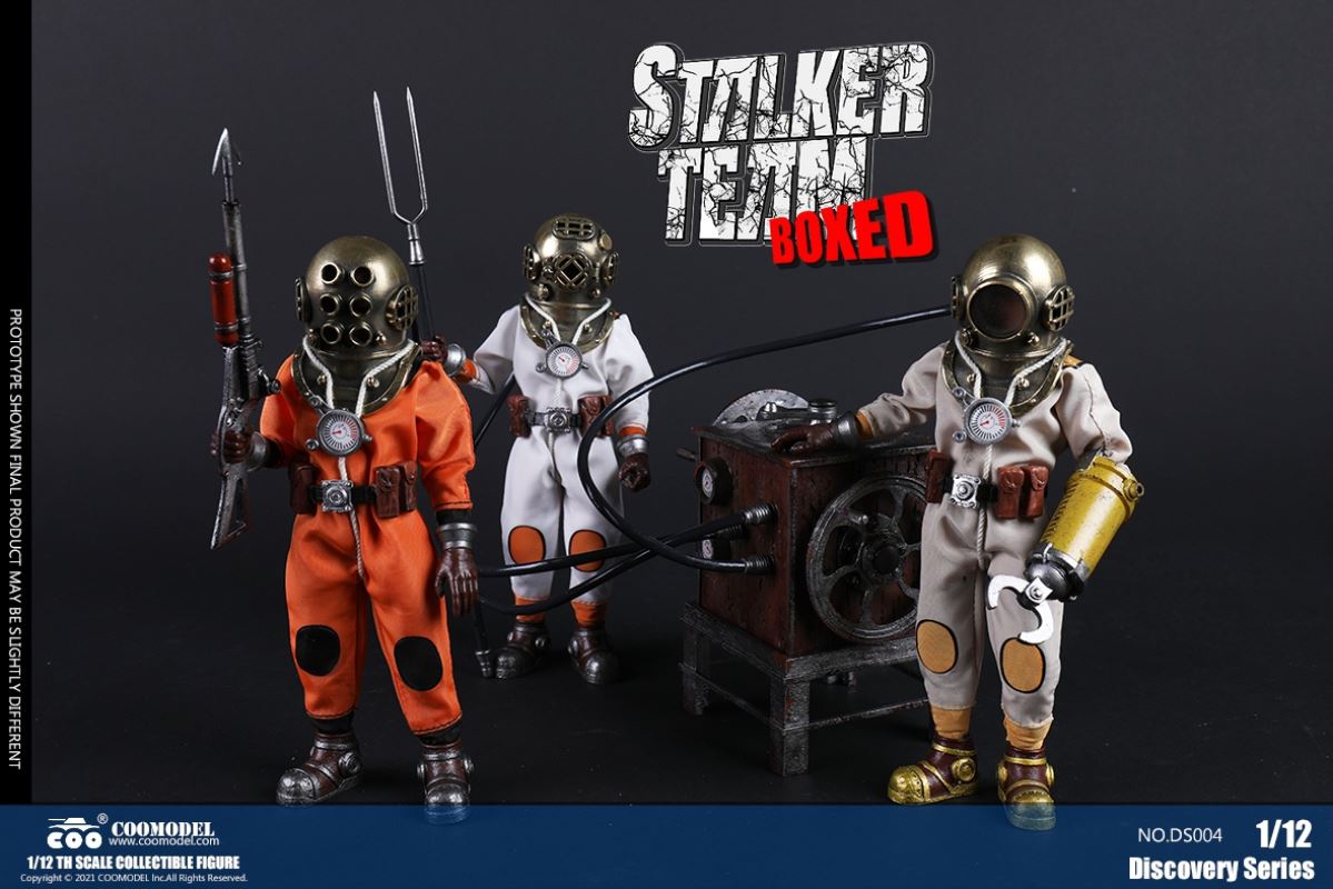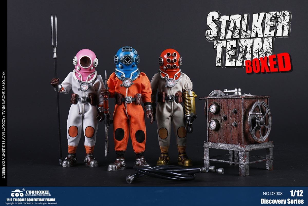 Three Set (Bronze Edition)Barcode: 6971242121874Sneak Squad Set (Bronze Edition)includes Chuck (DS001), Sam (DS002), Walson (DS003) three dolls complete Accessories,more exclusive large-scale accessories, increase team play ~Chuck configuration list: -headsculpture-1/12 movable body-6 replacement hands-4 replacement glove handsClothing:-copper diving helmet-white Yellow edge diving suit-diving storage belt-diving bootsAccessories:-mechanical arm (replaceable pliers or drill bits)-axe-pressure gauge-black doll stand-transparent movable stand------------ ---Sam configuration list: -Headsculpture-1/12 movable body-6 replacement hands-4 replacement glove handsClothing:-Copper diving helmet-White orange-rim wetsuit-Diving storage belt-Diving BootsAccessories:-Harpoon-Axe-Pressure gauge-Black doll stand-Transparent movable stand---------------Wolson configuration list:-Headsculpture-1/12 movable body-6 replacement hands-4 Only replace gloved handsClothing:-Bronze diving helmet-Orange and black-rimmed diving suit-Diving storage belt-Diving bootsAccessories:-Cigar-Speargun-Axe-Pressure gauge-Black doll stand-Transparent movable stand--- ------------Theset unique: -Underwateroxygen circulation device-Helmet connection tube 3COOMODEL 1/12 DS004 DISCOVERY SERIES-STALKER TEAM SET (COPPER VERSION)BARCODE: 6971242121874The Team Set ( Copper Ver.) combines of all figures and accessories of Chuck (DS001), Sam (DS002) and Walson (DS003), with a special part for team up!Chuck specially features:-One (1) head sculpture-One (1) 1/12th scale super action body-Six (6) pieces of interchangeable palms-Four (4) pieces of interchangeable gloved palmsCostumes: -One(1) copper-made diving helmet- One (. 1) White and Yellow Diving SUIT- One (. 1) Diving Belt with pockets- One (. 1) pair of Diving ShoesAccessories:- One (. 1) Machine ARM (with Plier and Driller)- One (. 1) Ax- One (1) pressure gage-One (1) black figure stand-One (1) clear action stand----------Sam special features:-One(1) head sculpture-One (1) 1/ 12th scale super action body-Six (6) pieces of interchangeable palms -Four (4) pieces of interchangeable gloved palmsCostumes: -One(1) copper-made diving helmet-One (1) white and orange diving suit-One (1) diving belt with pockets -One(1) pair of diving shoesAccessories:-One (1) fishgig-One (1) axe-One (1) pressure gage-One (1) black figure stand-One (1) clear action stand---- ------Walson specially features:-One(1) head sculpture-One (1) 1/12th scale super action body-Six (6) pieces of interchangeable palms-Four (4) pieces of interchangeable gloved palmsCostumes:-One (1) copper-made diving helmet-One (1) orange and black diving suit-One (1) diving belt with pockets-One (1) pair of diving shoesAccessories:-One (1) cigar-One (1 ) fishing gun-One (1) axe-One (1) pressure gage-One (1) black figure stand-One (1) clear action stand-----------Team Set Special:-One ( 1) Oxygen Cycling Device-One (2) pipe for helmets==================COOMODEL 1/12 DS005 Discovery-Sneak Team . Chuck (Color Version)Barcode: 6971242121881Configuration List :-HeadSculpture-1/12 Movable Body-6 Replacement Hands-4 Replacement Glove HandsClothing:- diving helmet orange- yellow edge wetsuit white- diving belt housing- diving bootsAccessories:- mechanical arm (or alternatively the drill pliers)- ax- gauge- black doll stand- transparent movable fenceCOOMODEL 1/12 DS005 DISCOVERY SERIES -STALKER TEAM-CHUCK (COLORED VERSION)BARCODE: 6971242121881The 1/12th scale Chuck Collectible Figure specially features :-One(1) head sculpture-One (1) 1/12th scale super action body-Six (6) pieces of interchangeable palms-Four (4) pieces of interchangeable gloved palmsCostumes:-One(1) orange diving helmet-One (1) white and yellow diving suit-One (1) diving belt with pockets-One (1) pair of diving shoesAccessories:-One (1) machine arm (with plier and driller)-One(1) axe-One (1) pressure gage-One (1) black figure stand-One (1) clear action stand==================COOMODEL 1/12 DS006 Discovery-Sneak Team. Sam (Color Version)Barcode: 6971242121898Configuration List :-HeadSculpture-1/12 Movable Body-6 Replacement Hands-4 Replacement Glove HandsClothing:-Pink diving helmet- white orange edge wetsuit- diving belt housing- diving bootsAccessories:- harpoon- ax- gauge- black doll stand- transparent movable fenceCOOMODEL 1/12 DS006 DISCOVERY SERIES - STALKER TEAM - SAM (COLORED VERSION )BARCODE: 6971242121898The 1/12th scale Sam Collectible Figure specially features :-One(1) head sculpture-One (1) 1/12th scale super action body-Six (6) pieces of interchangeable palms-Four (4) pieces of interchangeable gloved palmsCostumes:-One (1) pink diving helmet-One (1) white and orange diving suit-One (1) diving belt with pockets-One (1) pair of diving shoesAccessories:-One (1) fishgig-One (1) axe-One (1) pressure gage-One (1) black figure stand-One (1) clear action stand==================COOMODEL 1/12 DS007 Discovery-Sneak Team. Walson (Color Version)Barcode: 6971242121904Configuration List :-HeadSculpture-1/12 Movable Body-6 Replacement Hands-4 Replacement Glove HandsClothing:- blue diving helmet- black side orange diving suit- diving storage belt- diving bootsAccessories:- cigars- spear gun- ax- pressure gauge- black doll stand- transparent movable fenceCOOMODEL 1/12 DS007 DISCOVERY SERIES - STALKER TEAM -WALSON (COLORED VERSION)BARCODE: 6971242121904The 1/12th scale Walson Collectible Figure specially features:-One(1) head sculpture-One (1) 1/12th scale super action body-Six (6) pieces of interchangeable palms-Four (4) pieces of interchangeable gloved palmsCostumes:-One(1) blue diving helmet-One (1) orange and black diving suit-One (1) diving belt with pockets-One (1) pair of diving shoesAccessories:-One (1) cigar-One (1 ) fishing gun-One (1) axe-One (1) pressure gage-One (1) black figure stand-One (1) clear action stand=================COOMODEL 1/12 DS008 Discovery- Sneak Squad Three Set (color version)Barcode: 6971242121911Sneak Squad Set (color version)includes Chuck (DS005),