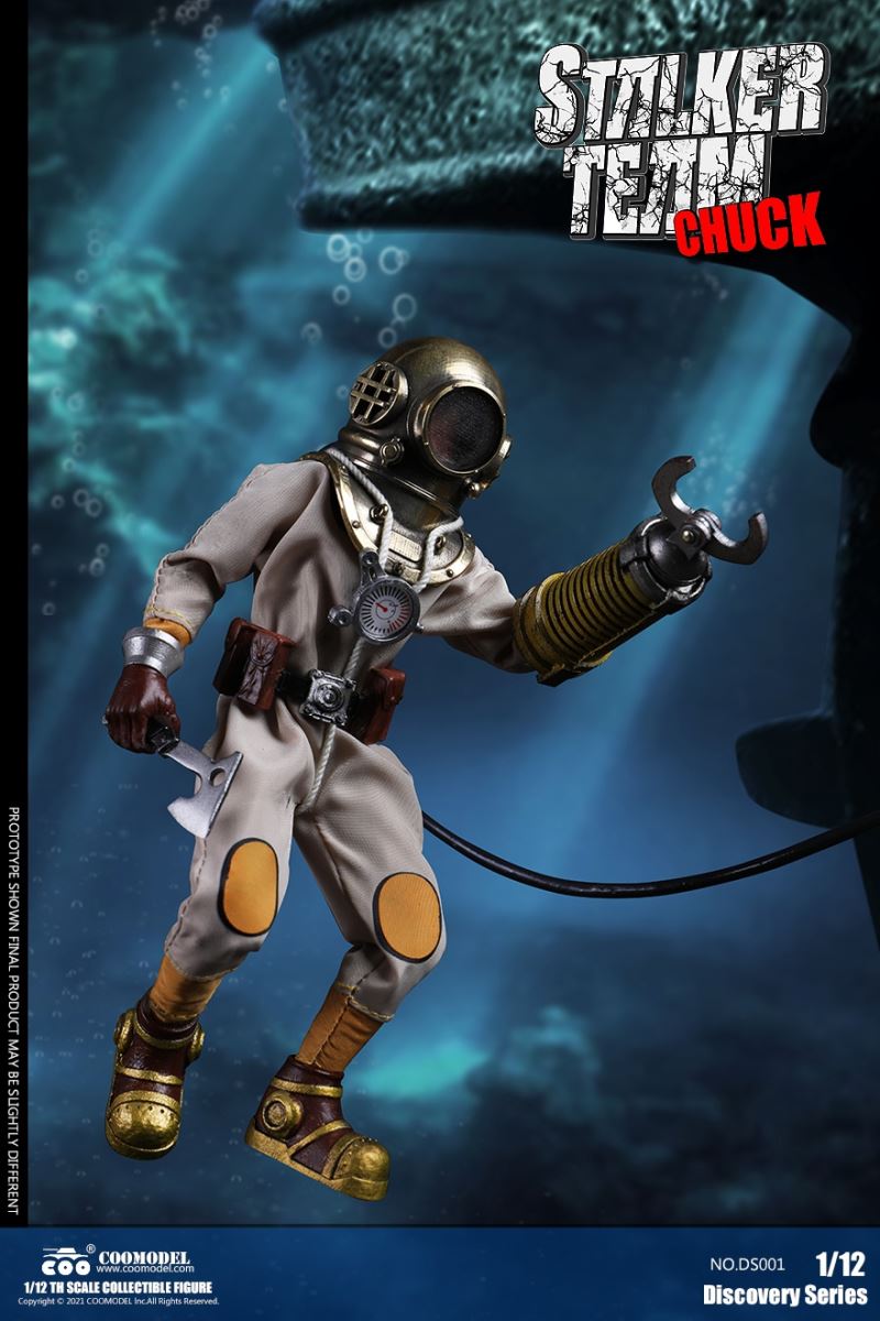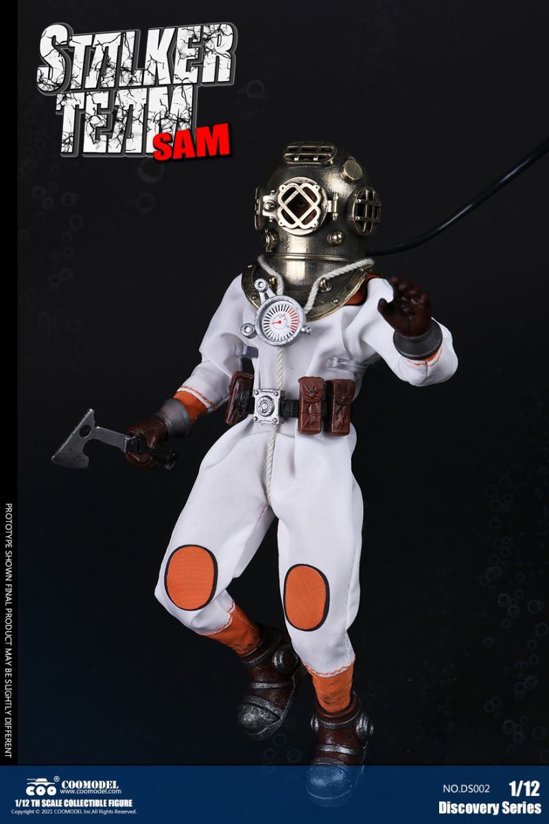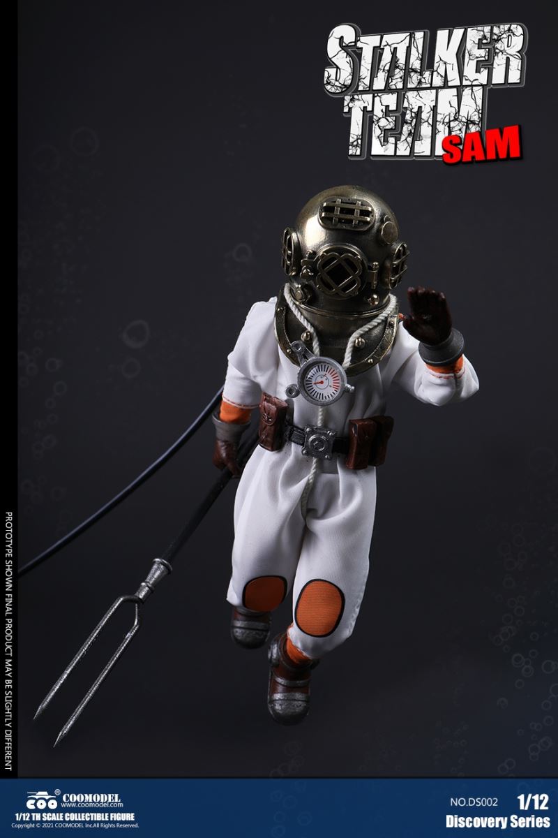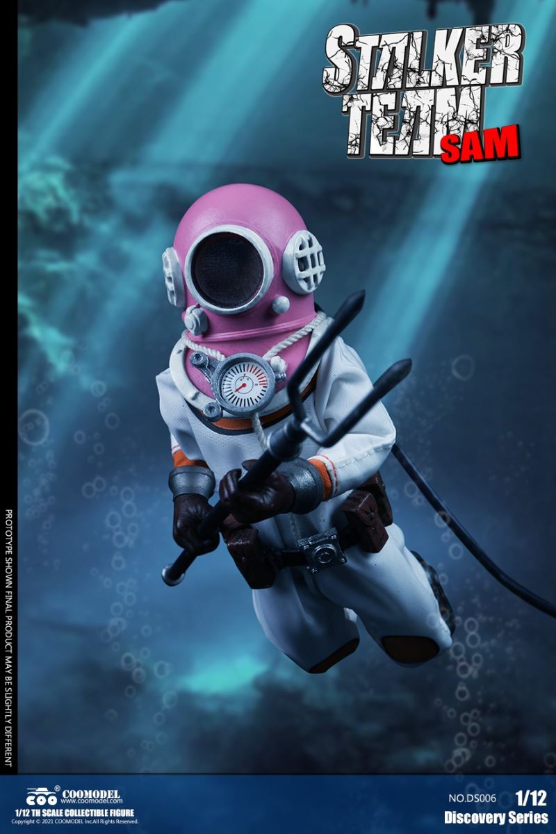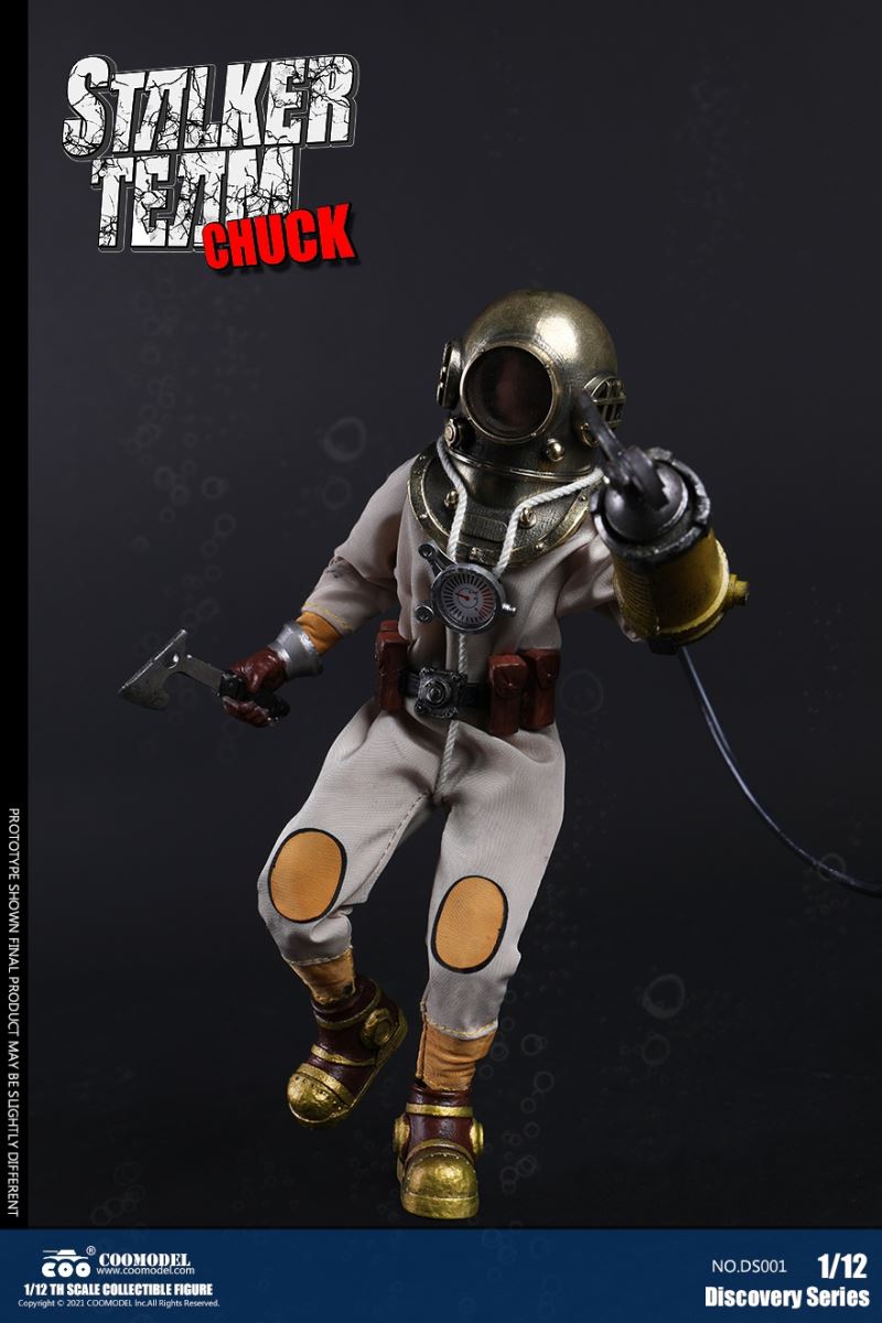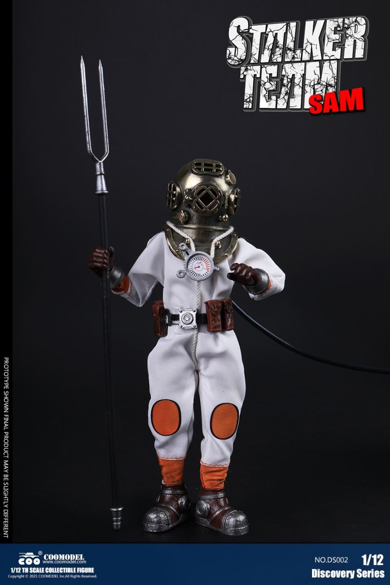 Three Set (Bronze Edition)Barcode: 6971242121874Sneak Squad Set (Bronze Edition)includes Chuck (DS001), Sam (DS002), Walson (DS003) three dolls complete Accessories,more exclusive large-scale accessories, increase team play ~Chuck configuration list: -headsculpture-1/12 movable body-6 replacement hands-4 replacement glove handsClothing:-copper diving helmet-white Yellow edge diving suit-diving storage belt-diving bootsAccessories:-mechanical arm (replaceable pliers or drill bits)-axe-pressure gauge-black doll stand-transparent movable stand------------ ---Sam configuration list: -Headsculpture-1/12 movable body-6 replacement hands-4 replacement glove handsClothing:-Copper diving helmet-White orange-rim wetsuit-Diving storage belt-Diving BootsAccessories:-Harpoon-Axe-Pressure gauge-Black doll stand-Transparent movable stand---------------Wolson configuration list:-Headsculpture-1/12 movable body-6 replacement hands-4 Only replace gloved handsClothing:-Bronze diving helmet-Orange and black-rimmed diving suit-Diving storage belt-Diving bootsAccessories:-Cigar-Speargun-Axe-Pressure gauge-Black doll stand-Transparent movable stand--- ------------Theset unique: -Underwateroxygen circulation device-Helmet connection tube 3COOMODEL 1/12 DS004 DISCOVERY SERIES-STALKER TEAM SET (COPPER VERSION)BARCODE: 6971242121874The Team Set ( Copper Ver.) combines of all figures and accessories of Chuck (DS001), Sam (DS002) and Walson (DS003), with a special part for team up!Chuck specially features:-One (1) head sculpture-One (1) 1/12th scale super action body-Six (6) pieces of interchangeable palms-Four (4) pieces of interchangeable gloved palmsCostumes: -One(1) copper-made diving helmet- One (. 1) White and Yellow Diving SUIT- One (. 1) Diving Belt with pockets- One (. 1) pair of Diving ShoesAccessories:- One (. 1) Machine ARM (with Plier and Driller)- One (. 1) Ax- One (1) pressure gage-One (1) black figure stand-One (1) clear action stand----------Sam special features:-One(1) head sculpture-One (1) 1/ 12th scale super action body-Six (6) pieces of interchangeable palms -Four (4) pieces of interchangeable gloved palmsCostumes: -One(1) copper-made diving helmet-One (1) white and orange diving suit-One (1) diving belt with pockets -One(1) pair of diving shoesAccessories:-One (1) fishgig-One (1) axe-One (1) pressure gage-One (1) black figure stand-One (1) clear action stand---- ------Walson specially features:-One(1) head sculpture-One (1) 1/12th scale super action body-Six (6) pieces of interchangeable palms-Four (4) pieces of interchangeable gloved palmsCostumes:-One (1) copper-made diving helmet-One (1) orange and black diving suit-One (1) diving belt with pockets-One (1) pair of diving shoesAccessories:-One (1) cigar-One (1 ) fishing gun-One (1) axe-One (1) pressure gage-One (1) black figure stand-One (1) clear action stand-----------Team Set Special:-One ( 1) Oxygen Cycling Device-One (2) pipe for helmets==================COOMODEL 1/12 DS005 Discovery-Sneak Team . Chuck (Color Version)Barcode: 6971242121881Configuration List :-HeadSculpture-1/12 Movable Body-6 Replacement Hands-4 Replacement Glove HandsClothing:- diving helmet orange- yellow edge wetsuit white- diving belt housing- diving bootsAccessories:- mechanical arm (or alternatively the drill pliers)- ax- gauge- black doll stand- transparent movable fenceCOOMODEL 1/12 DS005 DISCOVERY SERIES -STALKER TEAM-CHUCK (COLORED VERSION)BARCODE: 6971242121881The 1/12th scale Chuck Collectible Figure specially features :-One(1) head sculpture-One (1) 1/12th scale super action body-Six (6) pieces of interchangeable palms-Four (4) pieces of interchangeable gloved palmsCostumes:-One(1) orange diving helmet-One (1) white and yellow diving suit-One (1) diving belt with pockets-One (1) pair of diving shoesAccessories:-One (1) machine arm (with plier and driller)-One(1) axe-One (1) pressure gage-One (1) black figure stand-One (1) clear action stand==================COOMODEL 1/12 DS006 Discovery-Sneak Team. Sam (Color Version)Barcode: 6971242121898Configuration List :-HeadSculpture-1/12 Movable Body-6 Replacement Hands-4 Replacement Glove HandsClothing:-Pink diving helmet- white orange edge wetsuit- diving belt housing- diving bootsAccessories:- harpoon- ax- gauge- black doll stand- transparent movable fenceCOOMODEL 1/12 DS006 DISCOVERY SERIES - STALKER TEAM - SAM (COLORED VERSION )BARCODE: 6971242121898The 1/12th scale Sam Collectible Figure specially features :-One(1) head sculpture-One (1) 1/12th scale super action body-Six (6) pieces of interchangeable palms-Four (4) pieces of interchangeable gloved palmsCostumes:-One (1) pink diving helmet-One (1) white and orange diving suit-One (1) diving belt with pockets-One (1) pair of diving shoesAccessories:-One (1) fishgig-One (1) axe-One (1) pressure gage-One (1) black figure stand-One (1) clear action stand==================COOMODEL 1/12 DS007 Discovery-Sneak Team. Walson (Color Version)Barcode: 6971242121904Configuration List :-HeadSculpture-1/12 Movable Body-6 Replacement Hands-4 Replacement Glove HandsClothing:- blue diving helmet- black side orange diving suit- diving storage belt- diving bootsAccessories:- cigars- spear gun- ax- pressure gauge- black doll stand- transparent movable fenceCOOMODEL 1/12 DS007 DISCOVERY SERIES - STALKER TEAM -WALSON (COLORED VERSION)BARCODE: 6971242121904The 1/12th scale Walson Collectible Figure specially features:-One(1) head sculpture-One (1) 1/12th scale super action body-Six (6) pieces of interchangeable palms-Four (4) pieces of interchangeable gloved palmsCostumes:-One(1) blue diving helmet-One (1) orange and black diving suit-One (1) diving belt with pockets-One (1) pair of diving shoesAccessories:-One (1) cigar-One (1 ) fishing gun-One (1) axe-One (1) pressure gage-One (1) black figure stand-One (1) clear action stand=================COOMODEL 1/12 DS008 Discovery- Sneak Squad Three Set (color version)Barcode: 6971242121911Sneak Squad Set (color version)includes Chuck (DS005),
