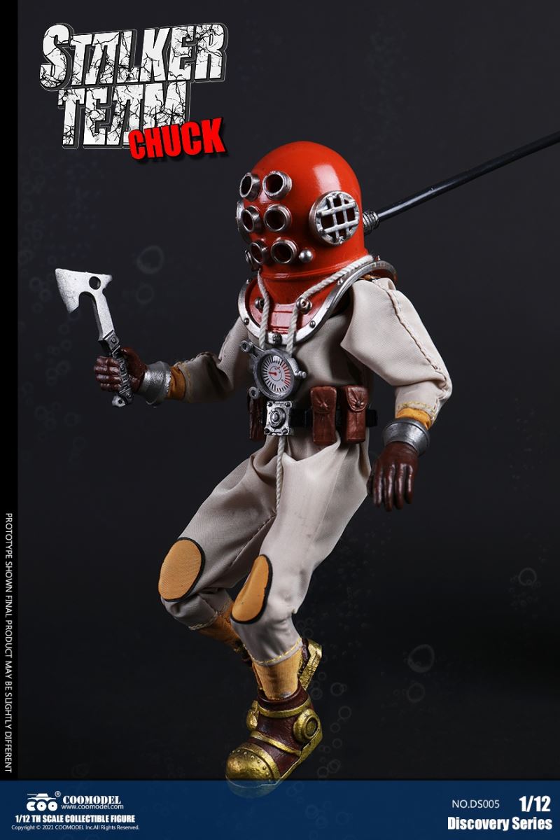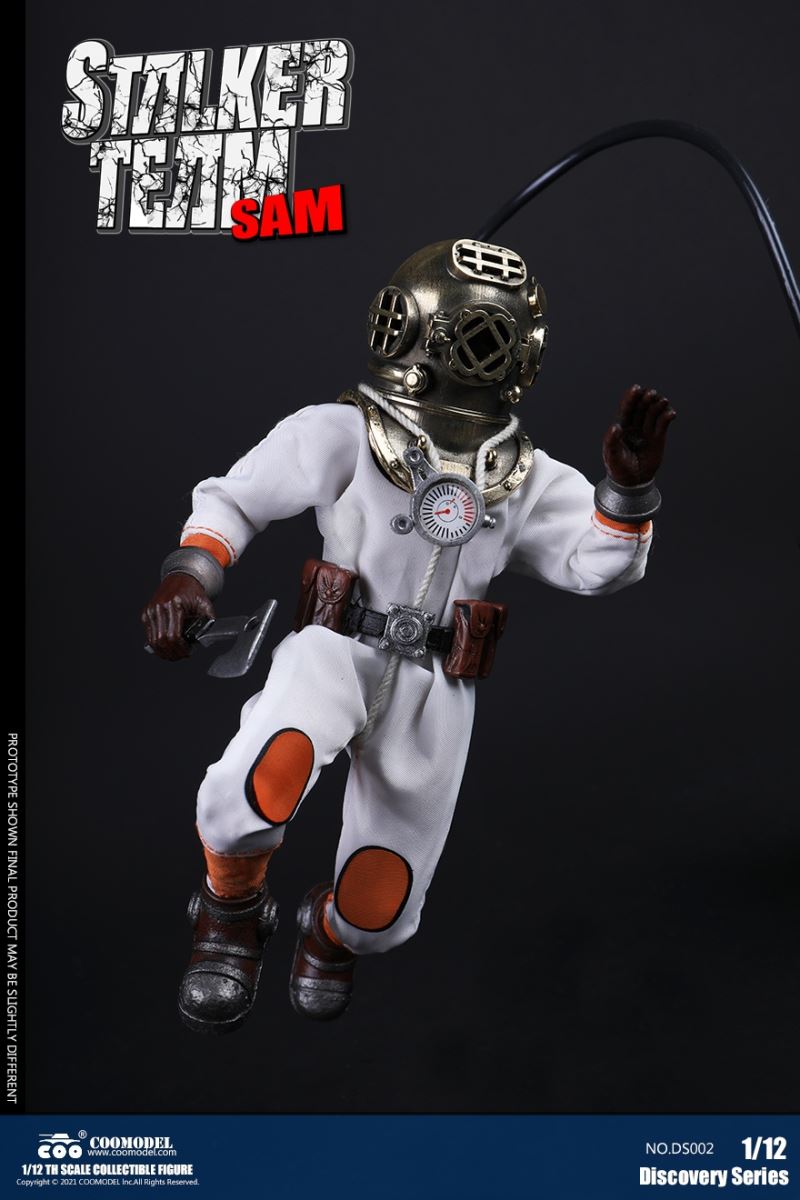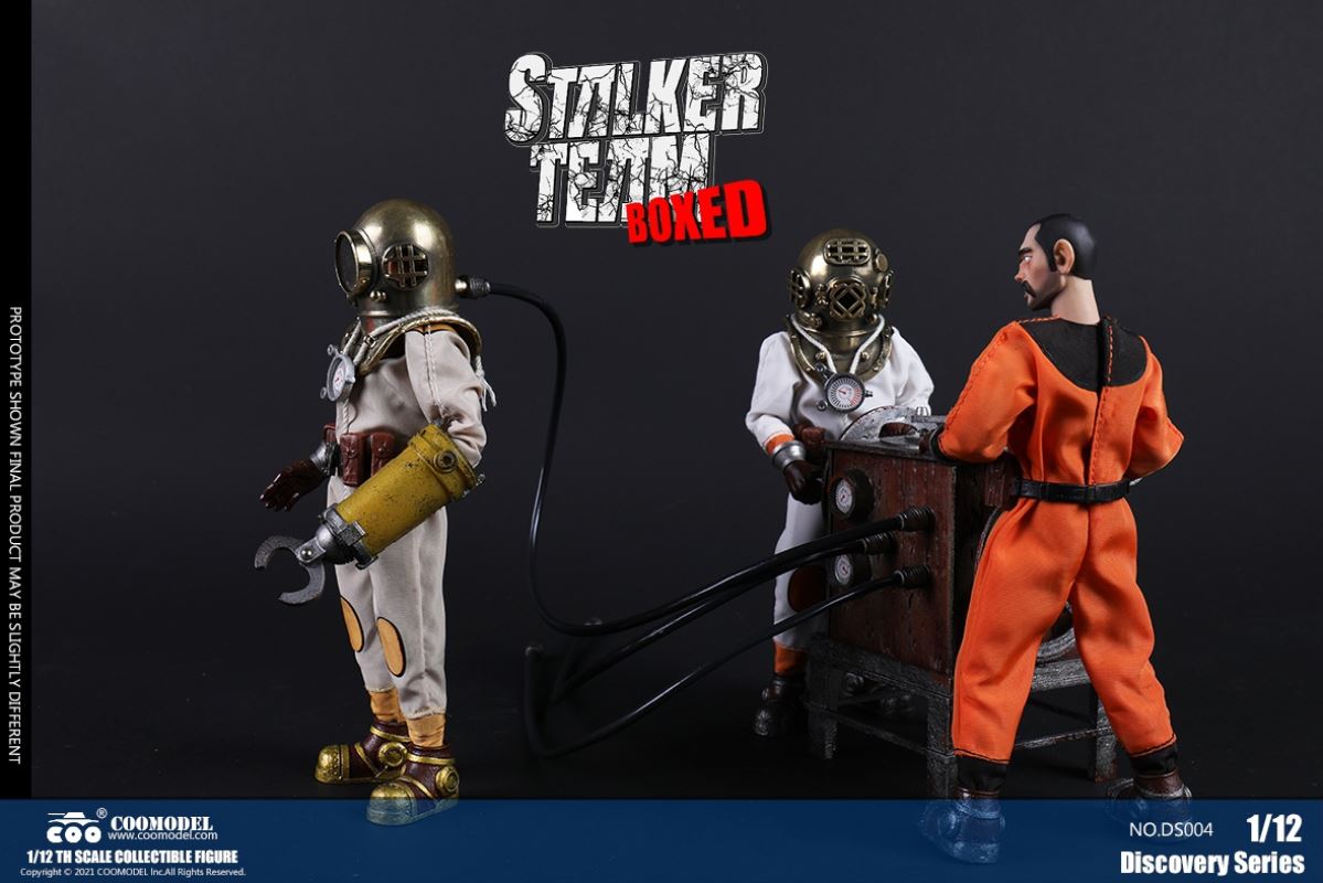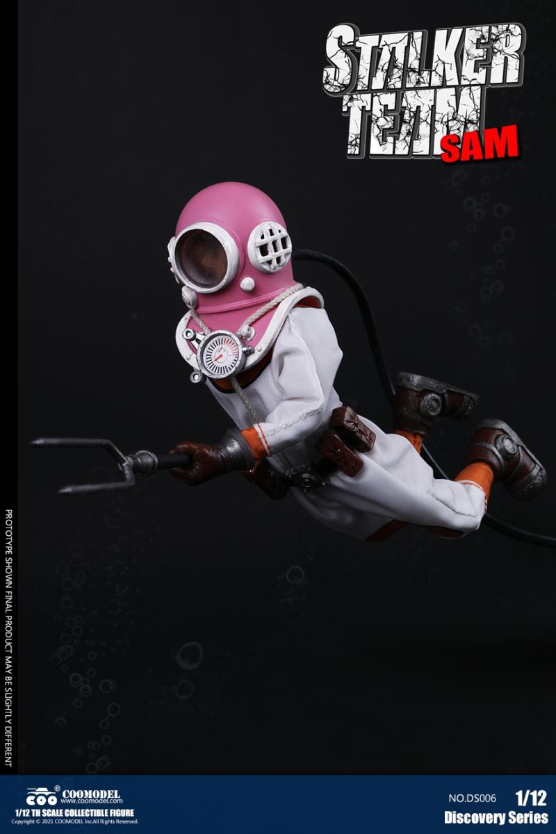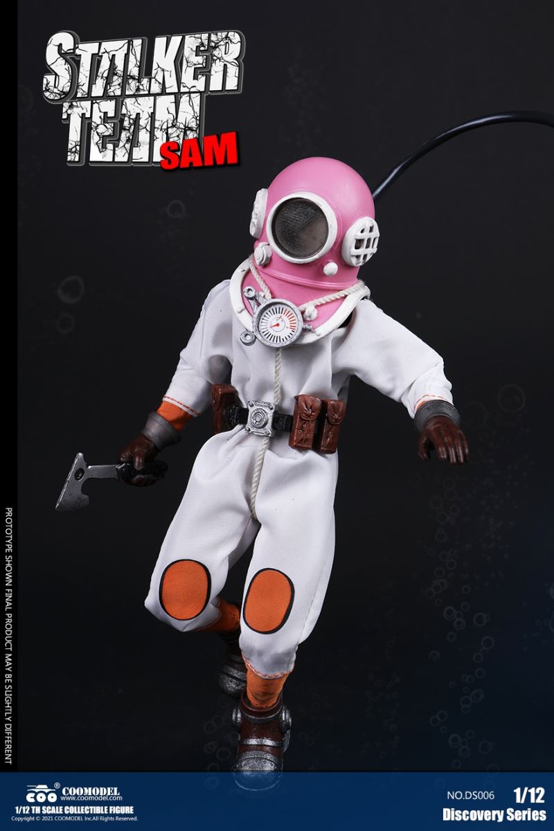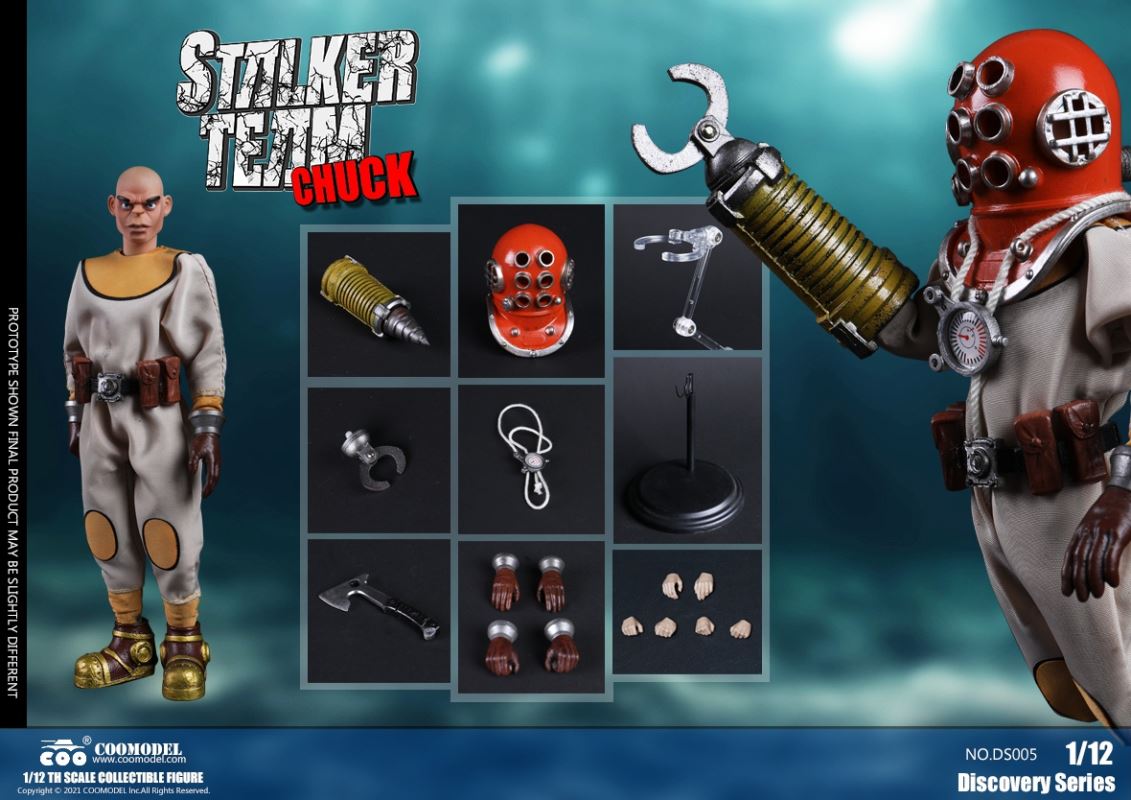 Three Set (Bronze Edition)Barcode: 6971242121874Sneak Squad Set (Bronze Edition)includes Chuck (DS001), Sam (DS002), Walson (DS003) three dolls complete Accessories,more exclusive large-scale accessories, increase team play ~Chuck configuration list: -headsculpture-1/12 movable body-6 replacement hands-4 replacement glove handsClothing:-copper diving helmet-white Yellow edge diving suit-diving storage belt-diving bootsAccessories:-mechanical arm (replaceable pliers or drill bits)-axe-pressure gauge-black doll stand-transparent movable stand------------ ---Sam configuration list: -Headsculpture-1/12 movable body-6 replacement hands-4 replacement glove handsClothing:-Copper diving helmet-White orange-rim wetsuit-Diving storage belt-Diving BootsAccessories:-Harpoon-Axe-Pressure gauge-Black doll stand-Transparent movable stand---------------Wolson configuration list:-Headsculpture-1/12 movable body-6 replacement hands-4 Only replace gloved handsClothing:-Bronze diving helmet-Orange and black-rimmed diving suit-Diving storage belt-Diving bootsAccessories:-Cigar-Speargun-Axe-Pressure gauge-Black doll stand-Transparent movable stand--- ------------Theset unique: -Underwateroxygen circulation device-Helmet connection tube 3COOMODEL 1/12 DS004 DISCOVERY SERIES-STALKER TEAM SET (COPPER VERSION)BARCODE: 6971242121874The Team Set ( Copper Ver.) combines of all figures and accessories of Chuck (DS001), Sam (DS002) and Walson (DS003), with a special part for team up!Chuck specially features:-One (1) head sculpture-One (1) 1/12th scale super action body-Six (6) pieces of interchangeable palms-Four (4) pieces of interchangeable gloved palmsCostumes: -One(1) copper-made diving helmet- One (. 1) White and Yellow Diving SUIT- One (. 1) Diving Belt with pockets- One (. 1) pair of Diving ShoesAccessories:- One (. 1) Machine ARM (with Plier and Driller)- One (. 1) Ax- One (1) pressure gage-One (1) black figure stand-One (1) clear action stand----------Sam special features:-One(1) head sculpture-One (1) 1/ 12th scale super action body-Six (6) pieces of interchangeable palms -Four (4) pieces of interchangeable gloved palmsCostumes: -One(1) copper-made diving helmet-One (1) white and orange diving suit-One (1) diving belt with pockets -One(1) pair of diving shoesAccessories:-One (1) fishgig-One (1) axe-One (1) pressure gage-One (1) black figure stand-One (1) clear action stand---- ------Walson specially features:-One(1) head sculpture-One (1) 1/12th scale super action body-Six (6) pieces of interchangeable palms-Four (4) pieces of interchangeable gloved palmsCostumes:-One (1) copper-made diving helmet-One (1) orange and black diving suit-One (1) diving belt with pockets-One (1) pair of diving shoesAccessories:-One (1) cigar-One (1 ) fishing gun-One (1) axe-One (1) pressure gage-One (1) black figure stand-One (1) clear action stand-----------Team Set Special:-One ( 1) Oxygen Cycling Device-One (2) pipe for helmets==================COOMODEL 1/12 DS005 Discovery-Sneak Team . Chuck (Color Version)Barcode: 6971242121881Configuration List :-HeadSculpture-1/12 Movable Body-6 Replacement Hands-4 Replacement Glove HandsClothing:- diving helmet orange- yellow edge wetsuit white- diving belt housing- diving bootsAccessories:- mechanical arm (or alternatively the drill pliers)- ax- gauge- black doll stand- transparent movable fenceCOOMODEL 1/12 DS005 DISCOVERY SERIES -STALKER TEAM-CHUCK (COLORED VERSION)BARCODE: 6971242121881The 1/12th scale Chuck Collectible Figure specially features :-One(1) head sculpture-One (1) 1/12th scale super action body-Six (6) pieces of interchangeable palms-Four (4) pieces of interchangeable gloved palmsCostumes:-One(1) orange diving helmet-One (1) white and yellow diving suit-One (1) diving belt with pockets-One (1) pair of diving shoesAccessories:-One (1) machine arm (with plier and driller)-One(1) axe-One (1) pressure gage-One (1) black figure stand-One (1) clear action stand==================COOMODEL 1/12 DS006 Discovery-Sneak Team. Sam (Color Version)Barcode: 6971242121898Configuration List :-HeadSculpture-1/12 Movable Body-6 Replacement Hands-4 Replacement Glove HandsClothing:-Pink diving helmet- white orange edge wetsuit- diving belt housing- diving bootsAccessories:- harpoon- ax- gauge- black doll stand- transparent movable fenceCOOMODEL 1/12 DS006 DISCOVERY SERIES - STALKER TEAM - SAM (COLORED VERSION )BARCODE: 6971242121898The 1/12th scale Sam Collectible Figure specially features :-One(1) head sculpture-One (1) 1/12th scale super action body-Six (6) pieces of interchangeable palms-Four (4) pieces of interchangeable gloved palmsCostumes:-One (1) pink diving helmet-One (1) white and orange diving suit-One (1) diving belt with pockets-One (1) pair of diving shoesAccessories:-One (1) fishgig-One (1) axe-One (1) pressure gage-One (1) black figure stand-One (1) clear action stand==================COOMODEL 1/12 DS007 Discovery-Sneak Team. Walson (Color Version)Barcode: 6971242121904Configuration List :-HeadSculpture-1/12 Movable Body-6 Replacement Hands-4 Replacement Glove HandsClothing:- blue diving helmet- black side orange diving suit- diving storage belt- diving bootsAccessories:- cigars- spear gun- ax- pressure gauge- black doll stand- transparent movable fenceCOOMODEL 1/12 DS007 DISCOVERY SERIES - STALKER TEAM -WALSON (COLORED VERSION)BARCODE: 6971242121904The 1/12th scale Walson Collectible Figure specially features:-One(1) head sculpture-One (1) 1/12th scale super action body-Six (6) pieces of interchangeable palms-Four (4) pieces of interchangeable gloved palmsCostumes:-One(1) blue diving helmet-One (1) orange and black diving suit-One (1) diving belt with pockets-One (1) pair of diving shoesAccessories:-One (1) cigar-One (1 ) fishing gun-One (1) axe-One (1) pressure gage-One (1) black figure stand-One (1) clear action stand=================COOMODEL 1/12 DS008 Discovery- Sneak Squad Three Set (color version)Barcode: 6971242121911Sneak Squad Set (color version)includes Chuck (DS005),